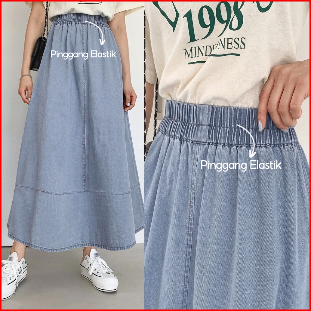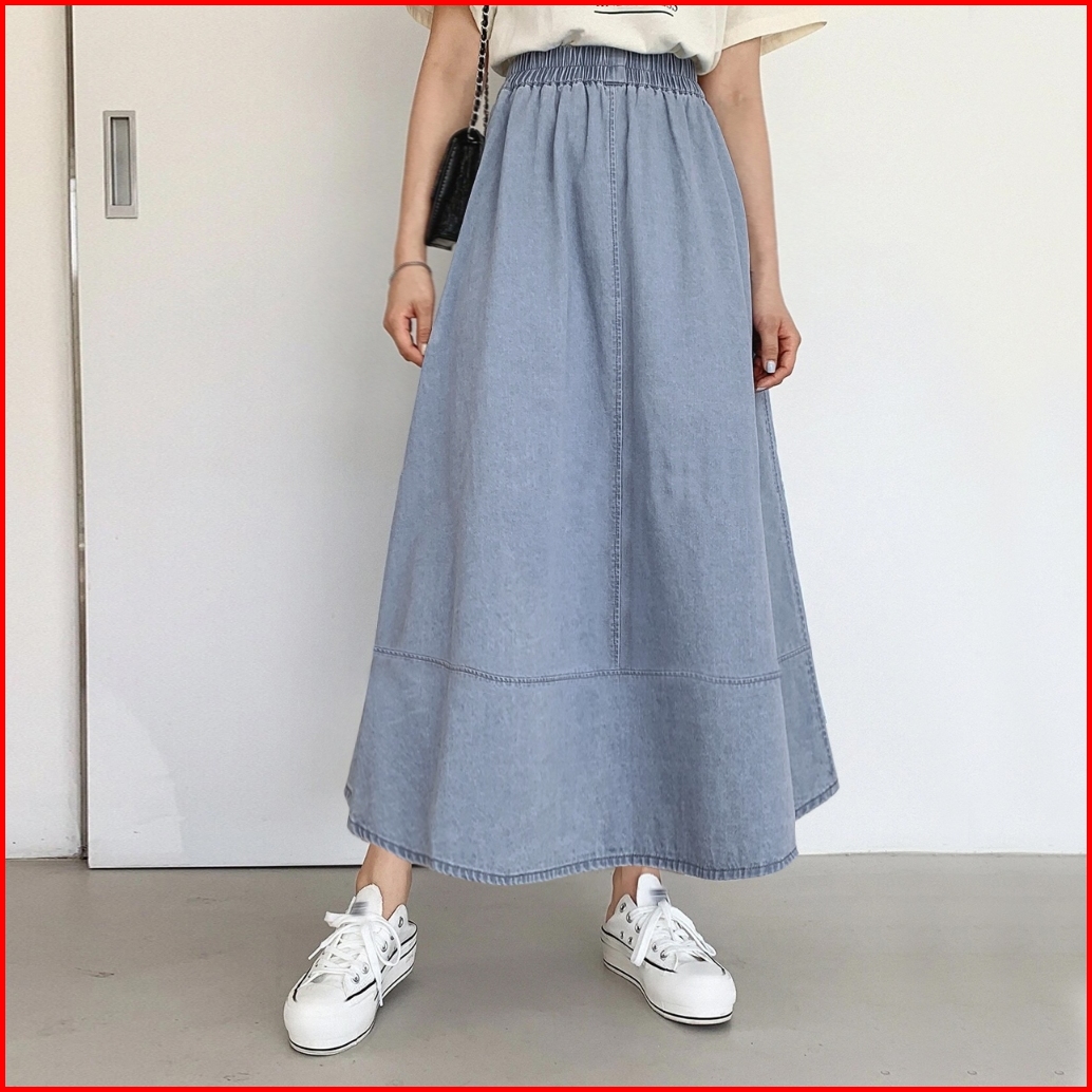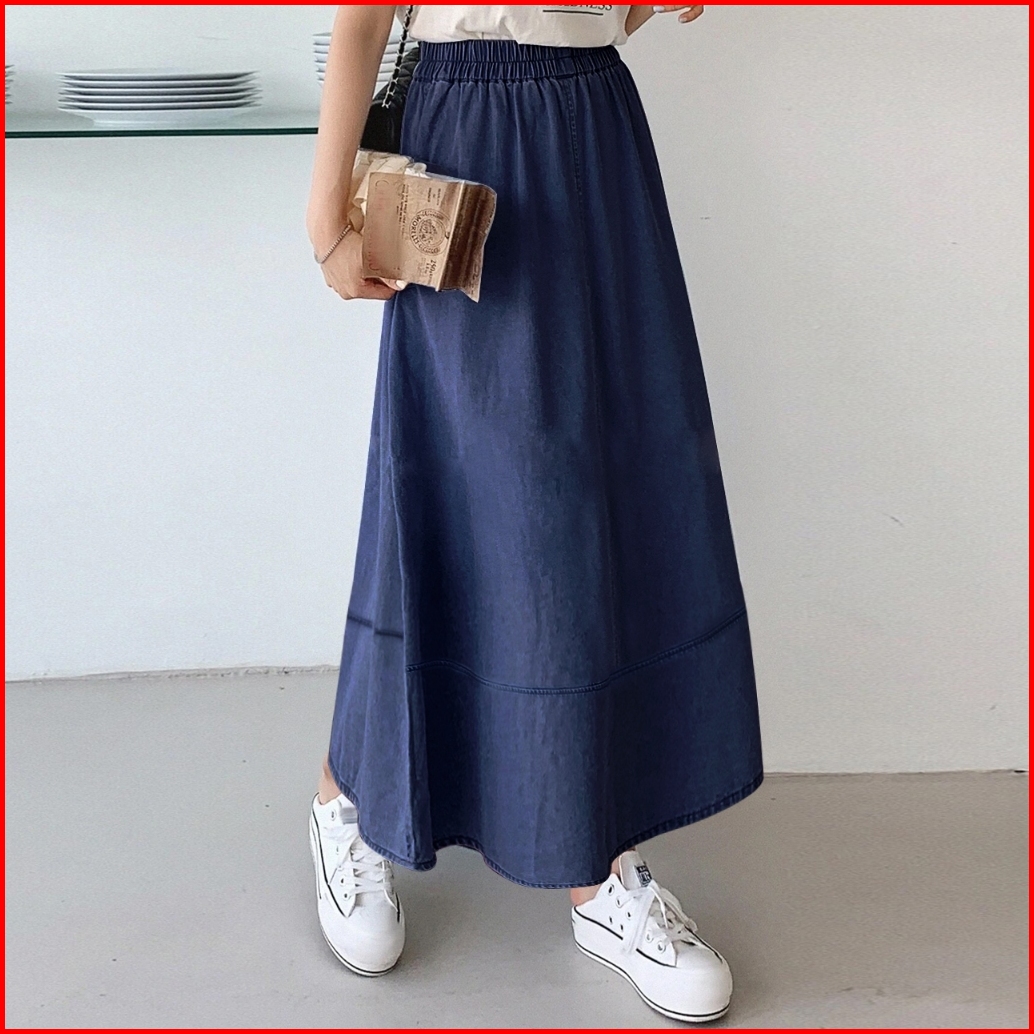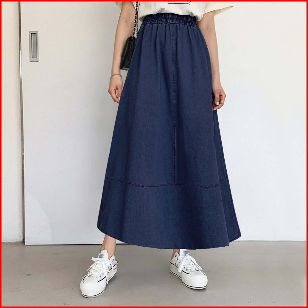 Denim Skirt Rok Wanita Summer Splicing High Waisted Loose Mid-length Elastic Waistline A-line Maxi Skirts