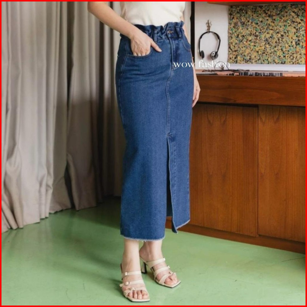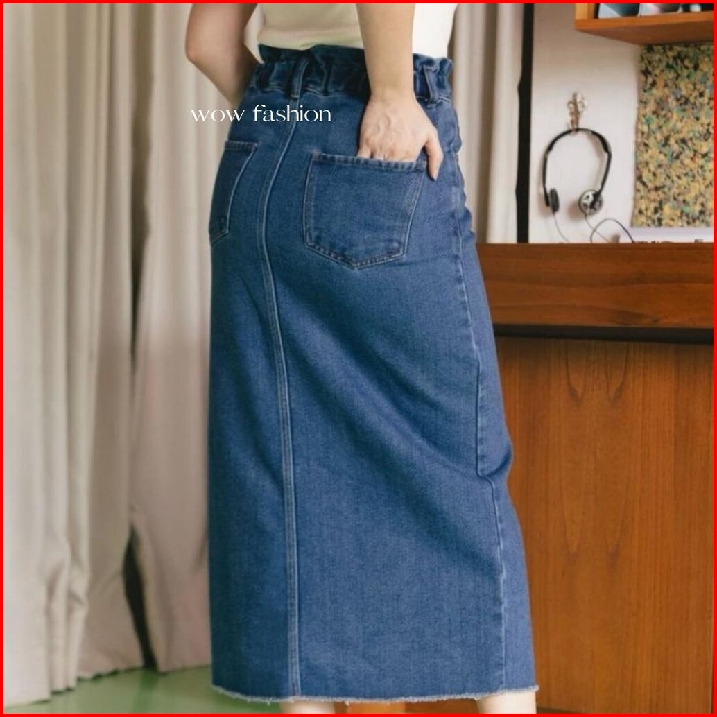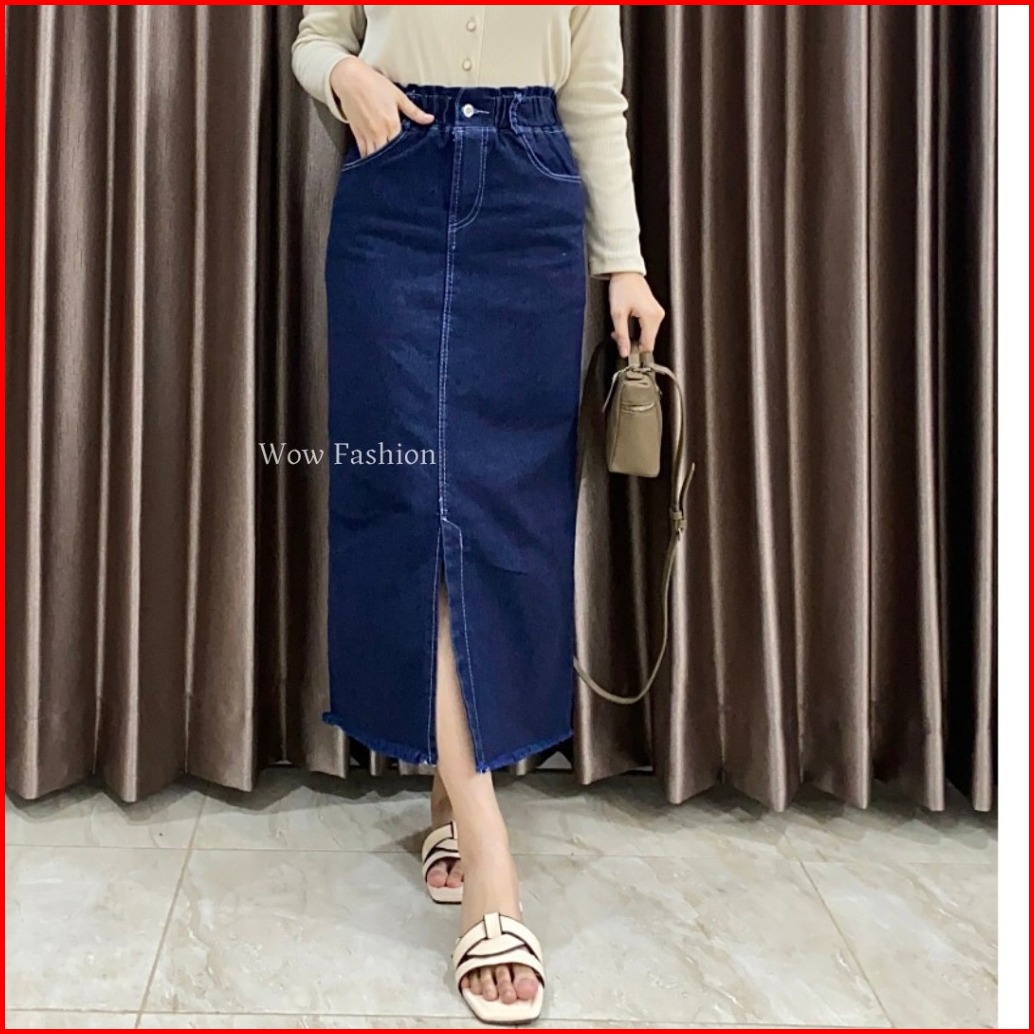 Wow-danica Rok Span Jeans Wanta Midi Skirt 7 8 Belahan Depan