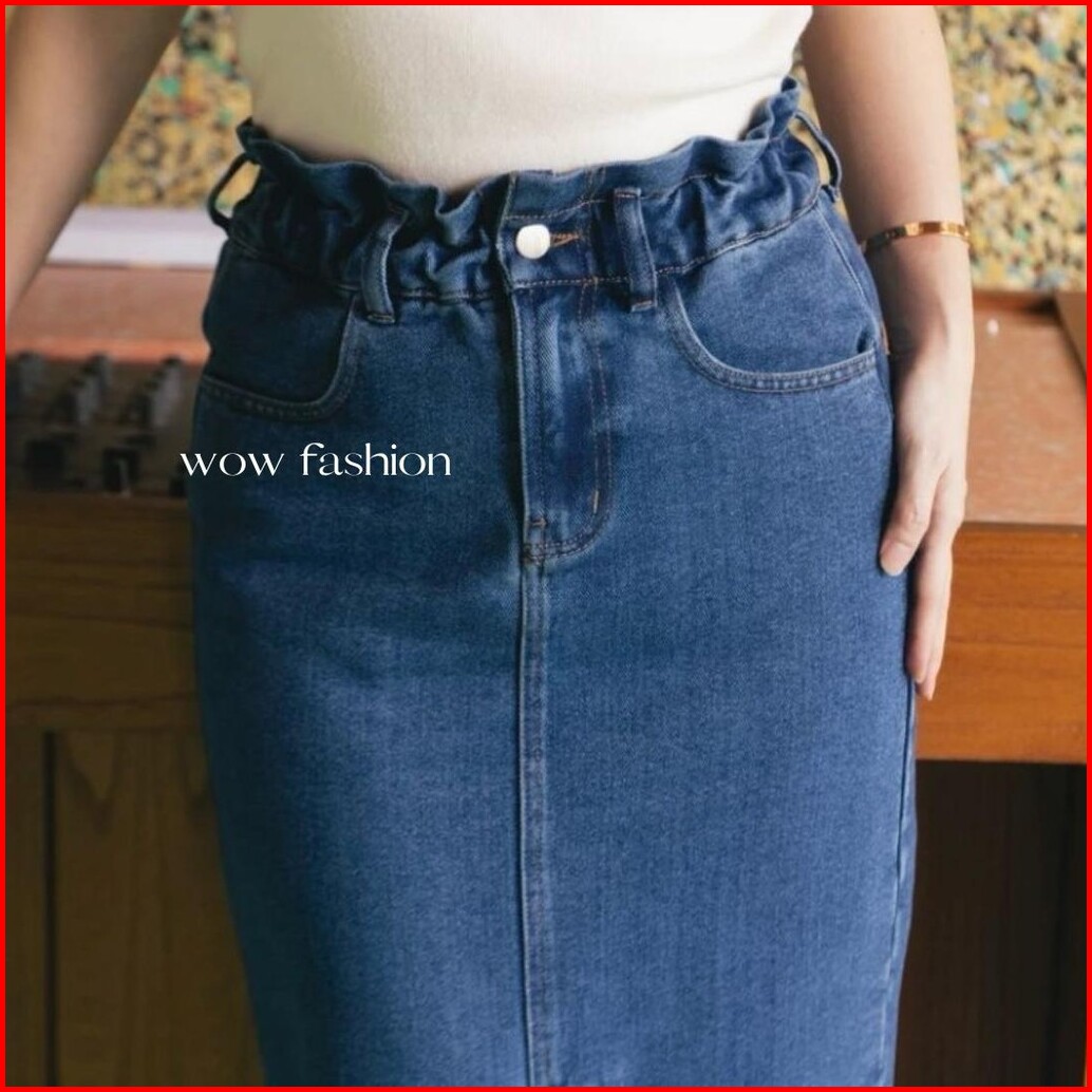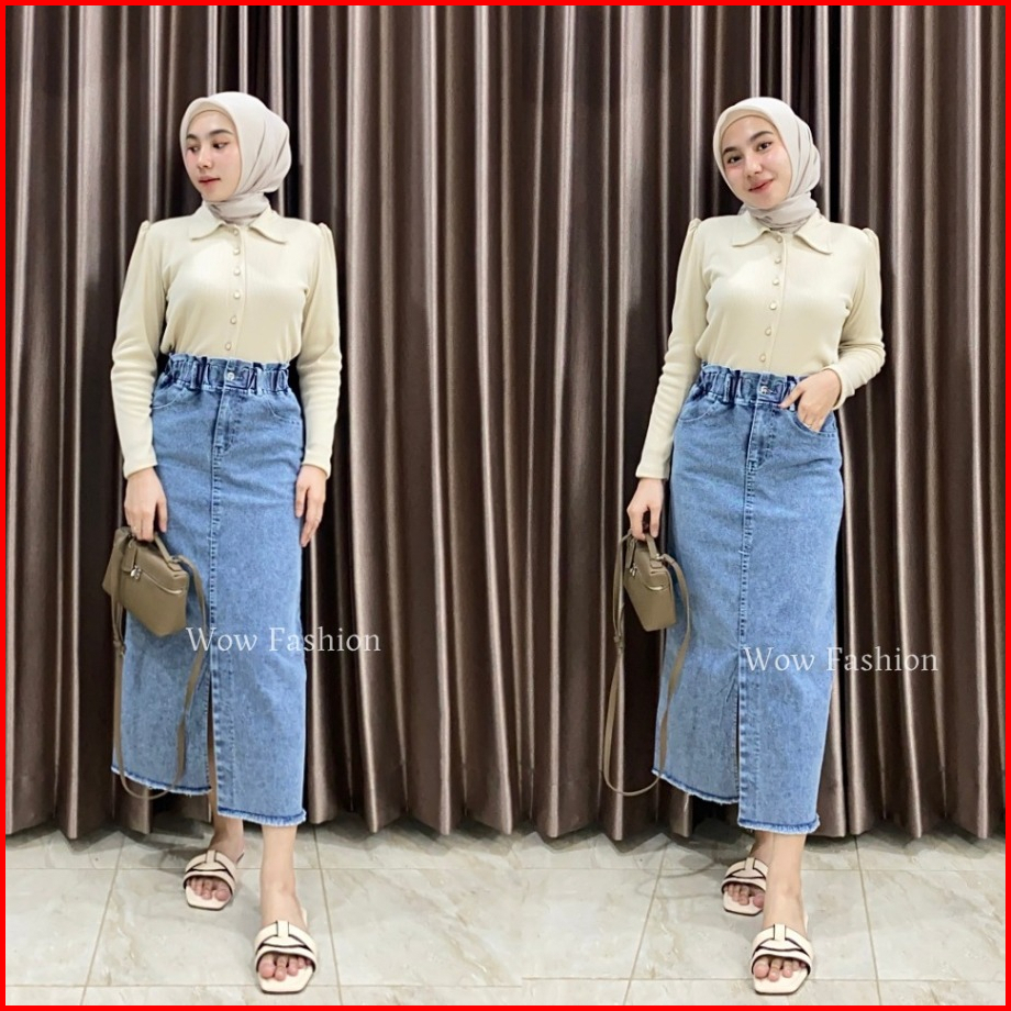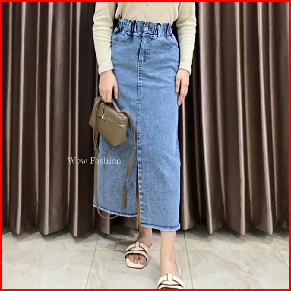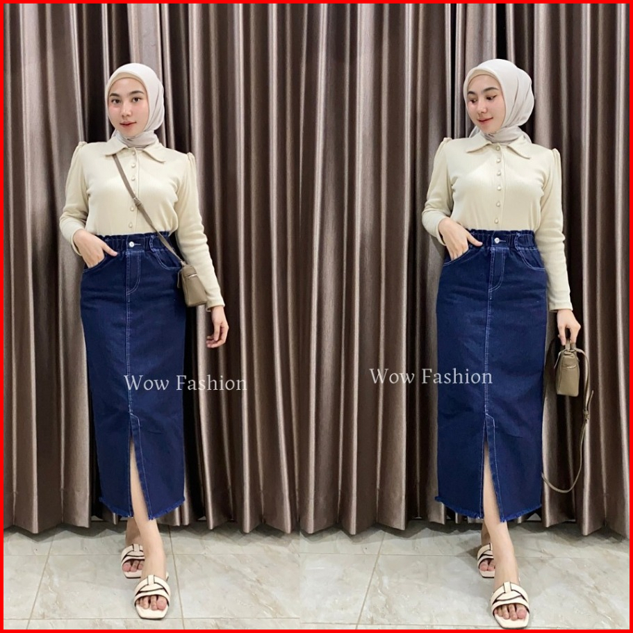 Wow-danica Rok Span Jeans Wanta Midi Skirt 7 8 Belahan Depan