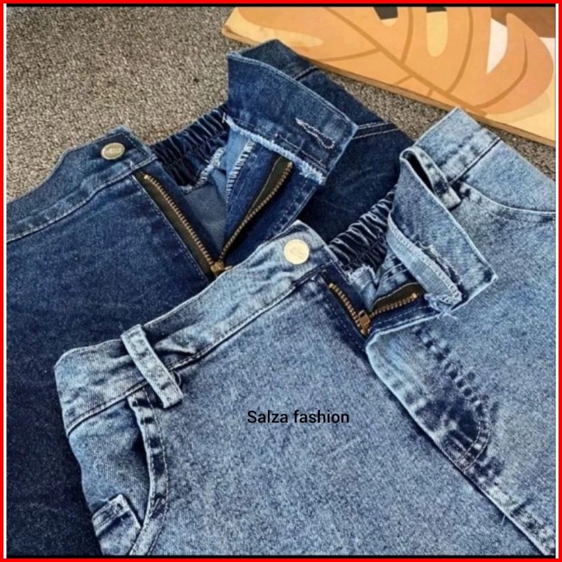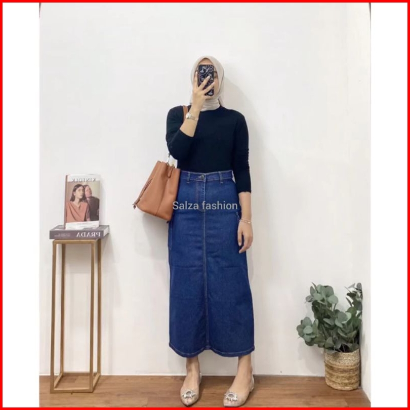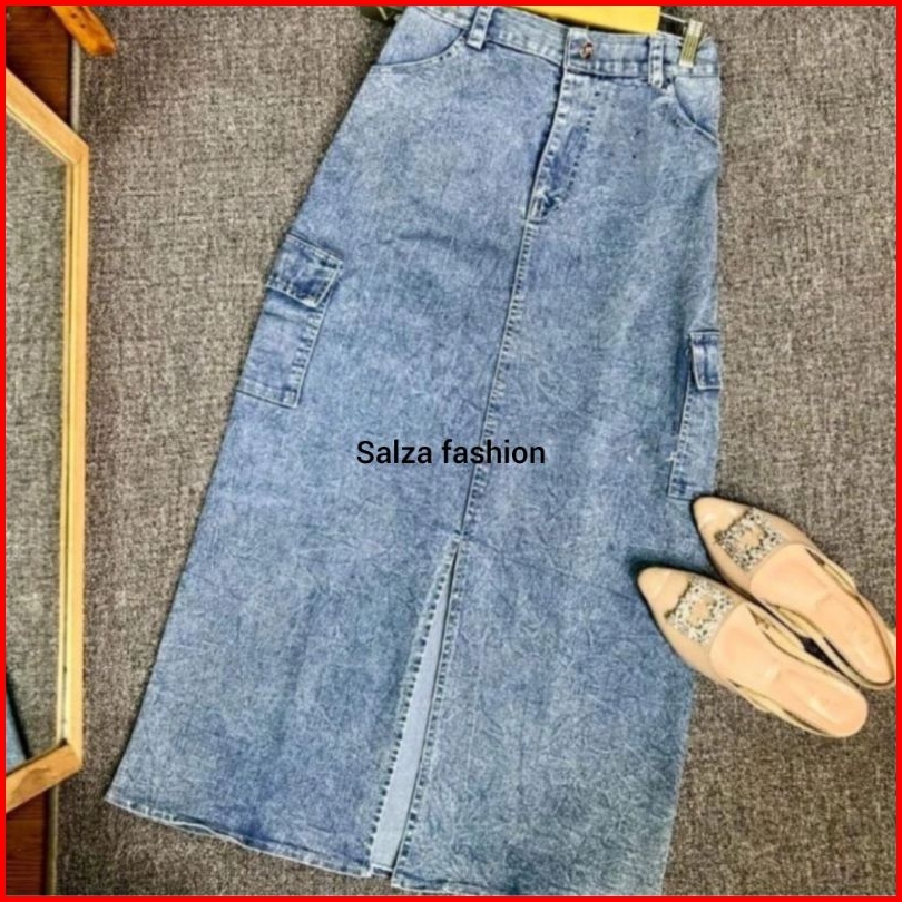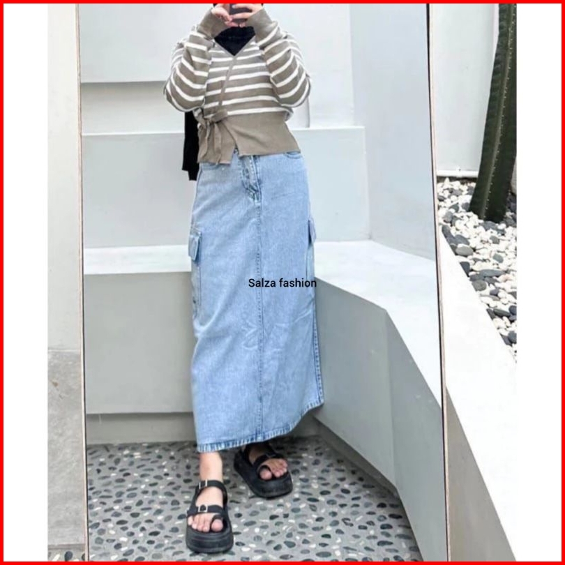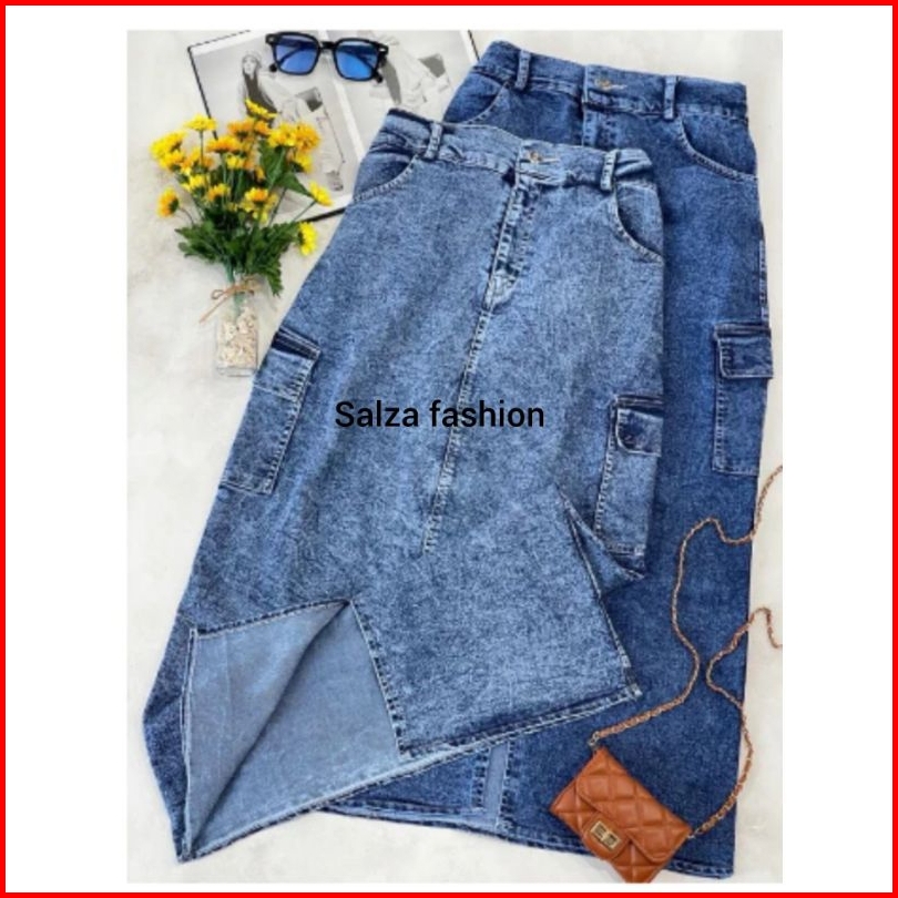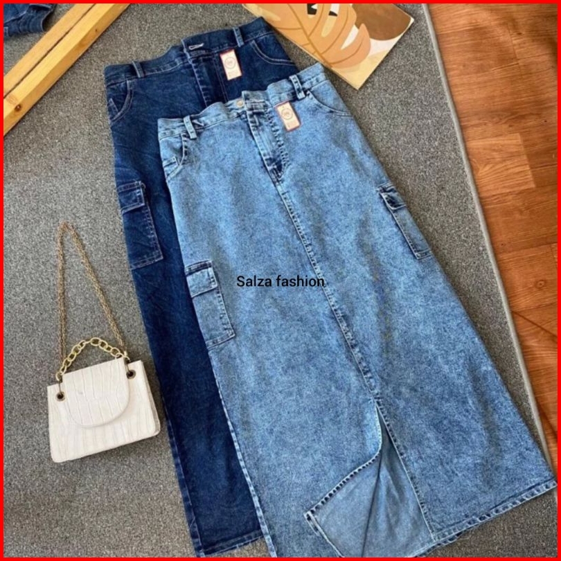 Rok Jeans Cargo Panjang Wanita Belah Tengah Bahan Streach Korean Style