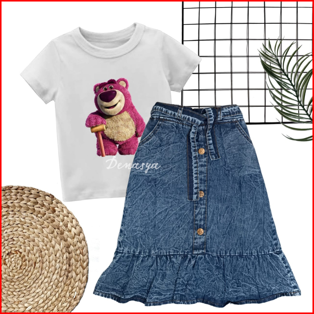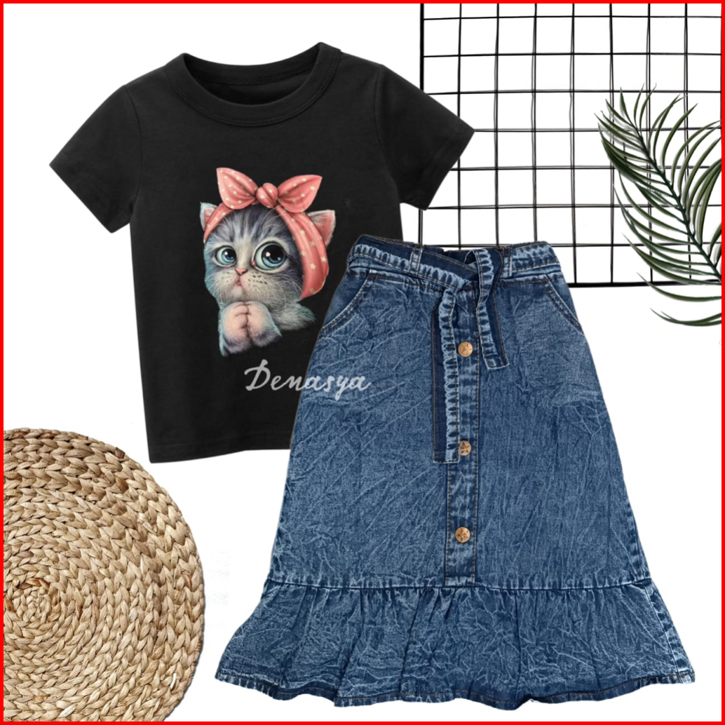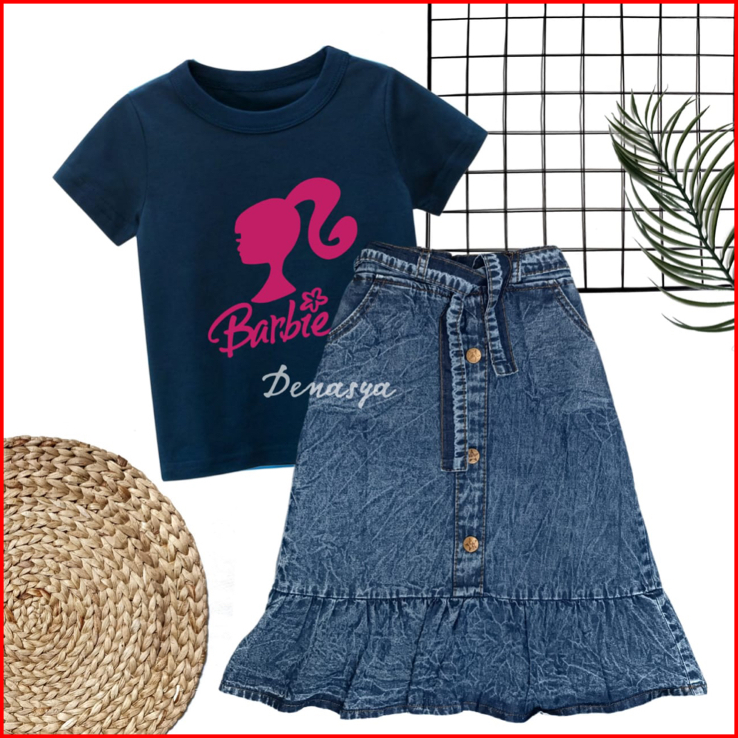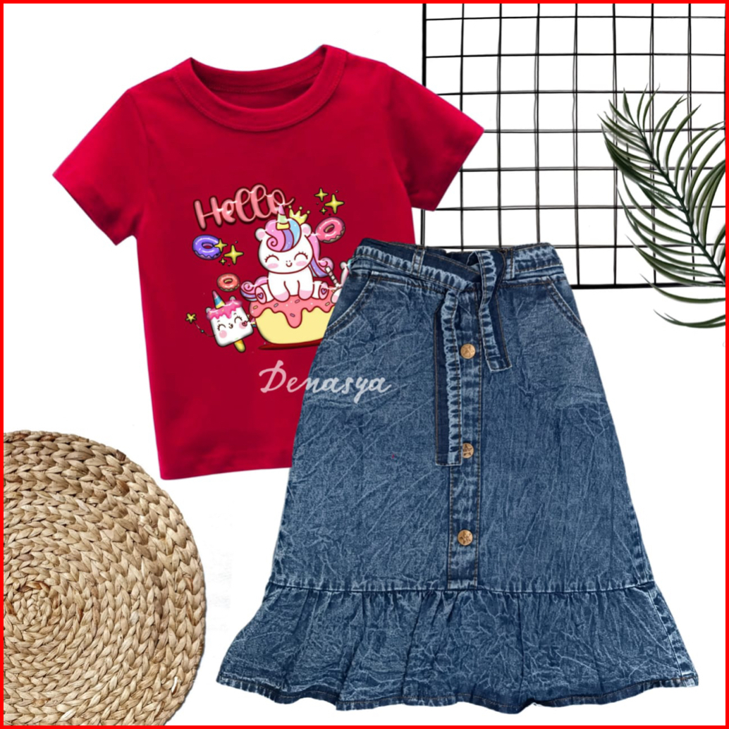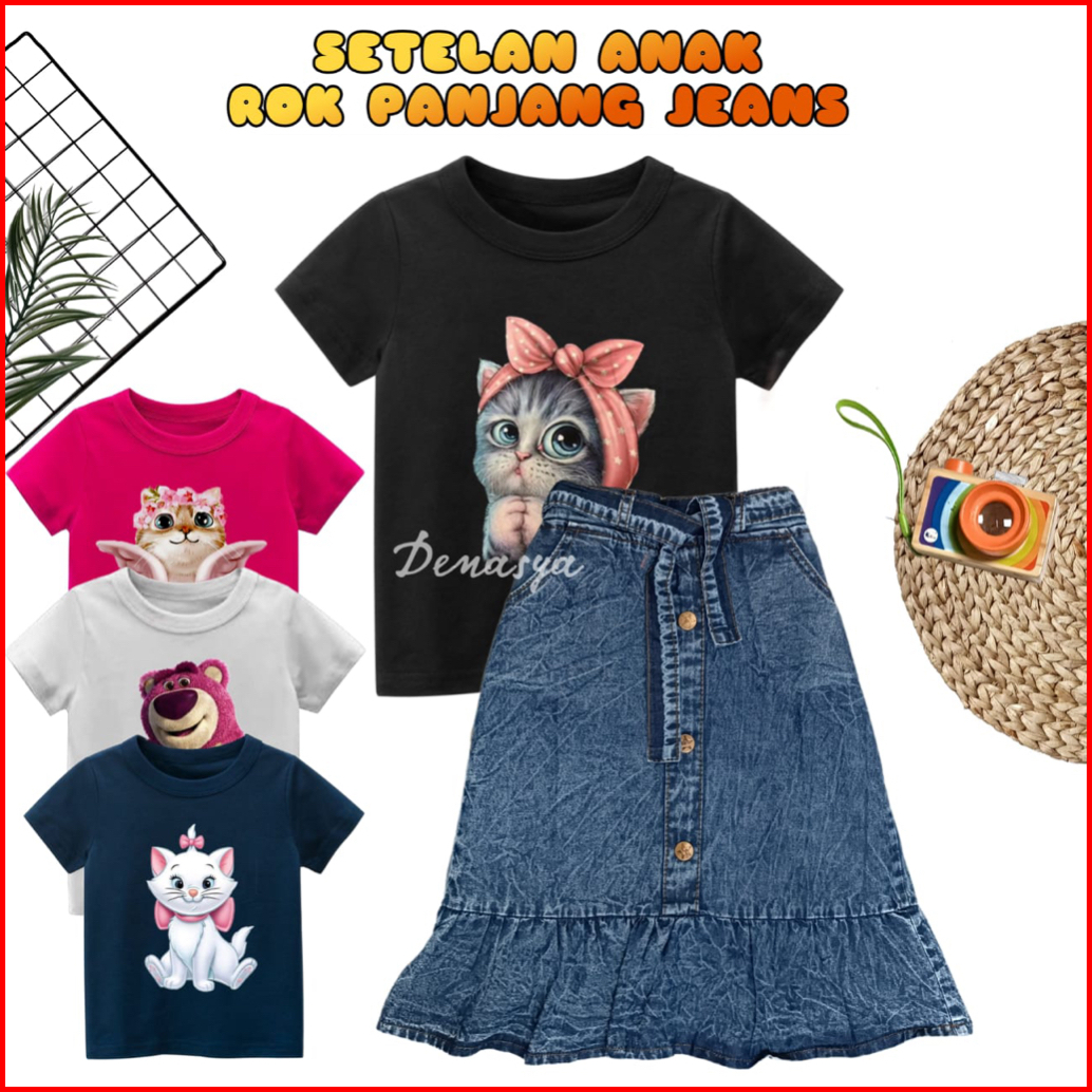 Rok Anak Perempuan Setelan Rok Panjang Jeans Anak Kaos Sablon 1-10 Tahun