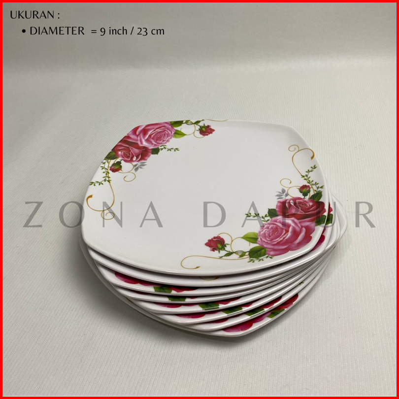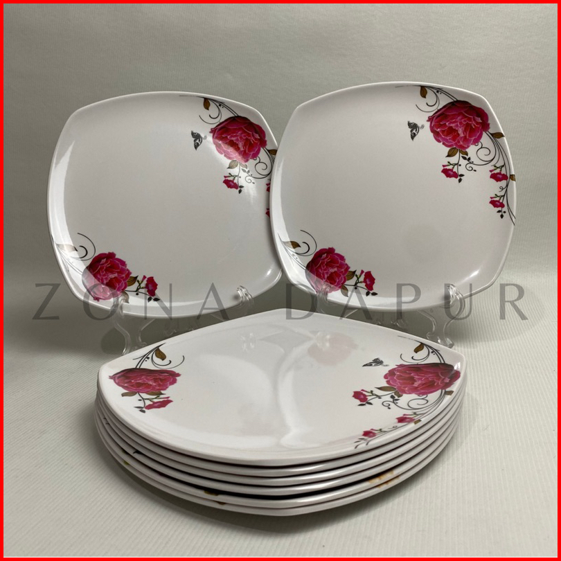 6 Pcs - Piring Makan Persegi Ceper Melamin 9 Inch Motif Bunga Singasingi - Piring Saji Melamine