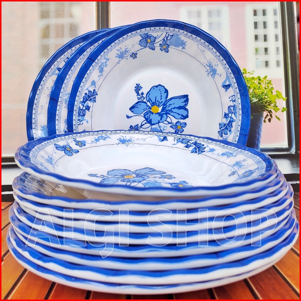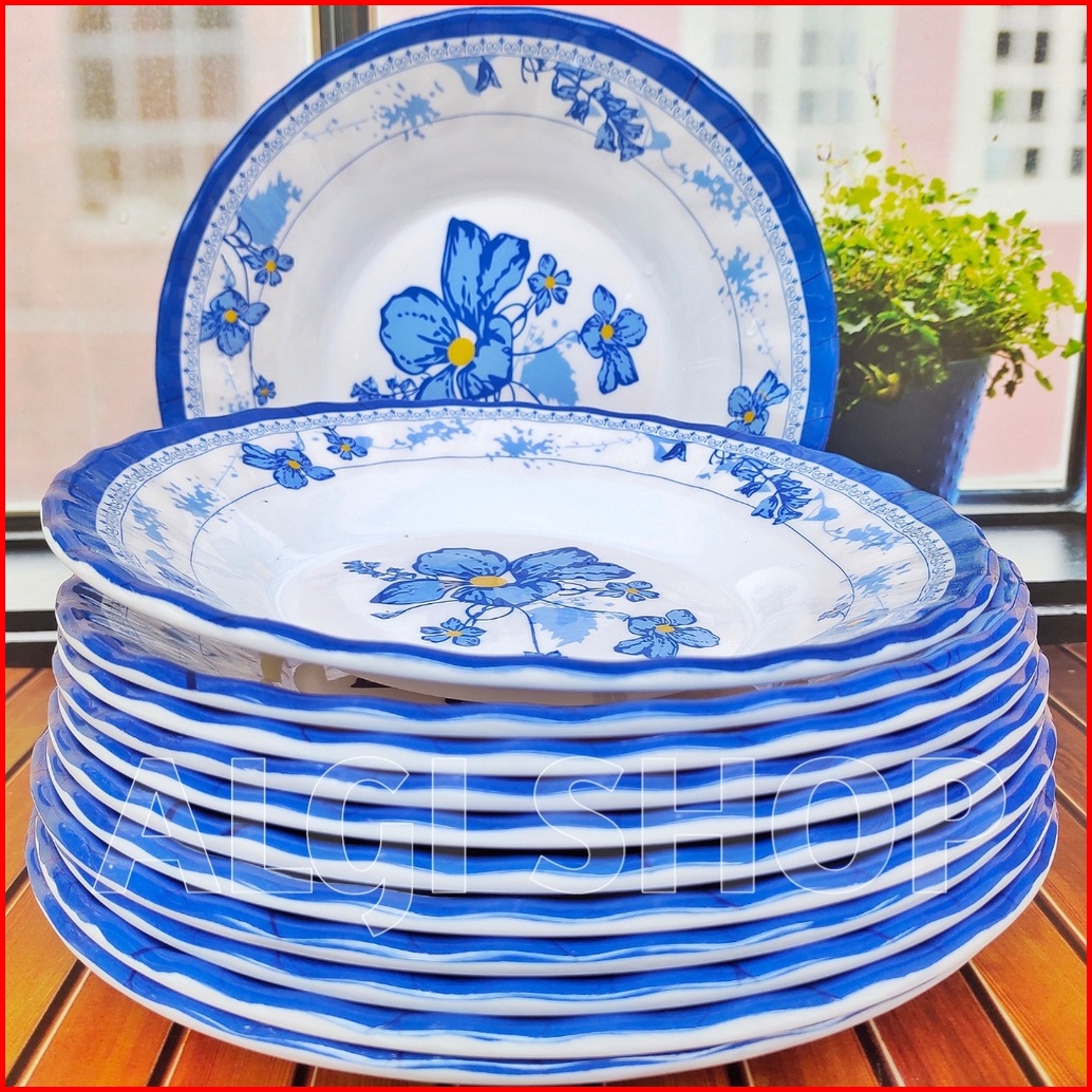 12pcs Piring Melamine Bear 21cm Motif Kembang Biru