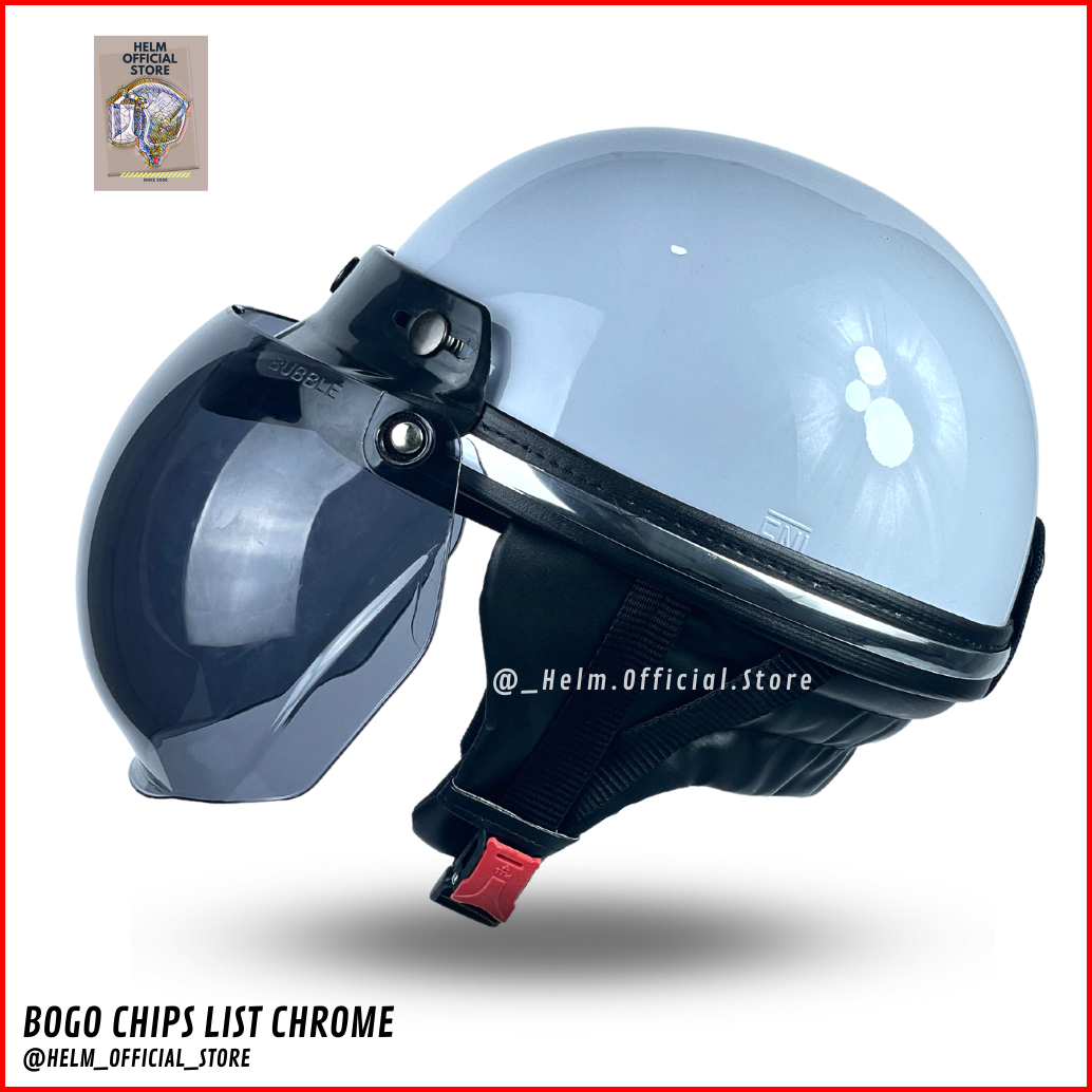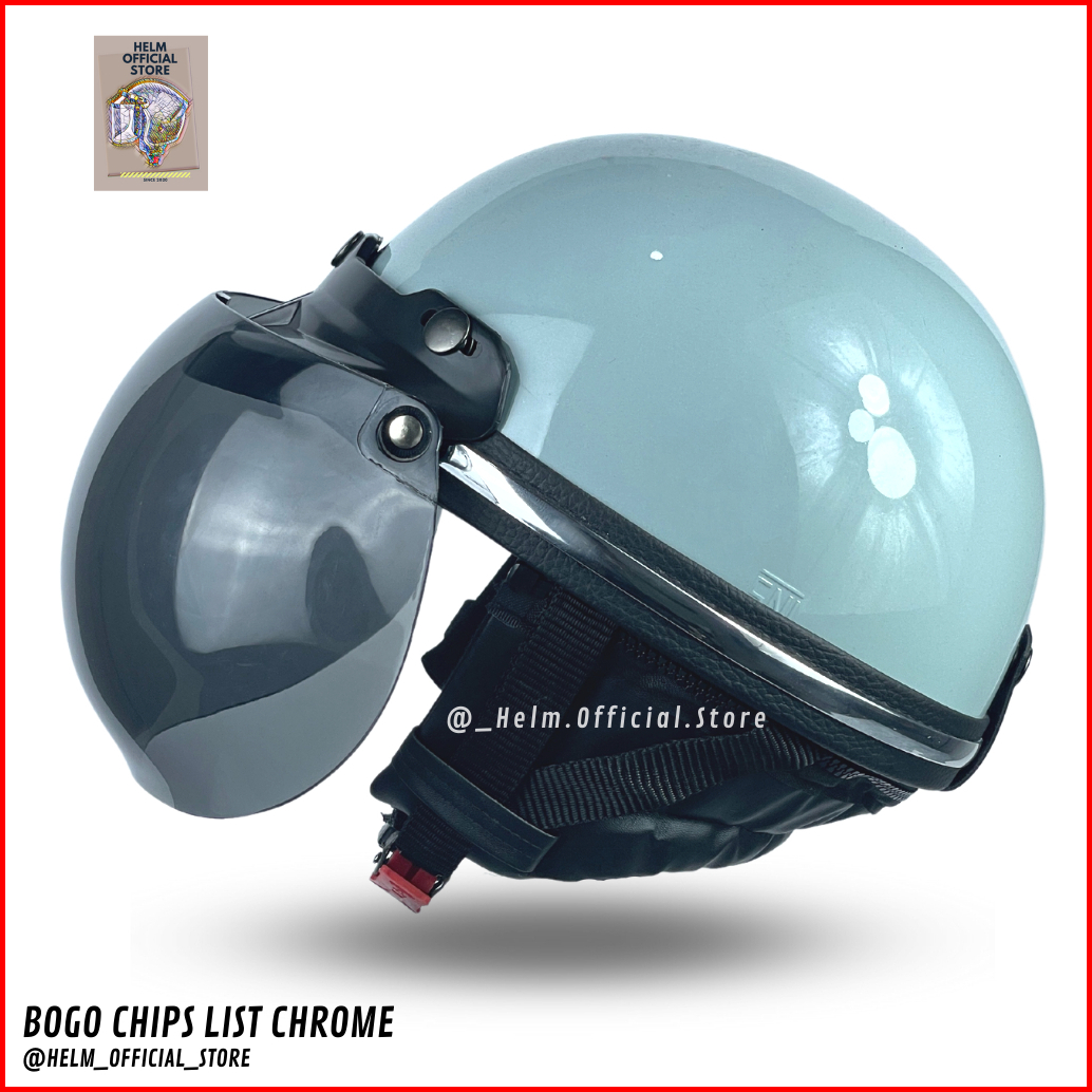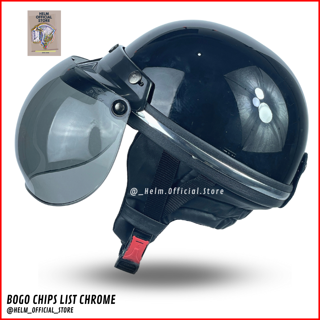 Helm Bogo Chips Dewasa Retro List Chrome Polos Kaca Cembung Hitam Bening Sni