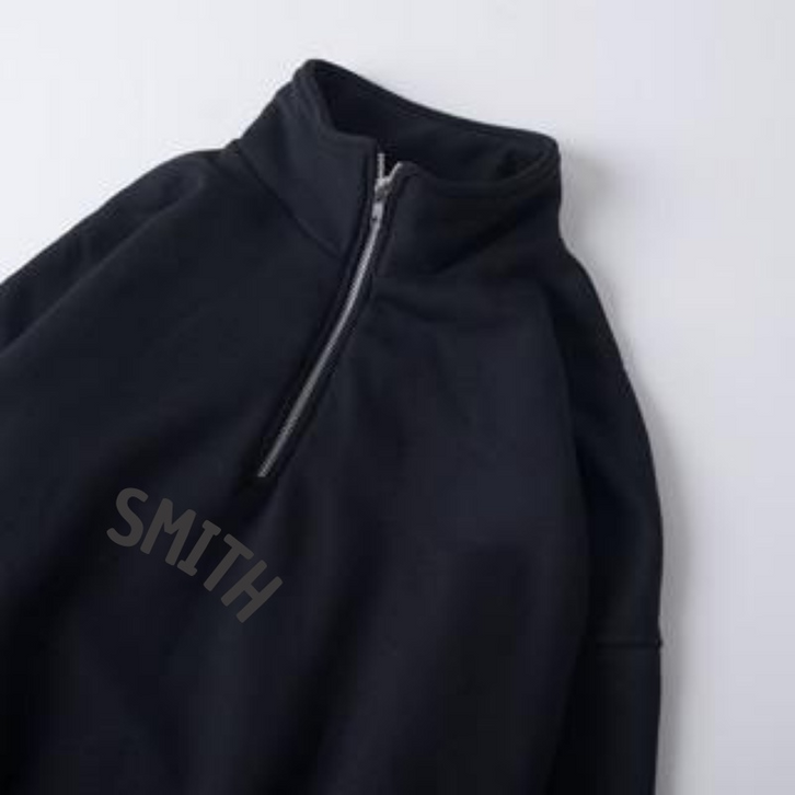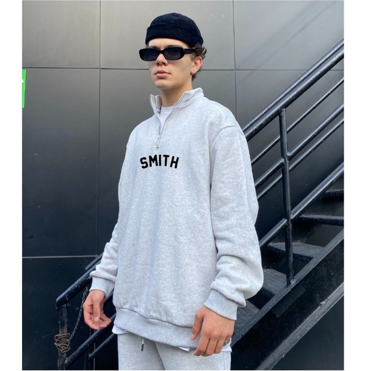 Sweater Pria Crewneck Zipper Smith Teks Hitam Sweater Berkerah Sweatshirt Cotton Fleece Tebal