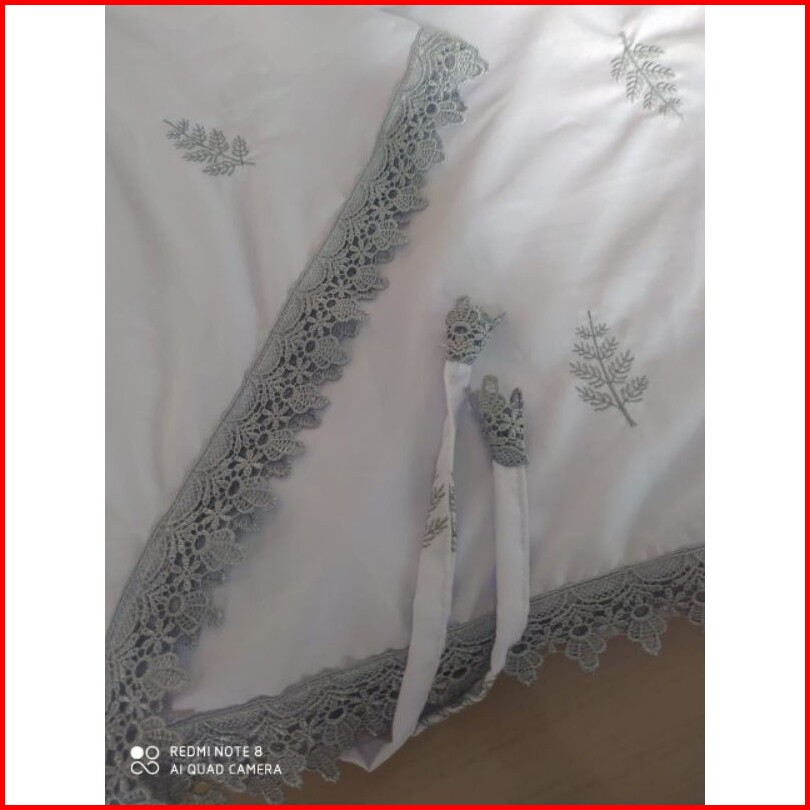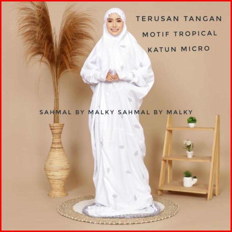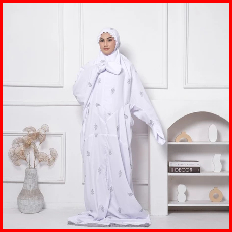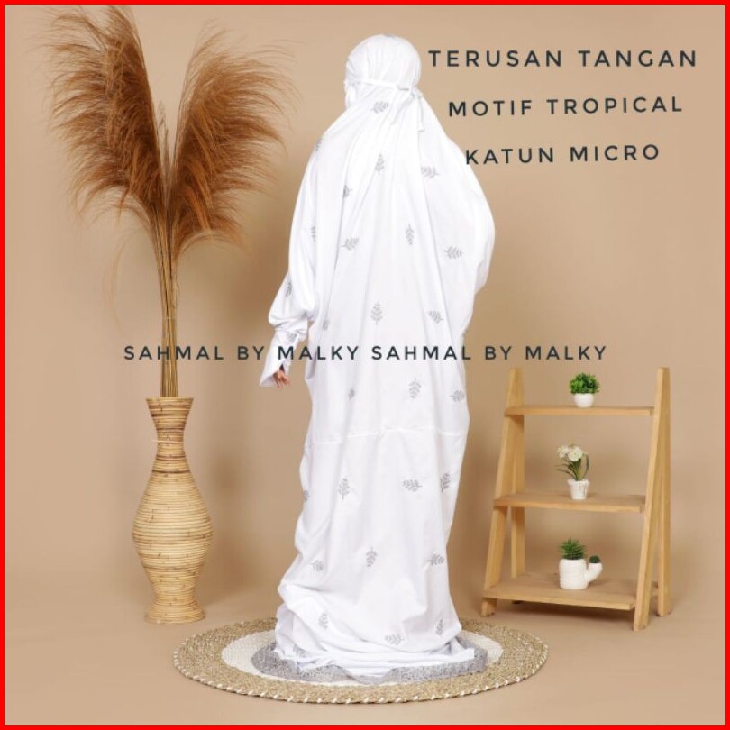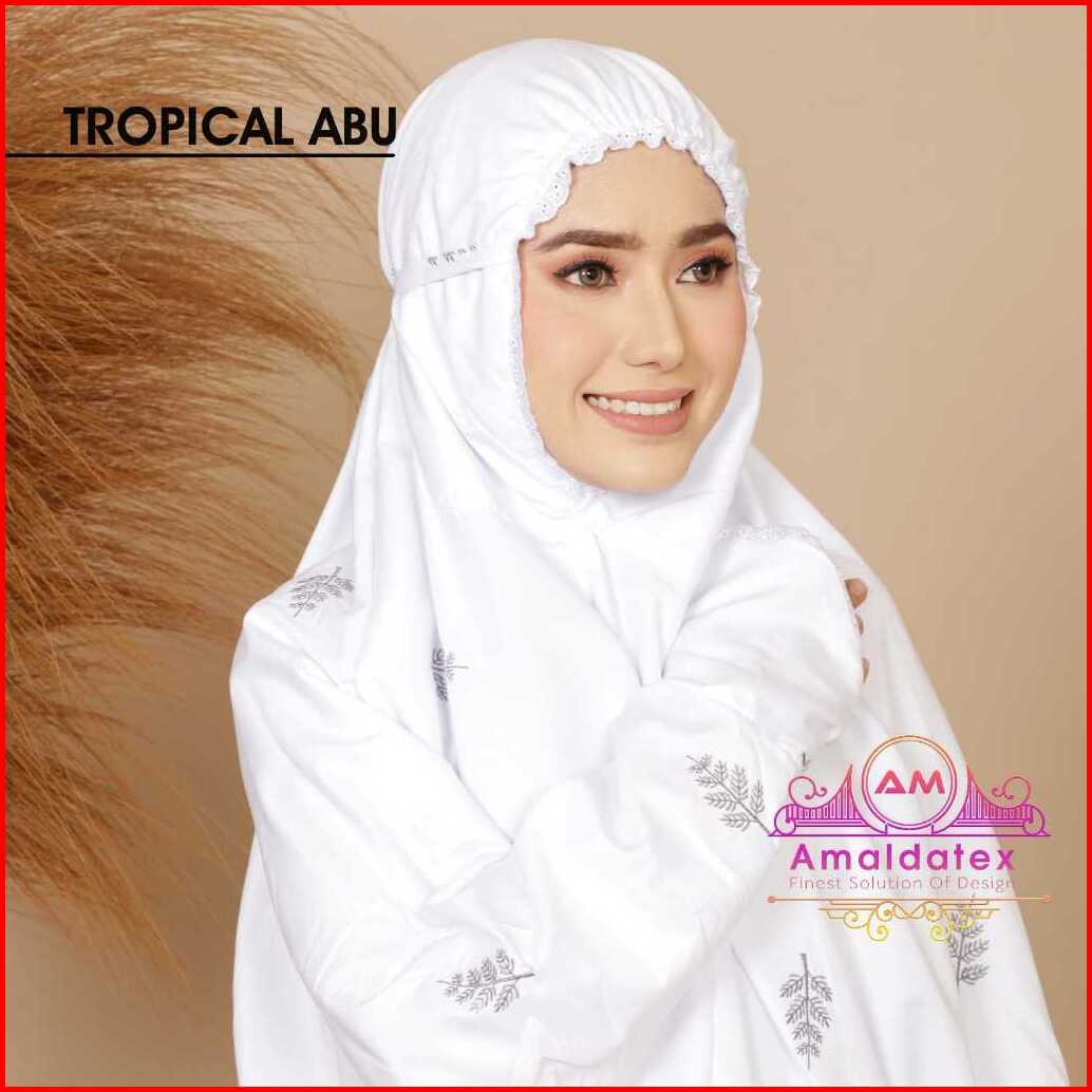Mukena Terusan Dewasa Jumbo Tropical Bordir Cemara Burkah Lajuran Katun Premium Lembut Warna Putih Abu