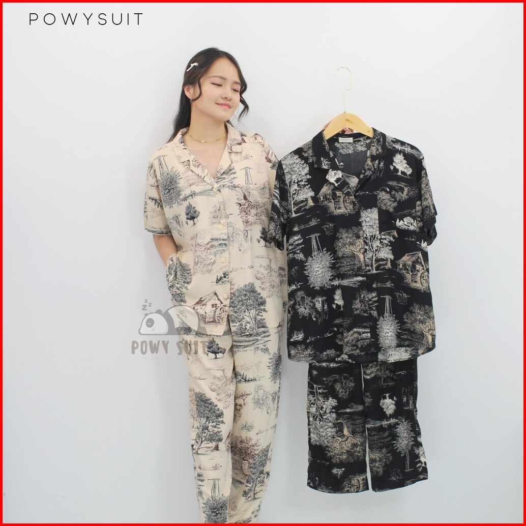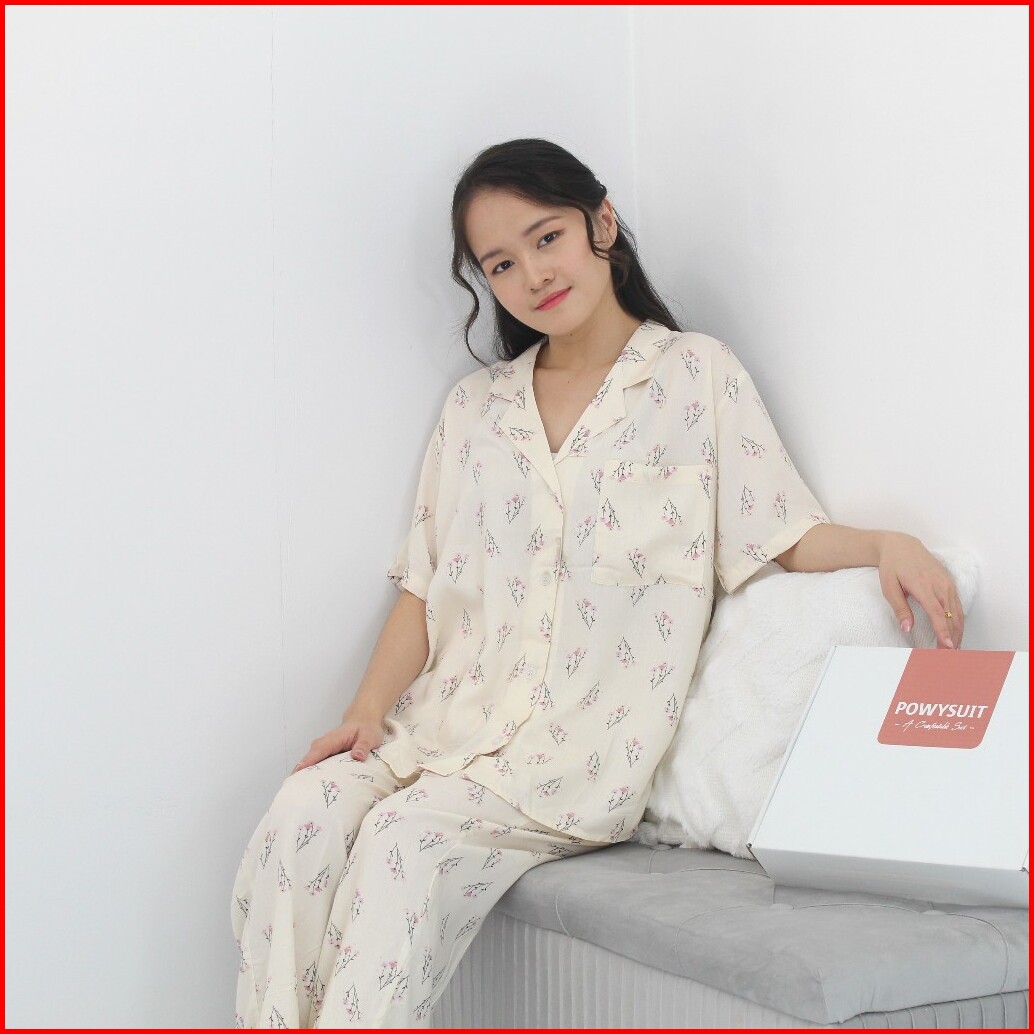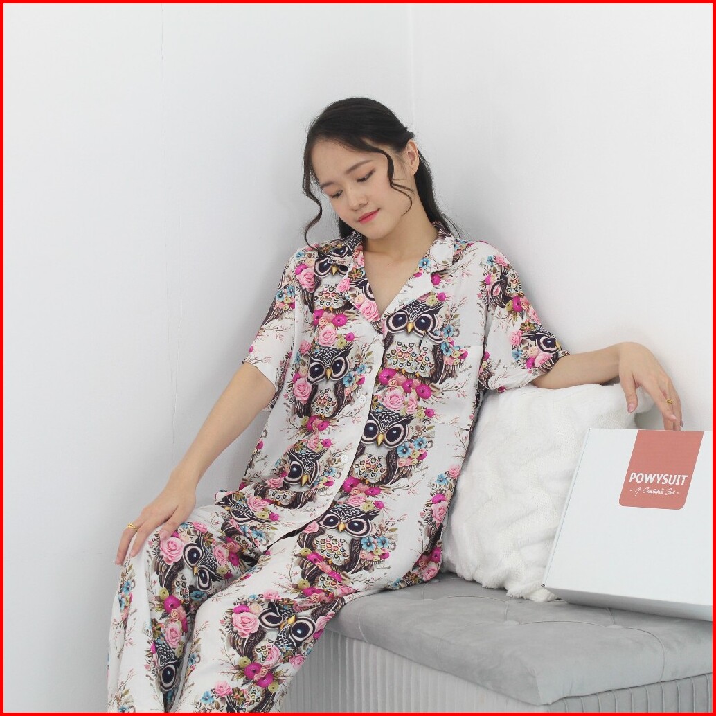 Powysuit Piyama Rayon Wanita Motif Lengan Pendek Dan Setelan Celana Panjang One Set Baju Tidur Rayon