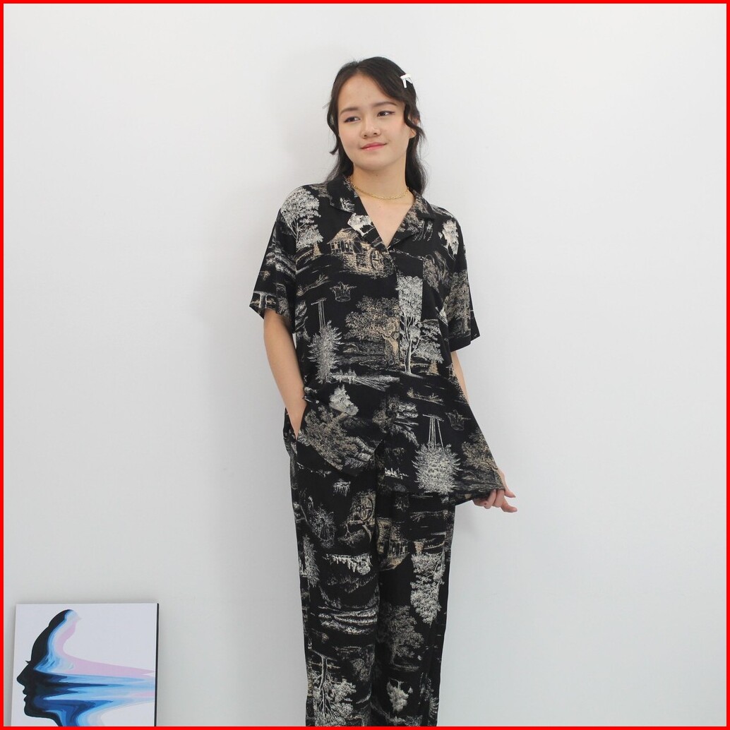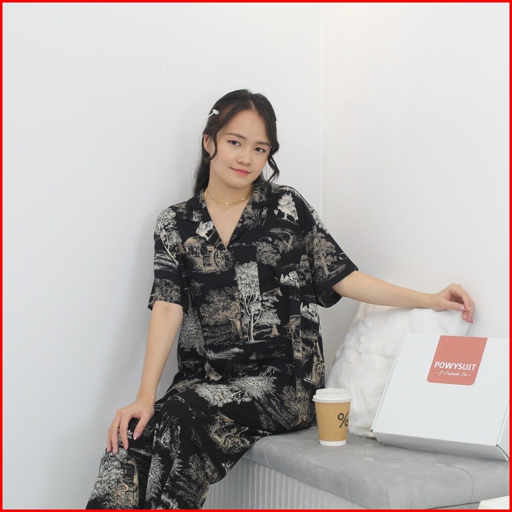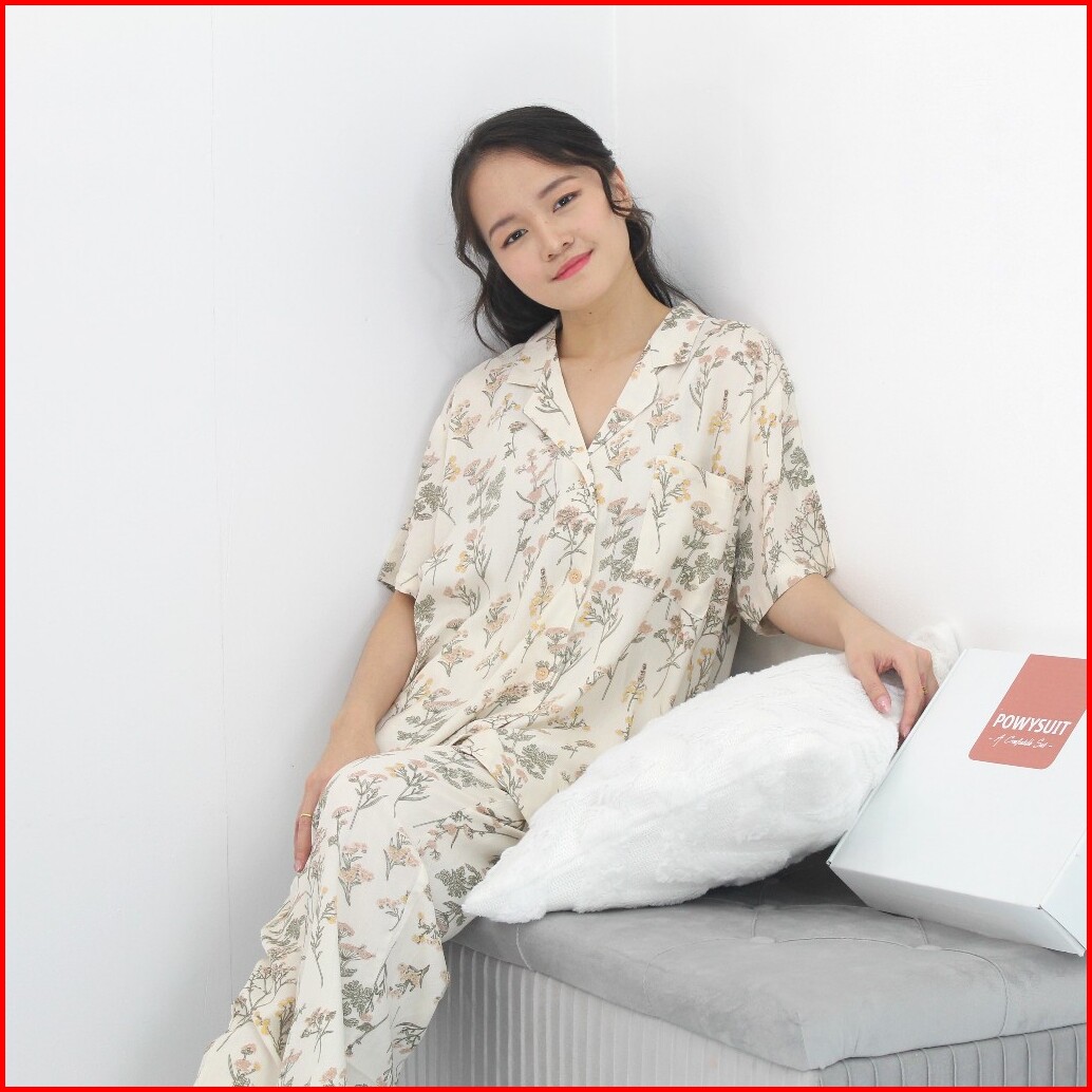 Powysuit Piyama Rayon Wanita Motif Lengan Pendek Dan Setelan Celana Panjang One Set Baju Tidur Rayon