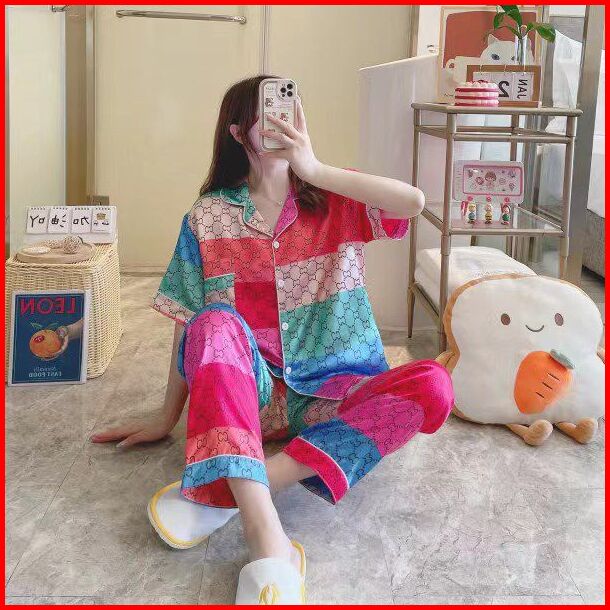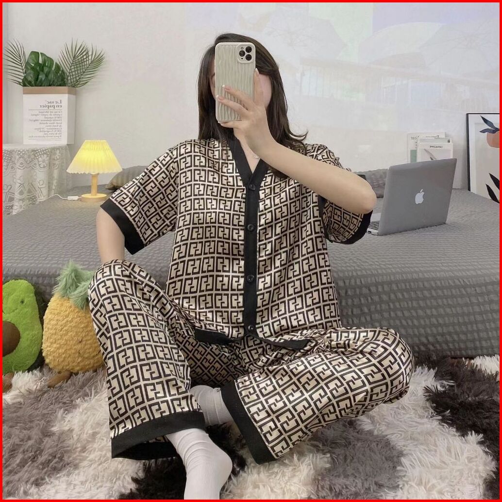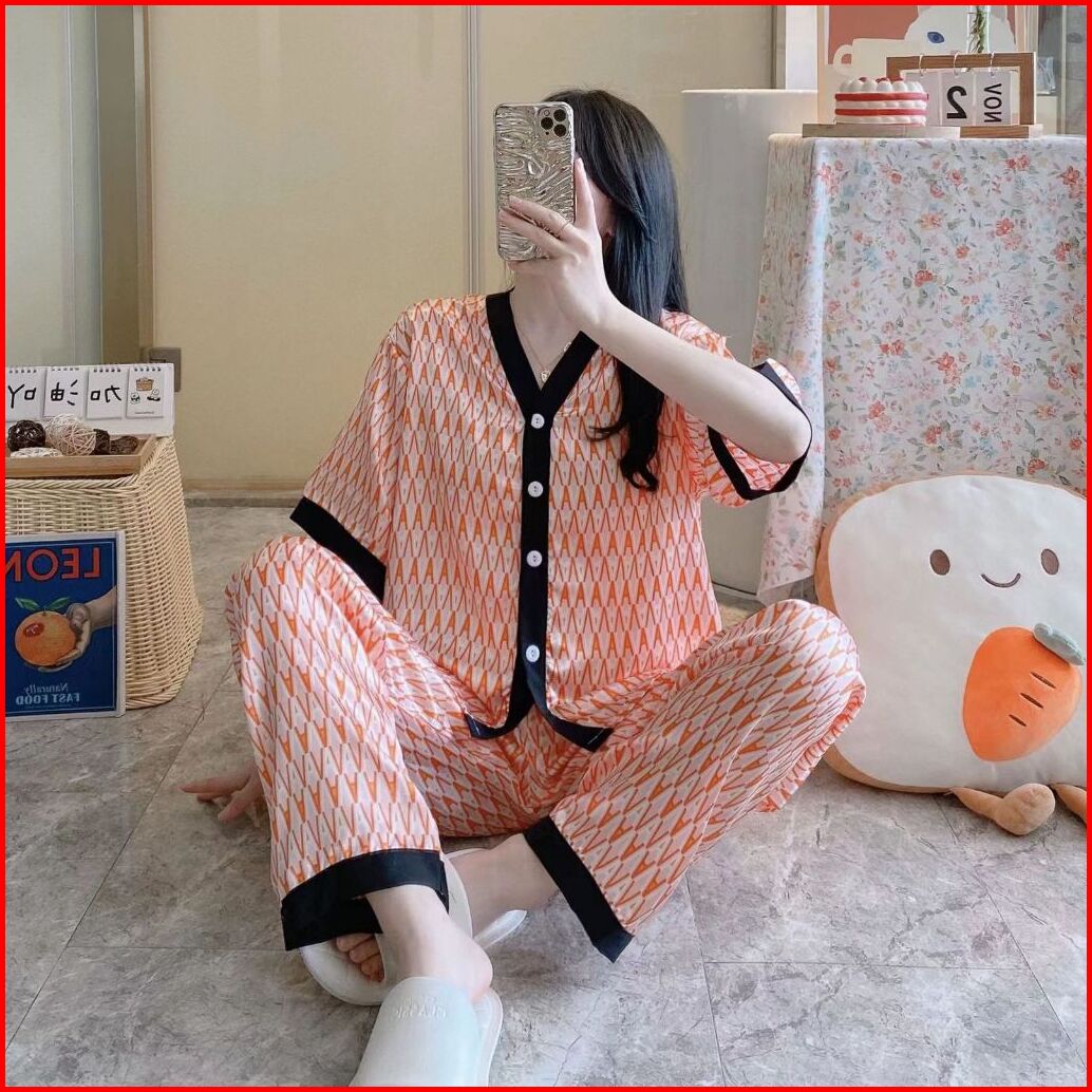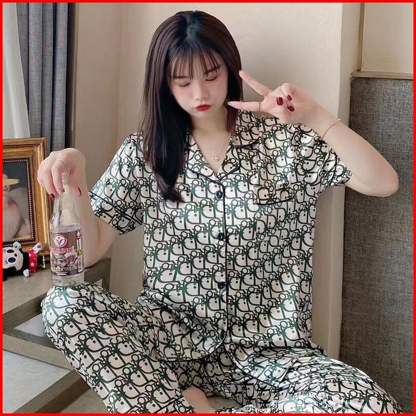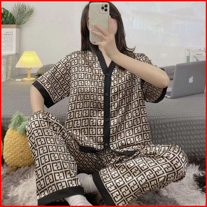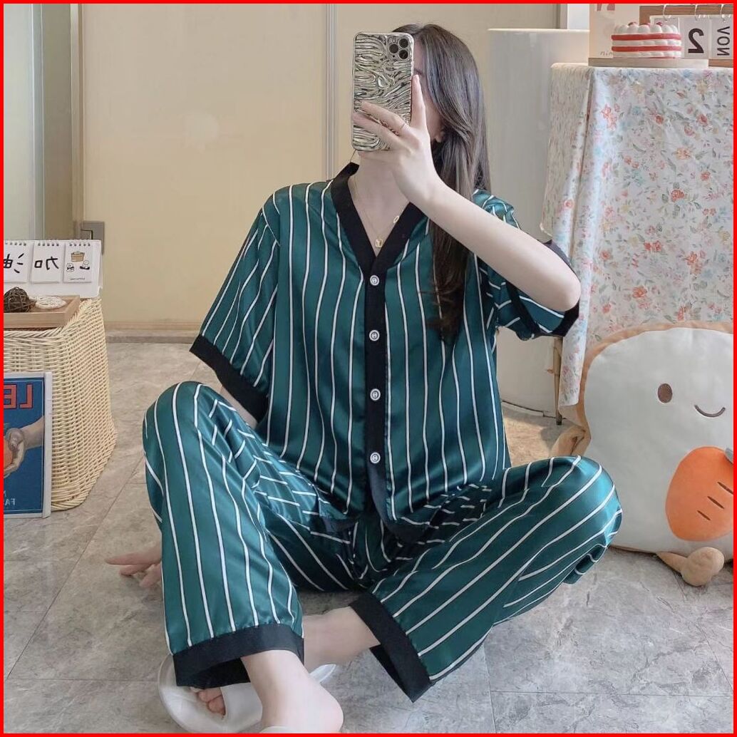 03 Sleepwear Luxury Sleepwear Kelas Atas Piyama Satin Lengan Pendek Celana Panjang Motif Kancing Hidup Bahan Satin High