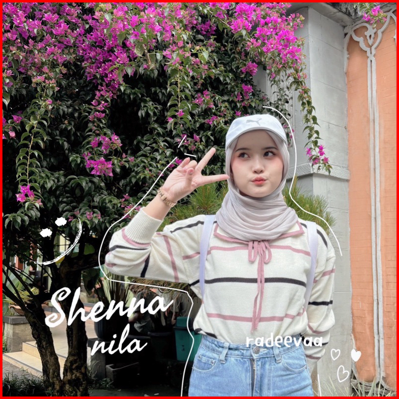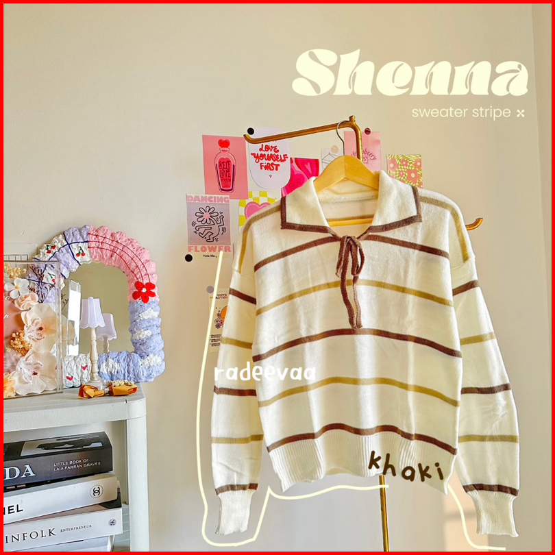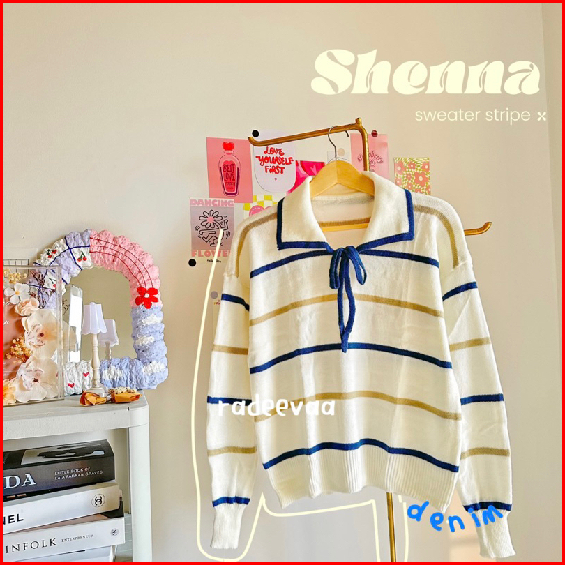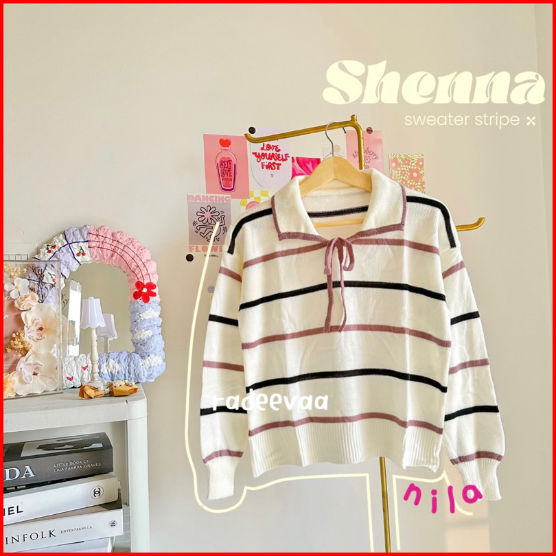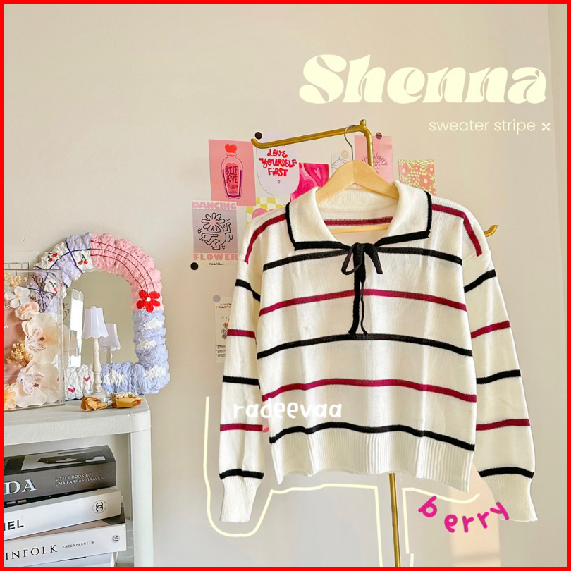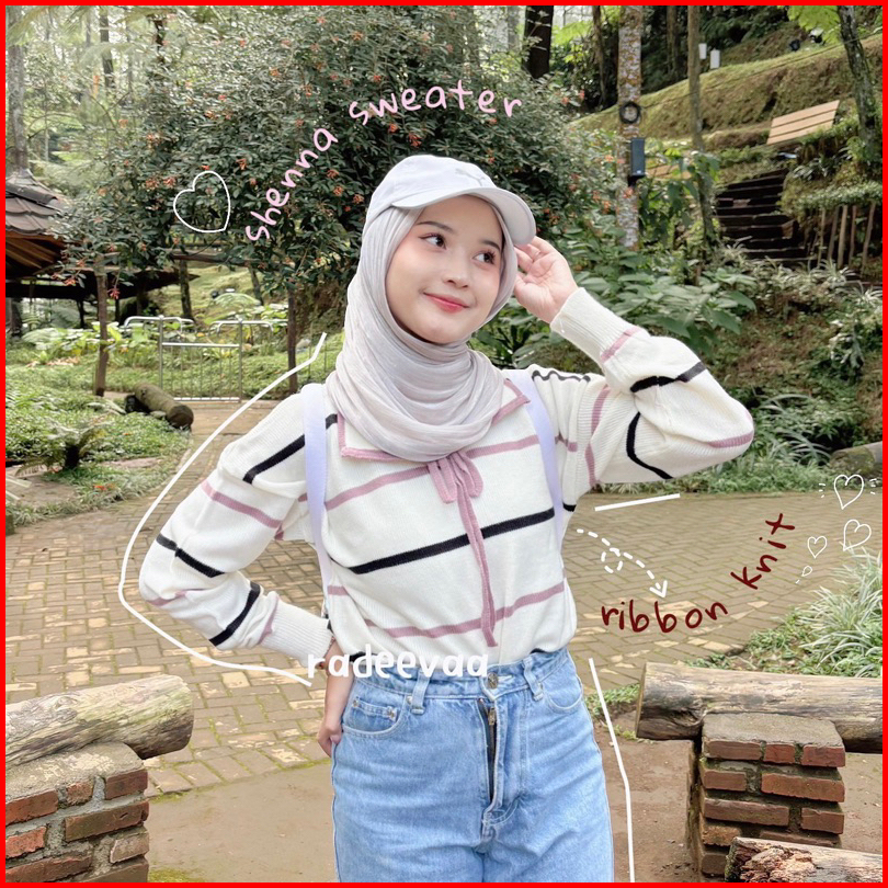 Shenna Sweater Ribbon Stripe Knit Coquette Atasan Rajut Pita Motif Garis Vneck Korean Style