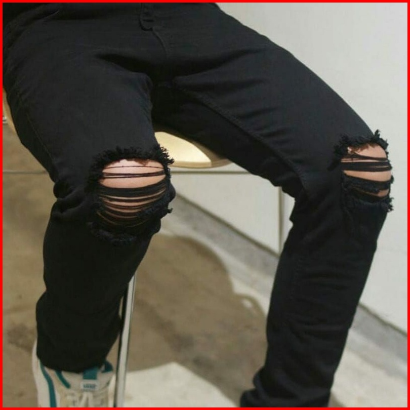 Celana Jeans Pria Sobek Ripped Robek Slimfit Pensil Stretch Hitam Premium 27-38