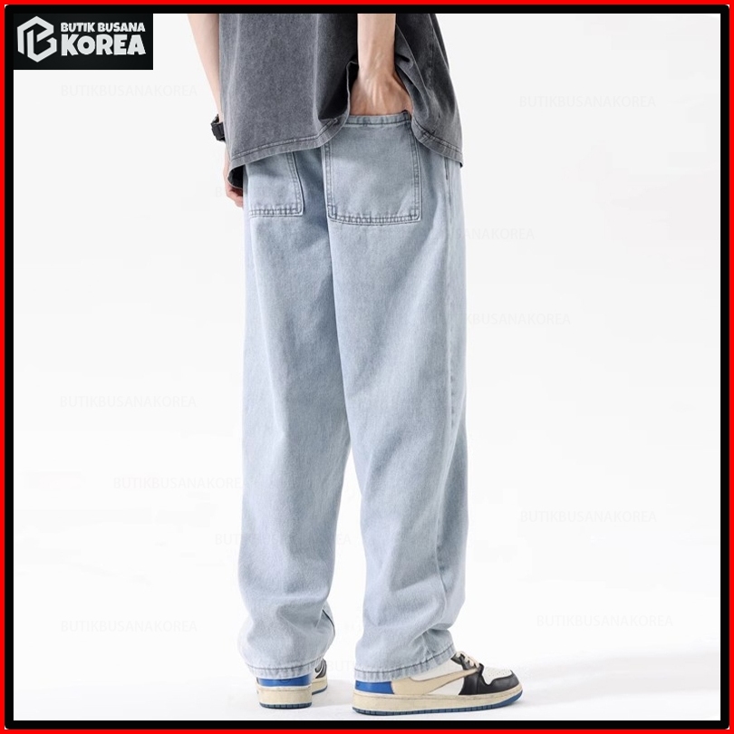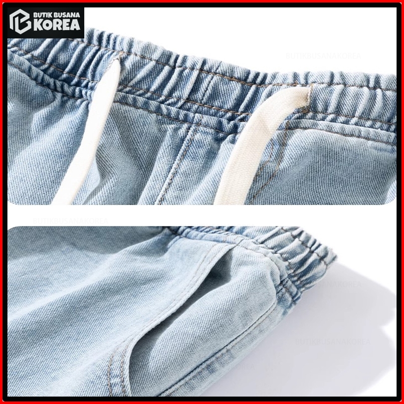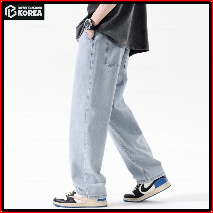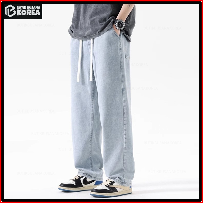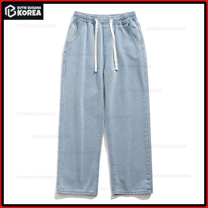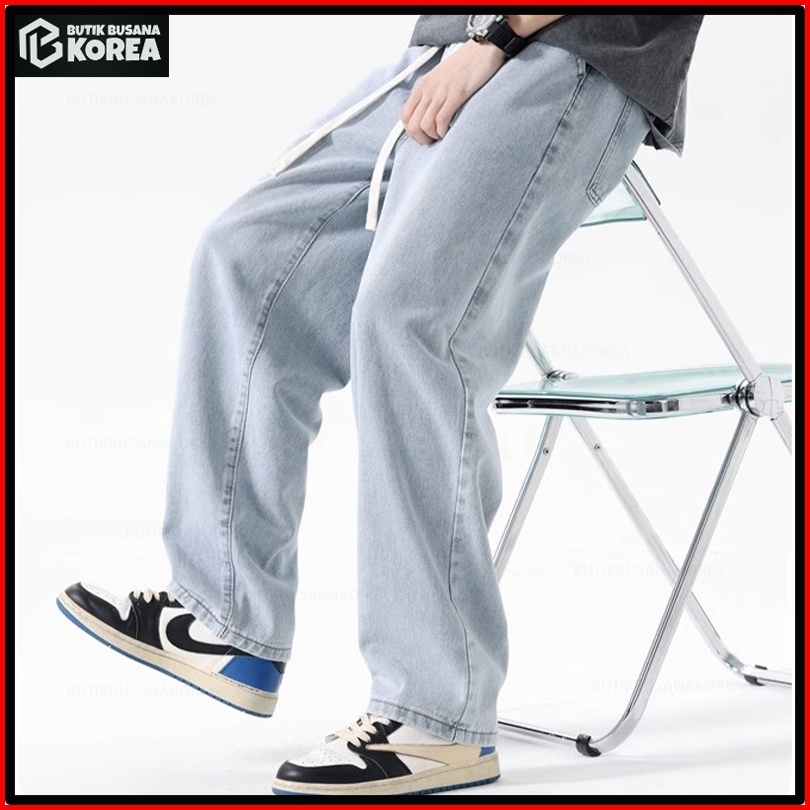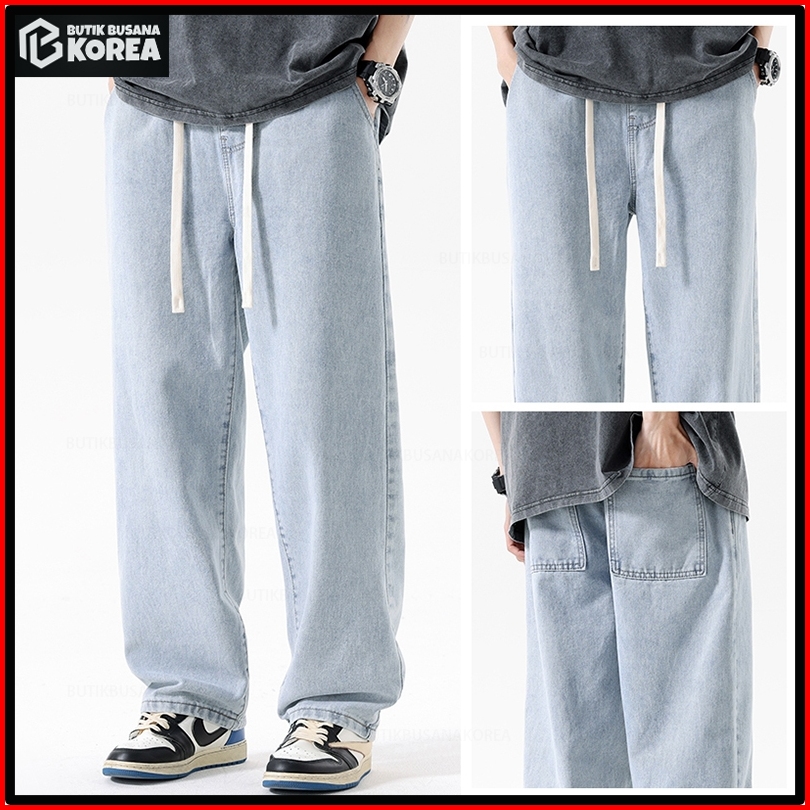 Celana Jeans Pria Pinggang Karet Korean Style Loose Pants Kulot Jeans Biru Muda Oversize Jumbo Tali Serut Wide Leg Celan