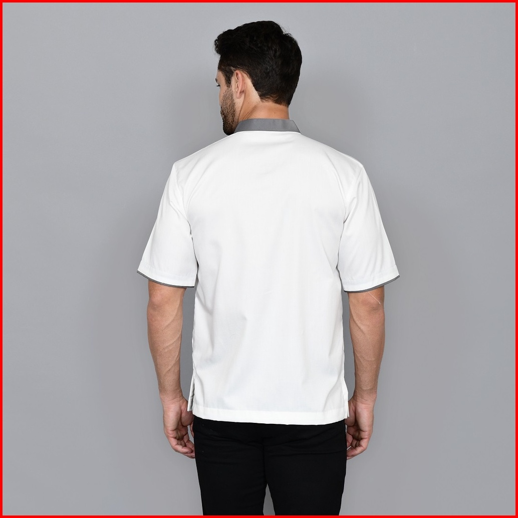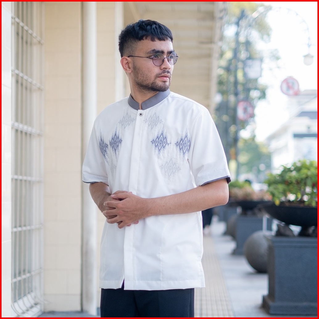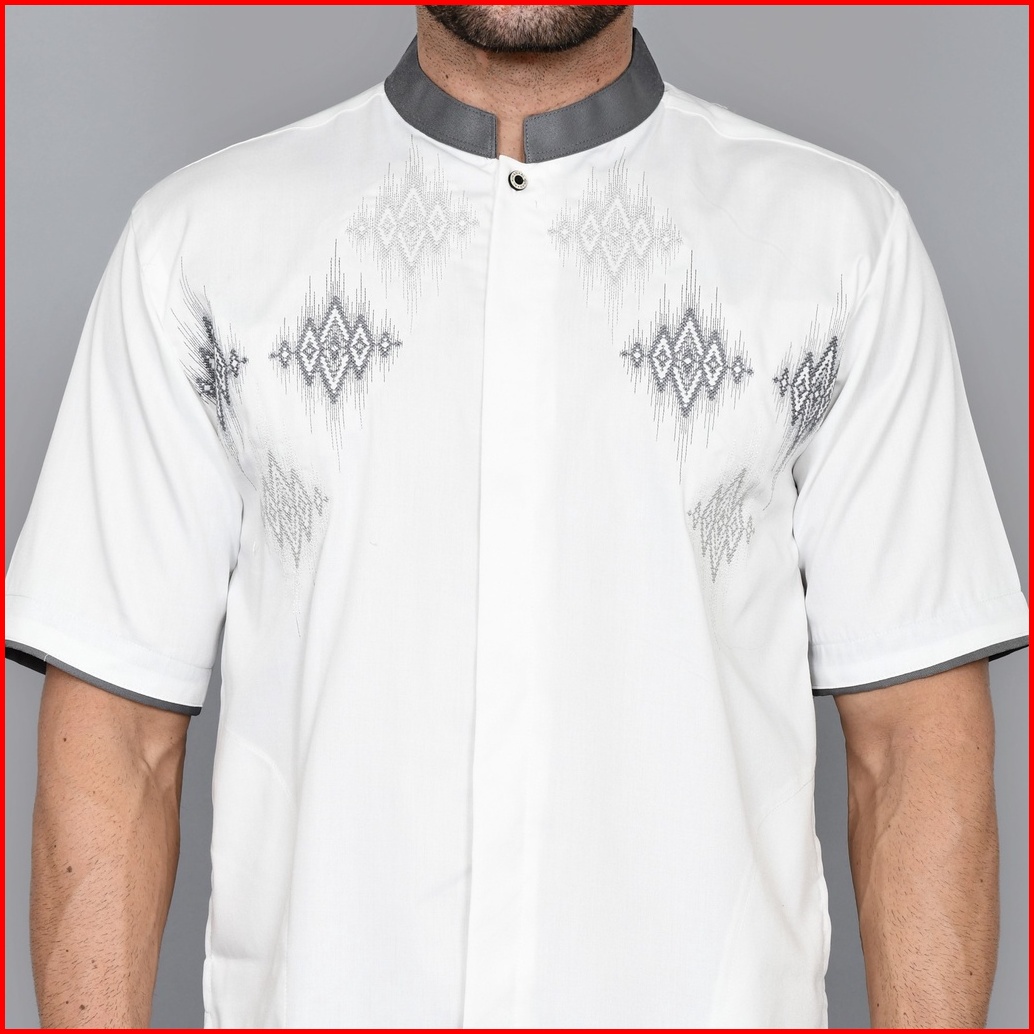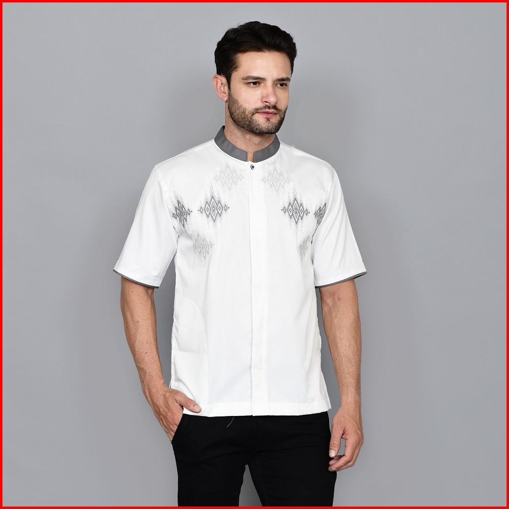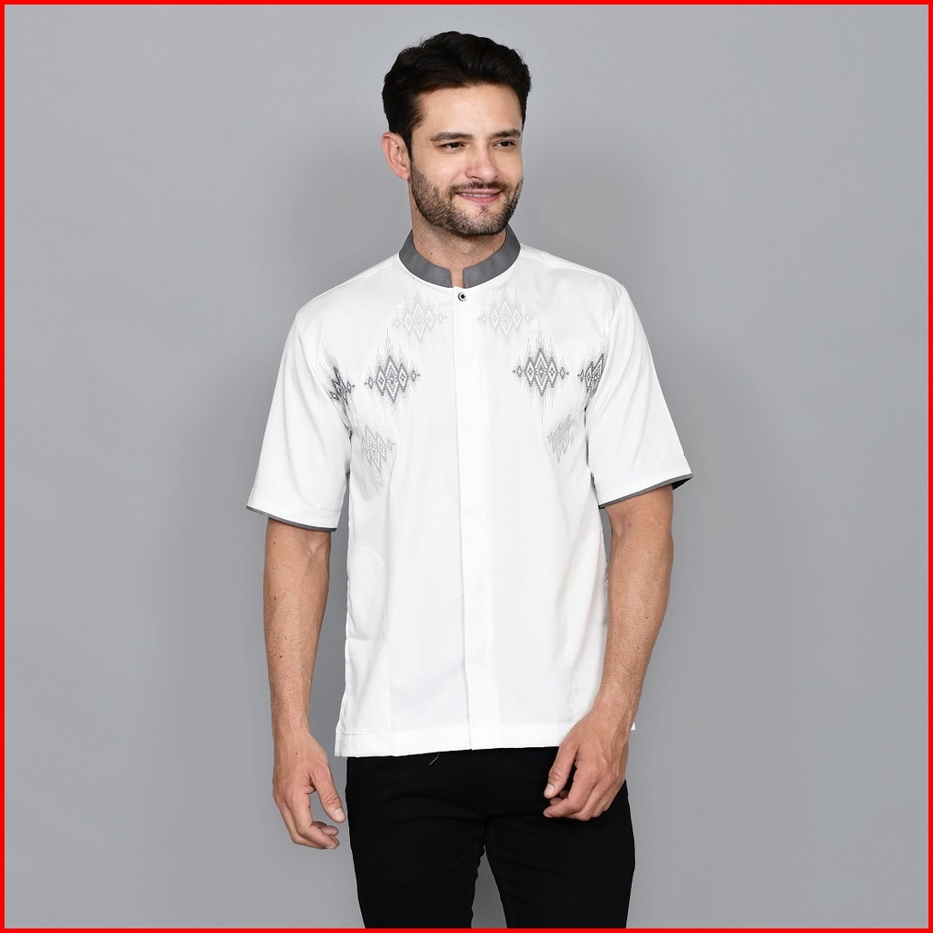 Baju Koko Muslim Pria Dewasa Lengan Pendek Katun Toyobo Bordir Putih Tulang Alkinan Ak042