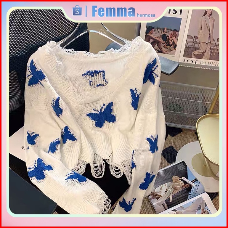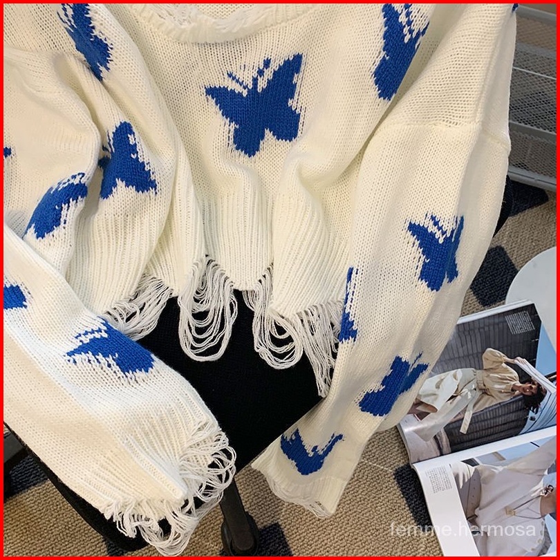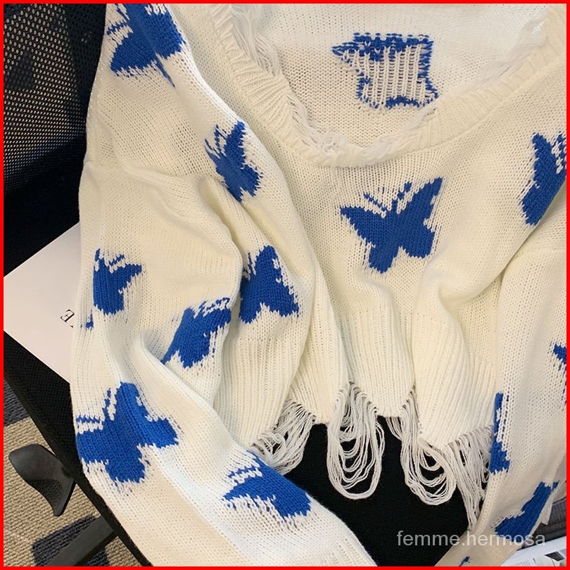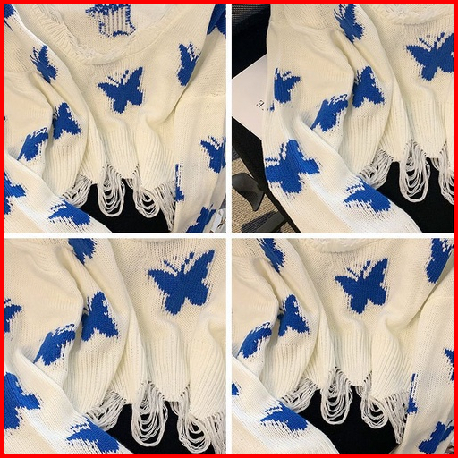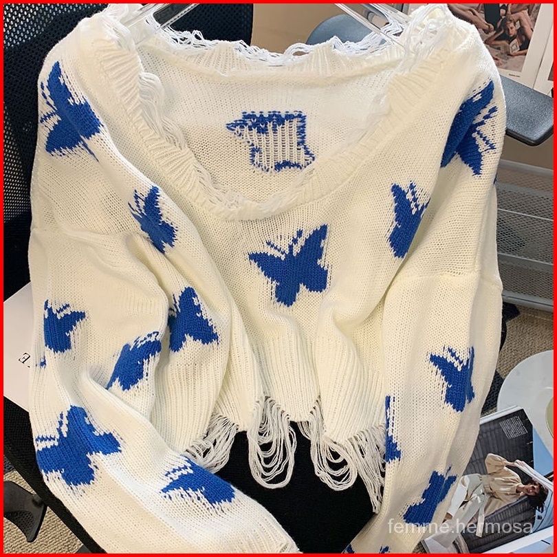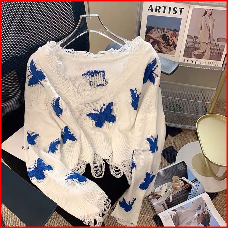 Readyatasan Rajutan Kupu-kupu Wanita Sweter Lengan Panjang Robek Pendek Bahu Terbuka