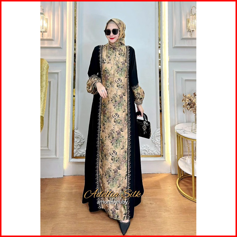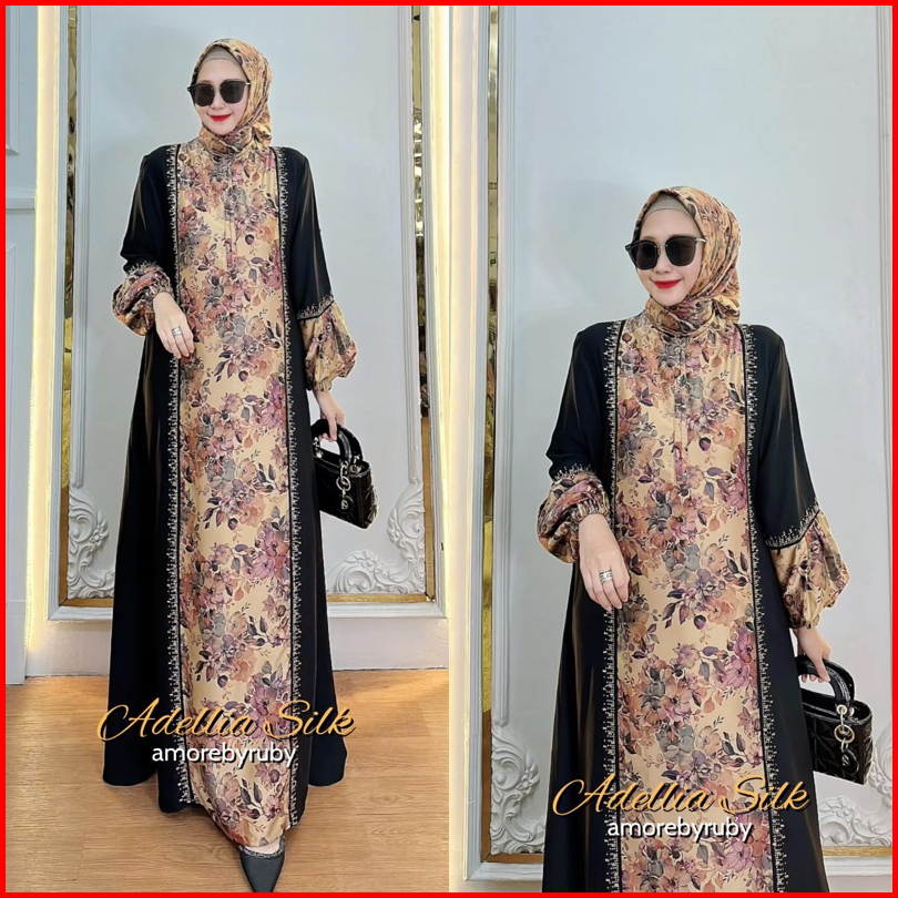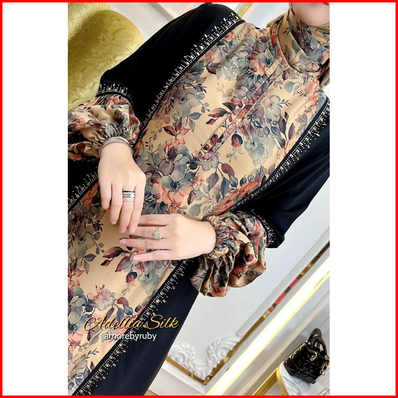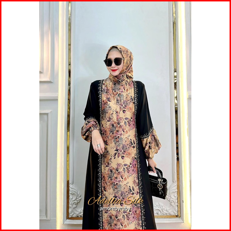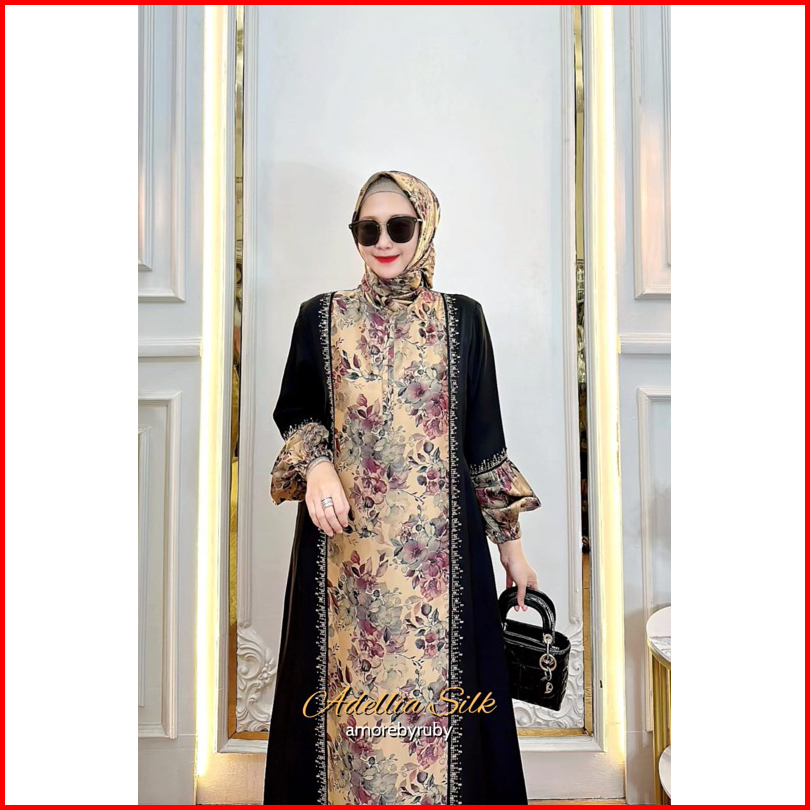 Adellia Silk Set Hijab Amore By Ruby Gamis Motif Bunga Payet Swarovski Mix Hitam Lebaran 2024 Busui