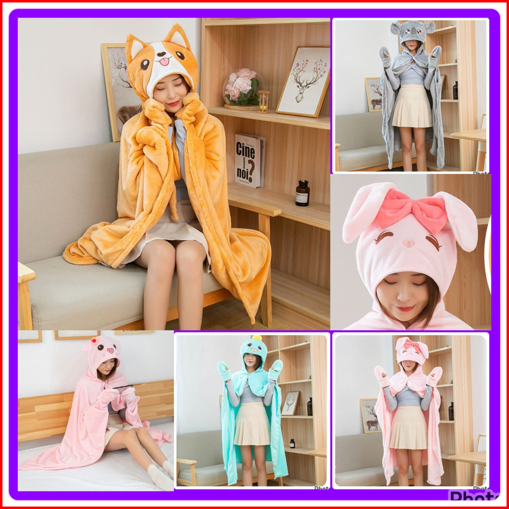 Ev B56 Selimut Topi Hoodie Karakter Dino Koala Kelinci Ada Sarung Tangan Jubah Dewasa