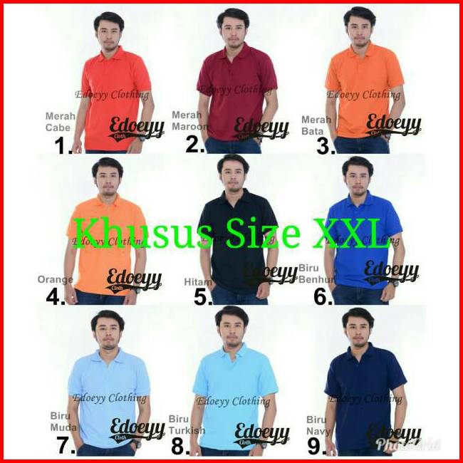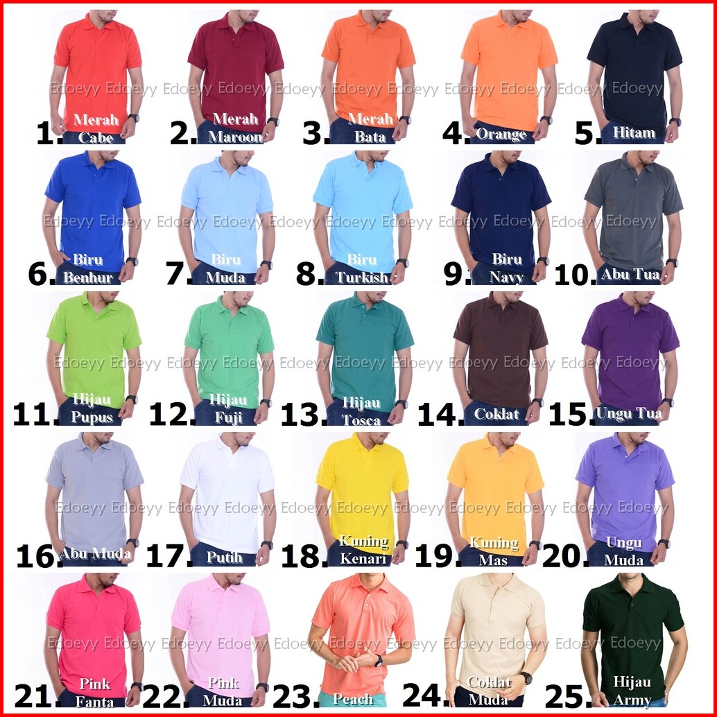 POLO HITAM, POLO MAROON, POLO ARMY, POLO ABU TUA, POLO TOSCA, POLO PUTIH, POLO COKLAT, POLO MERAH TERANG, POLO NAVY/DONGKER, POLO BIRU BENHUR, POLO BIRU TURKISH, POLO BIRU MUDA, POLO HIJAU FUJI, POLO UNGU TUA, POLO KUNING MAS, POLO MERAH BATA, POLO UNGU MUDA, POLO KUNING KENARI, POLO PINK FANTA, POLO ORANGE, POLO HIJAU STABILO, POLO ABU MUDA, POLO PINK MUDA, POLO PEACH, POLO COKLAT MUDA, POLO CREAM, POLO SAGE GREEN