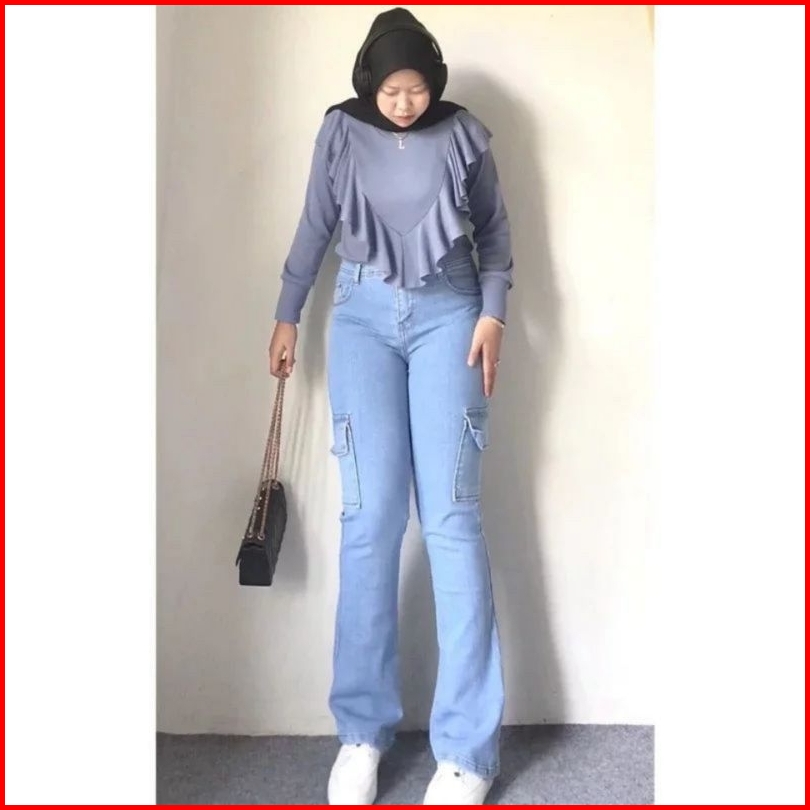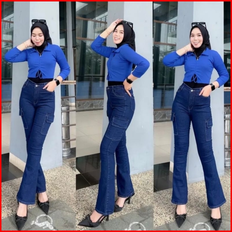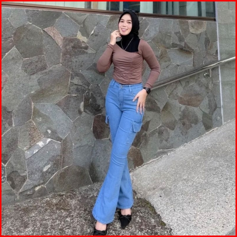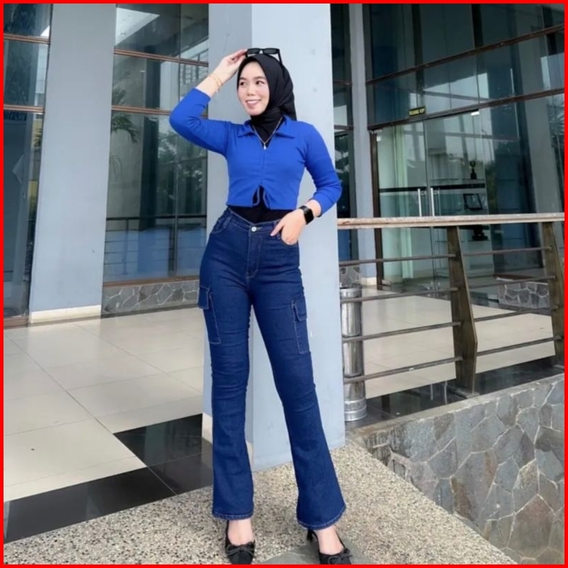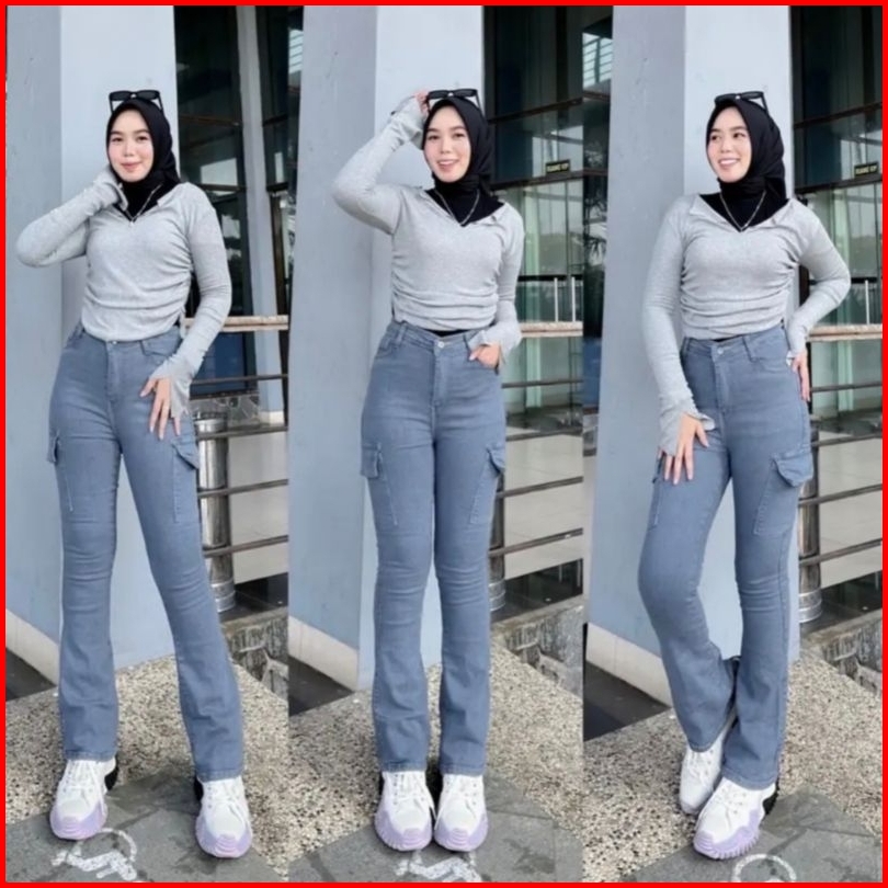 Cutbray Cargo Jeans Wanita Highwaist Stretch