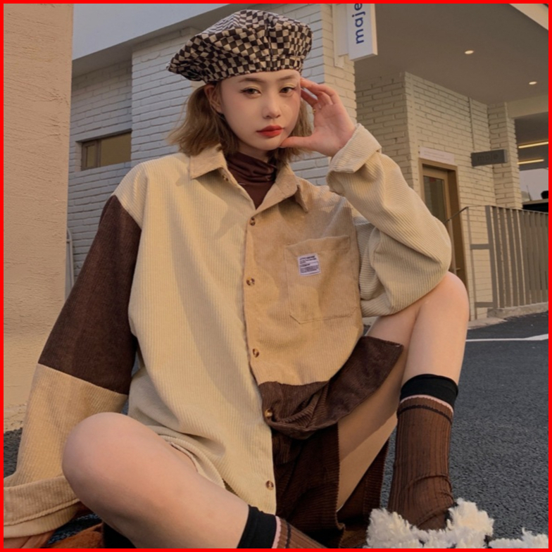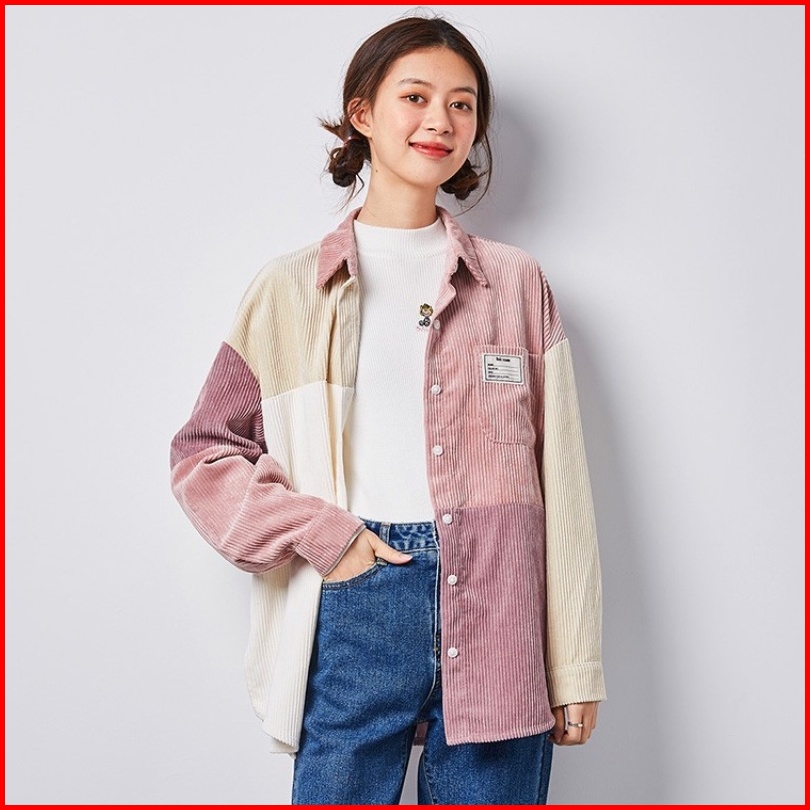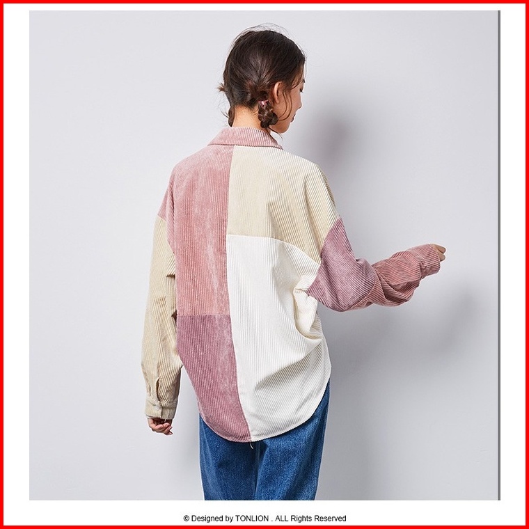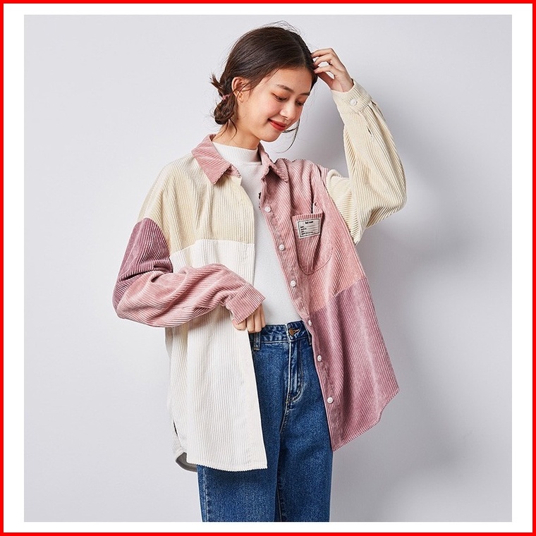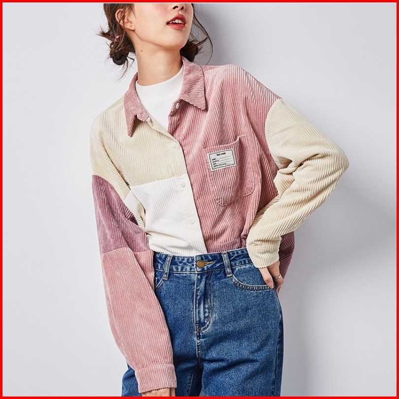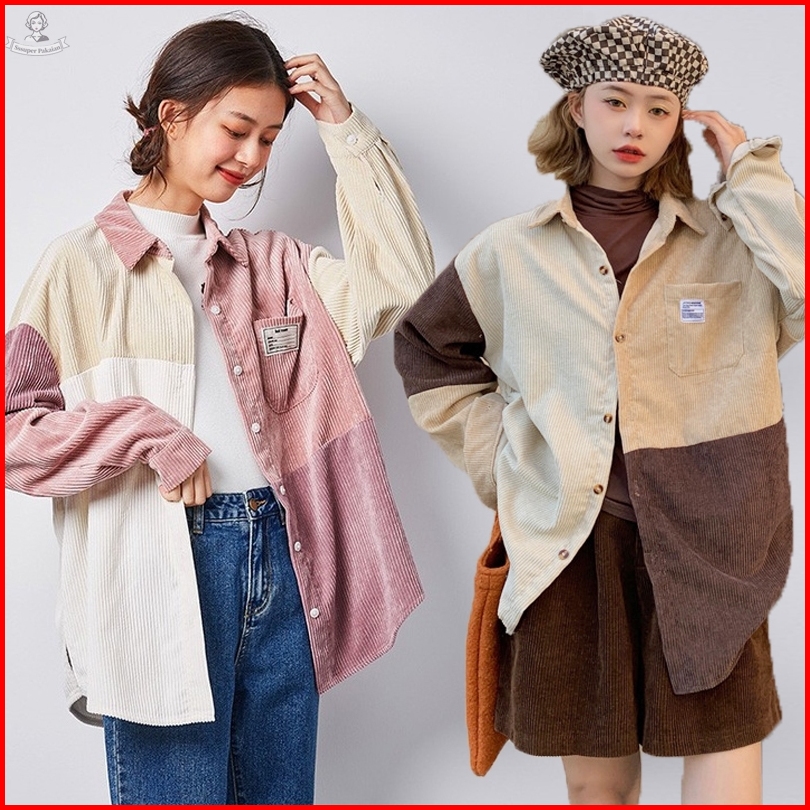 Kemeja Korduroi Retro Wanita Gaya Korea Atasan Kemeja Lengan Panjang Blok Warna Kasual