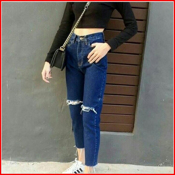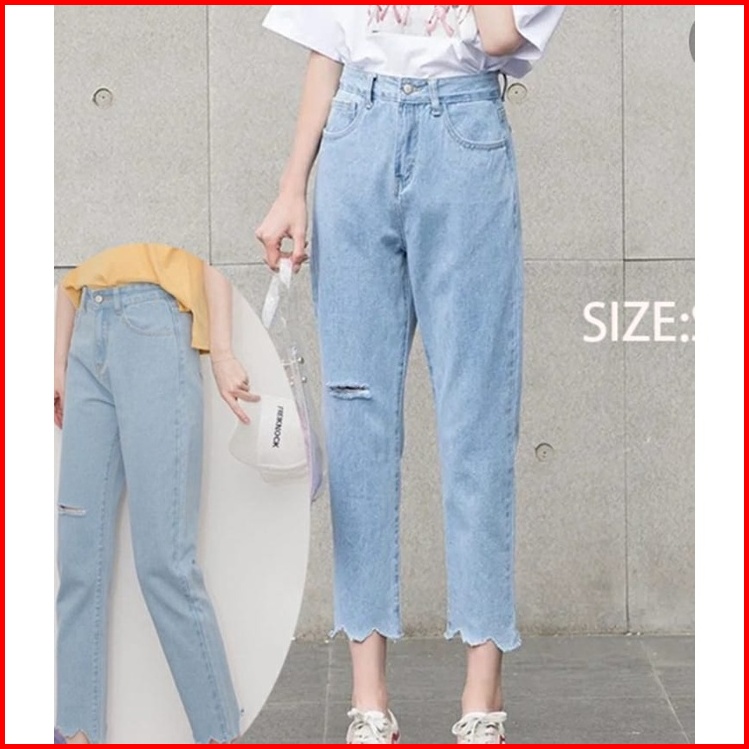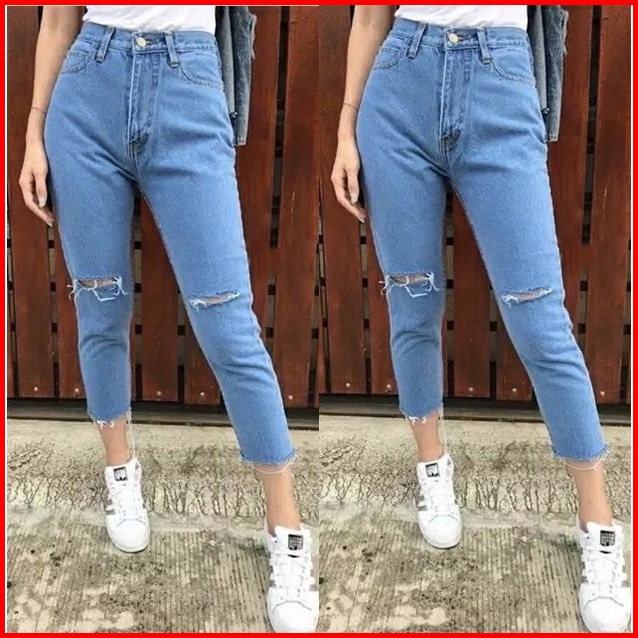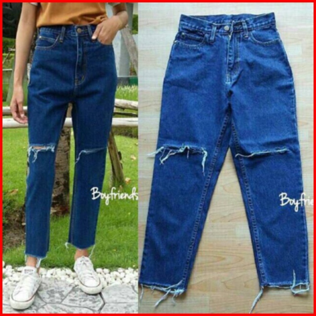 Celana Boyfriend Wanita Sobek Garis Celana Panjang Jeans Sobek Garis