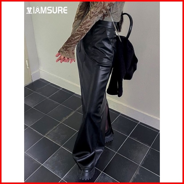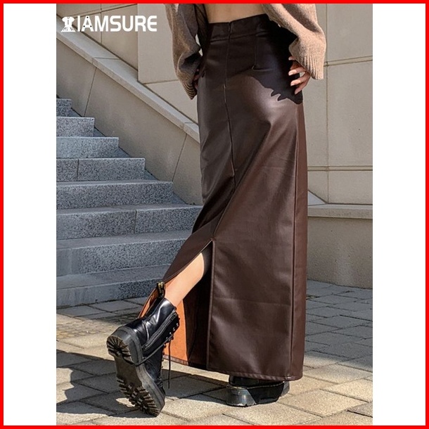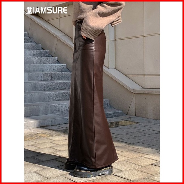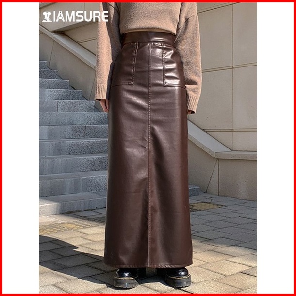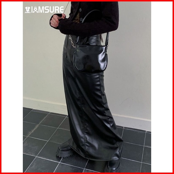 Rok Kulit Panjang Long Skirt Belahan Belakang Rok Longgar Lurus Saku Harajuku Rok Wanita Maxi