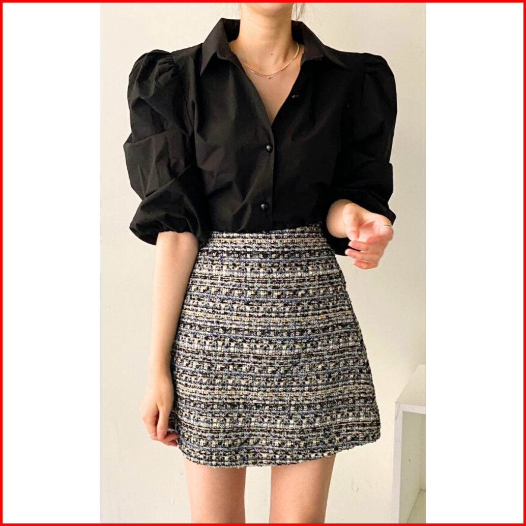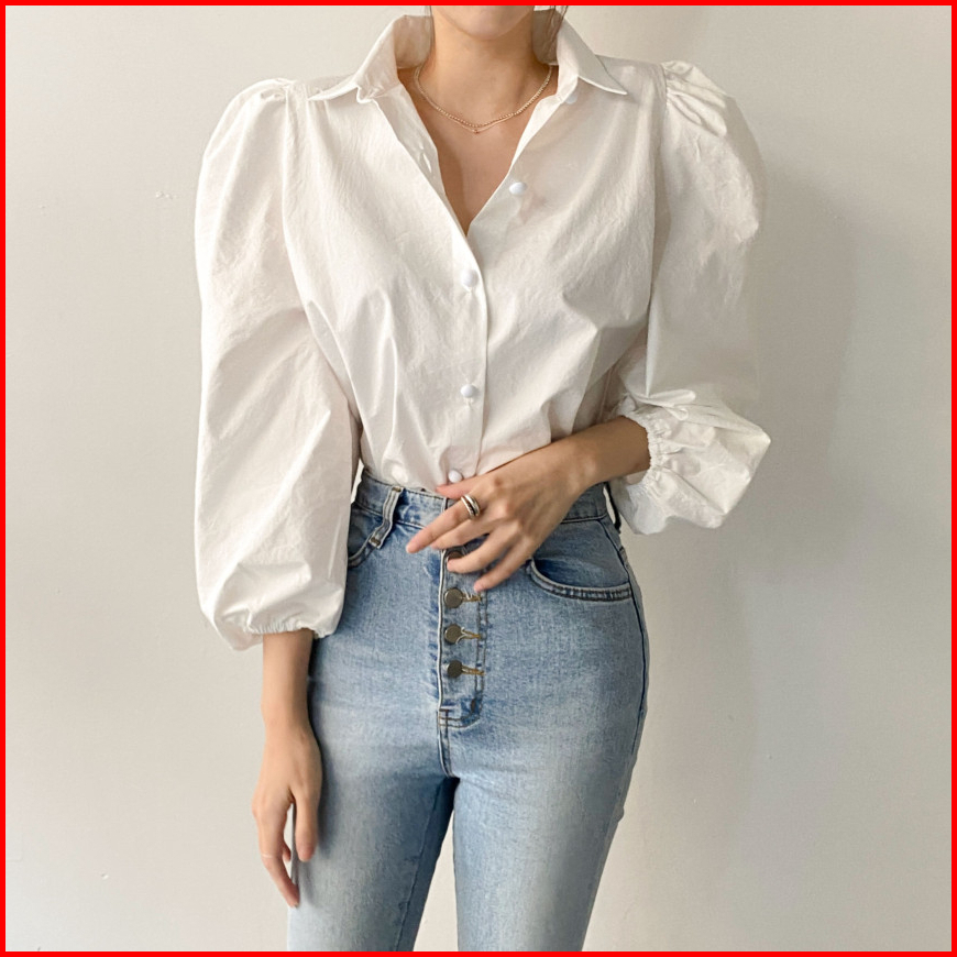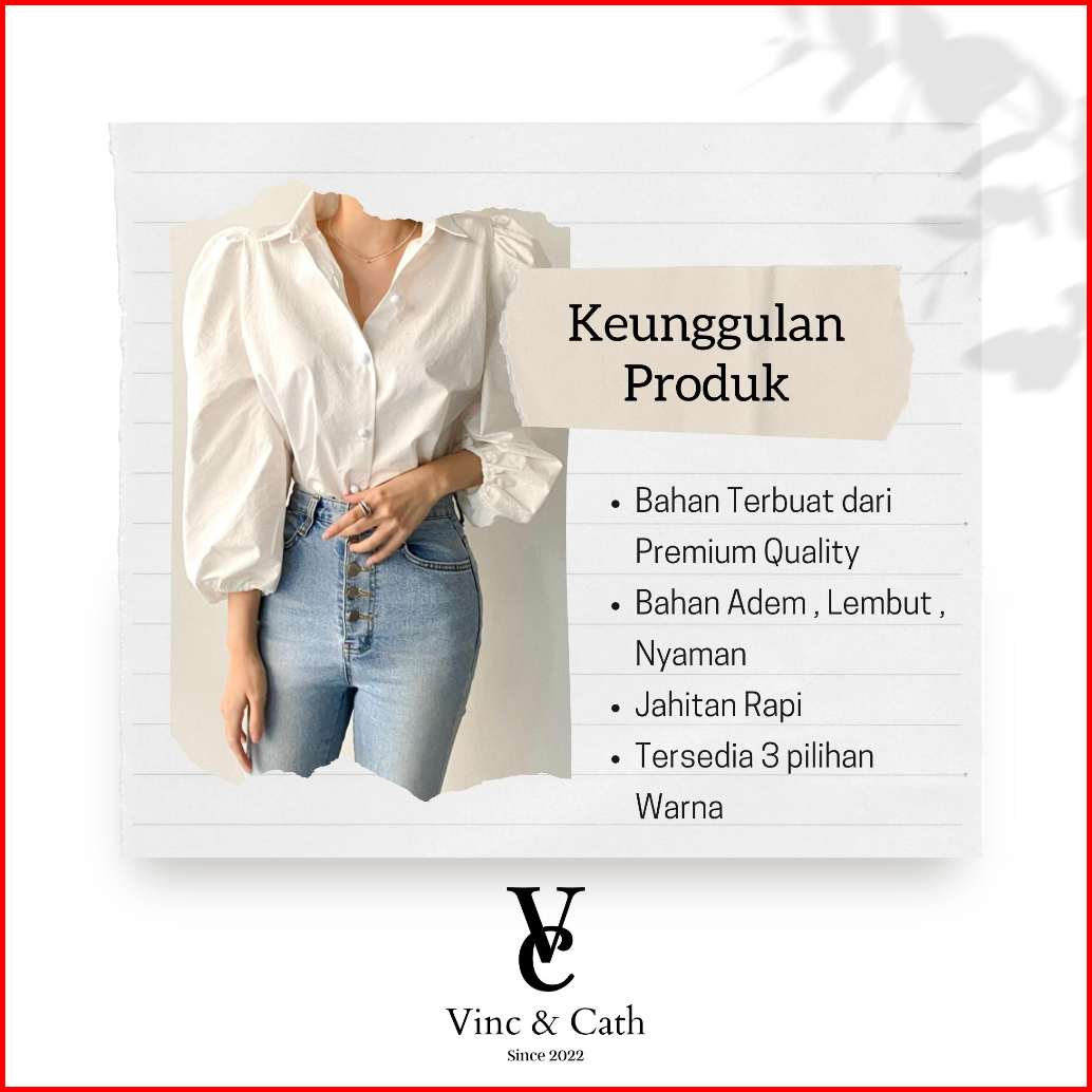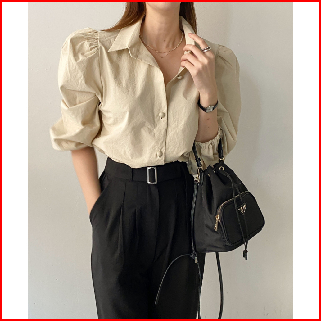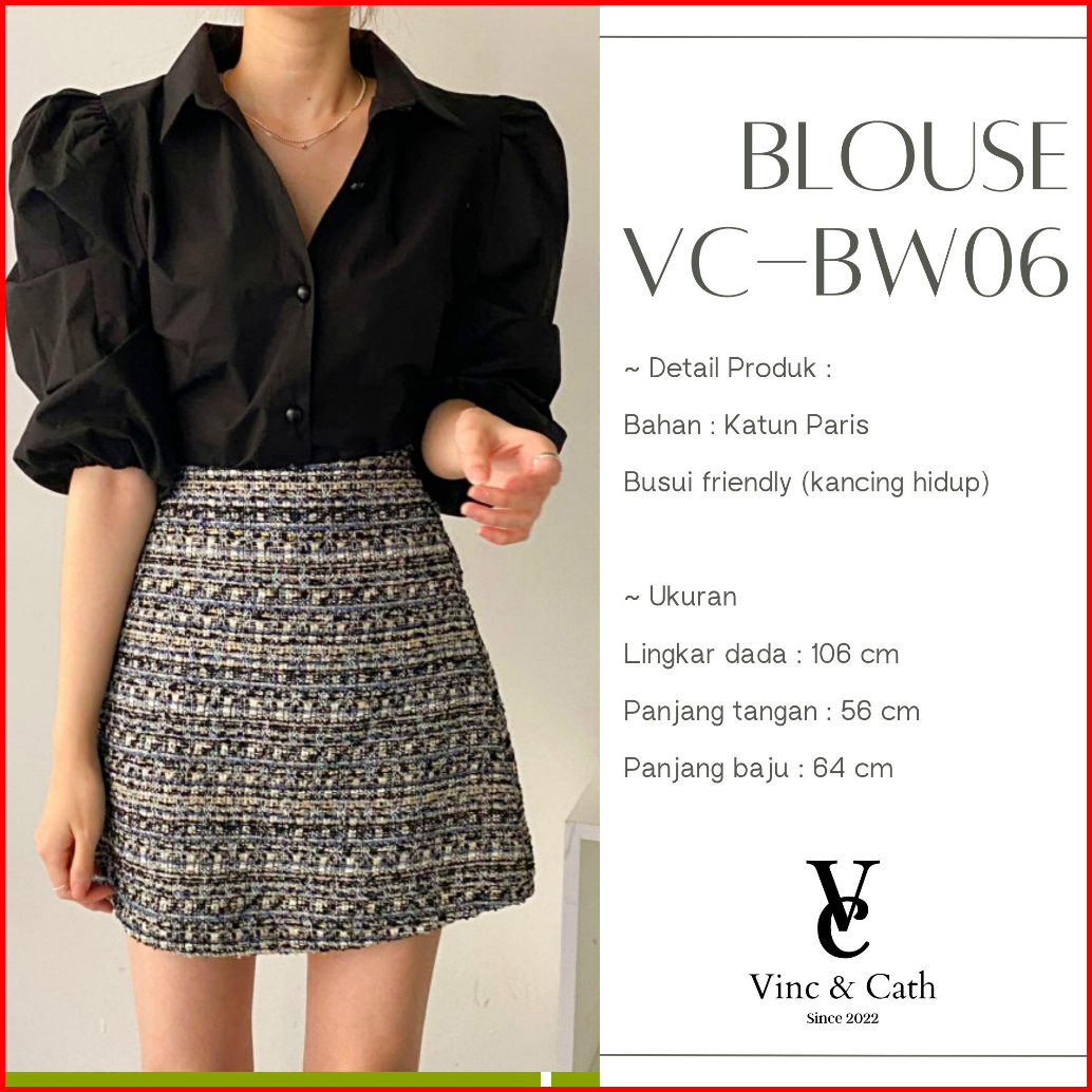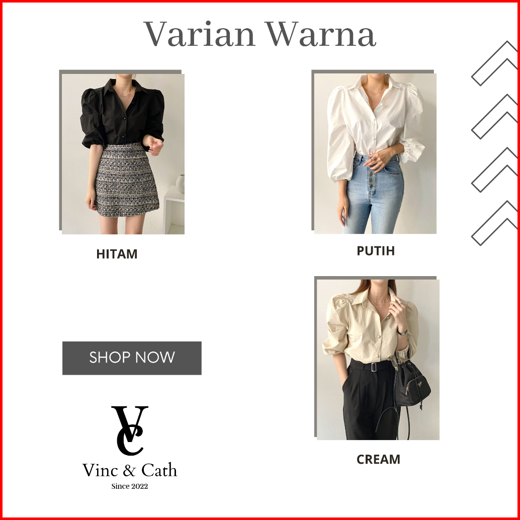 Vincath Baju Blouse Kemeja Puff Sleeve Wanita - Hitam Putih Cream Korean Style Casual Formal