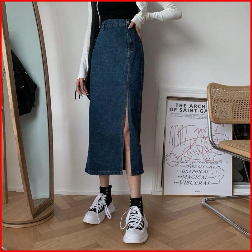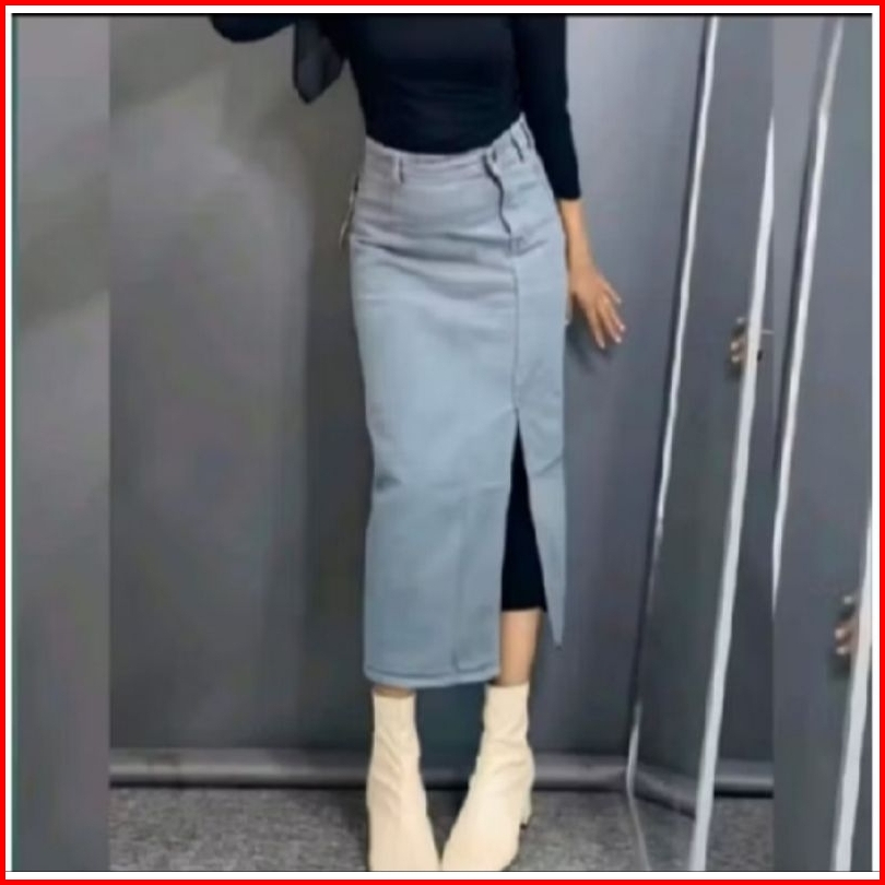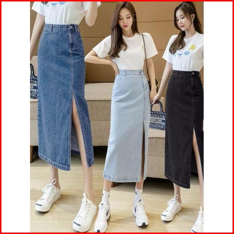 Rok Jeans Wanita Korean Style Higwaist Belah Samping Rok Midi Leght A-line