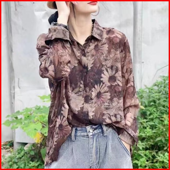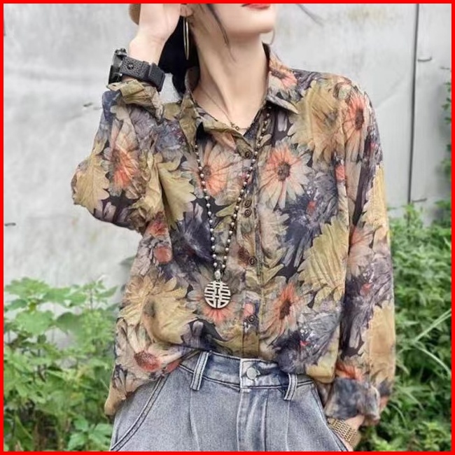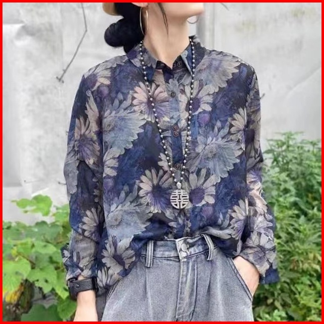 Kemeja Vintage Cetak Kasual Longgar Baru