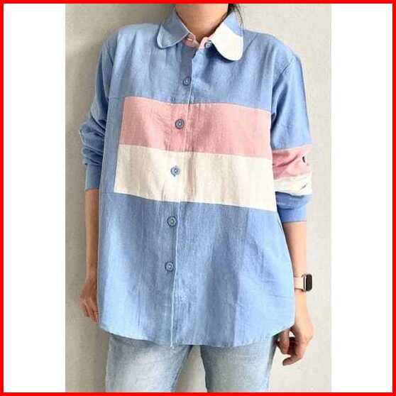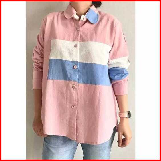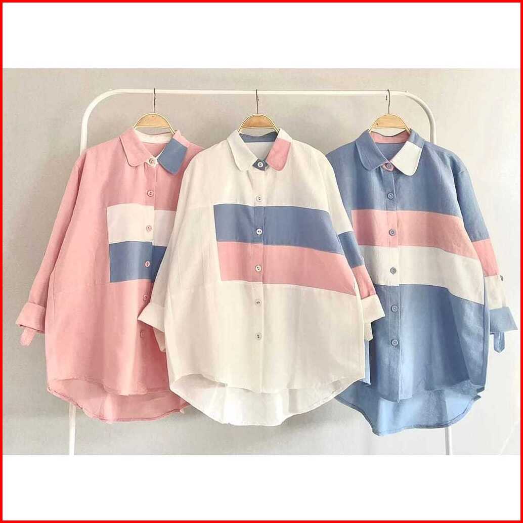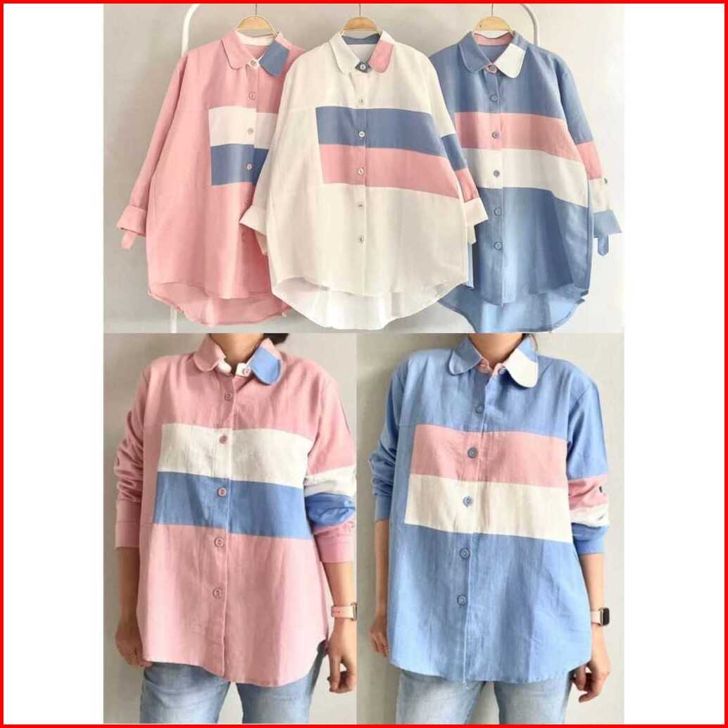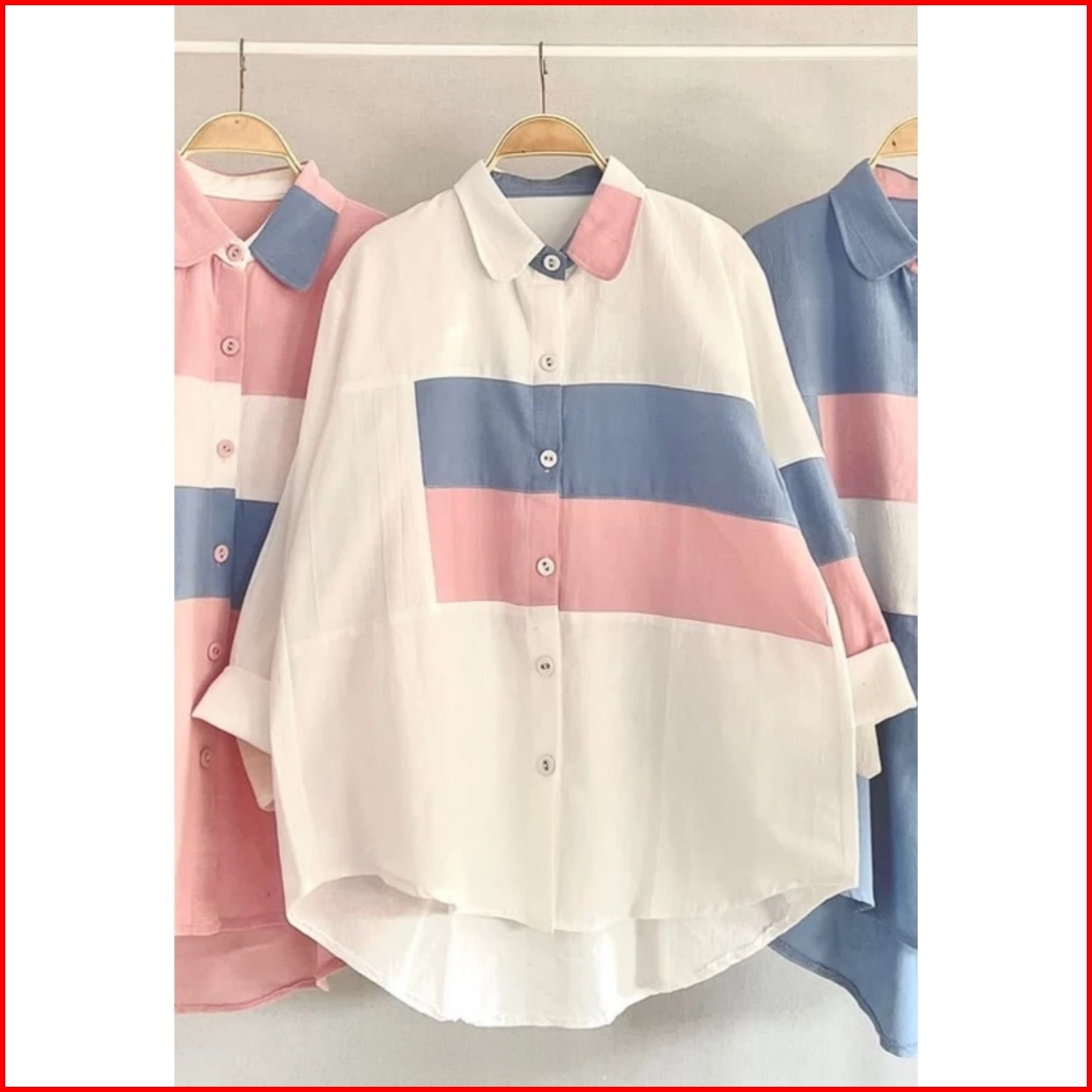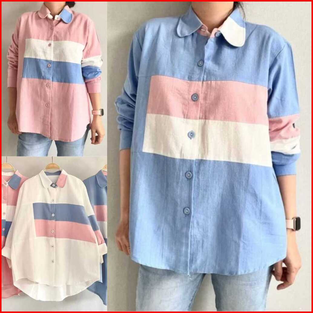 Nando Flagline Kemeja Wanita Linen Premium Lengan Panjang Salur Sebelah Fashionable Kekinian 593