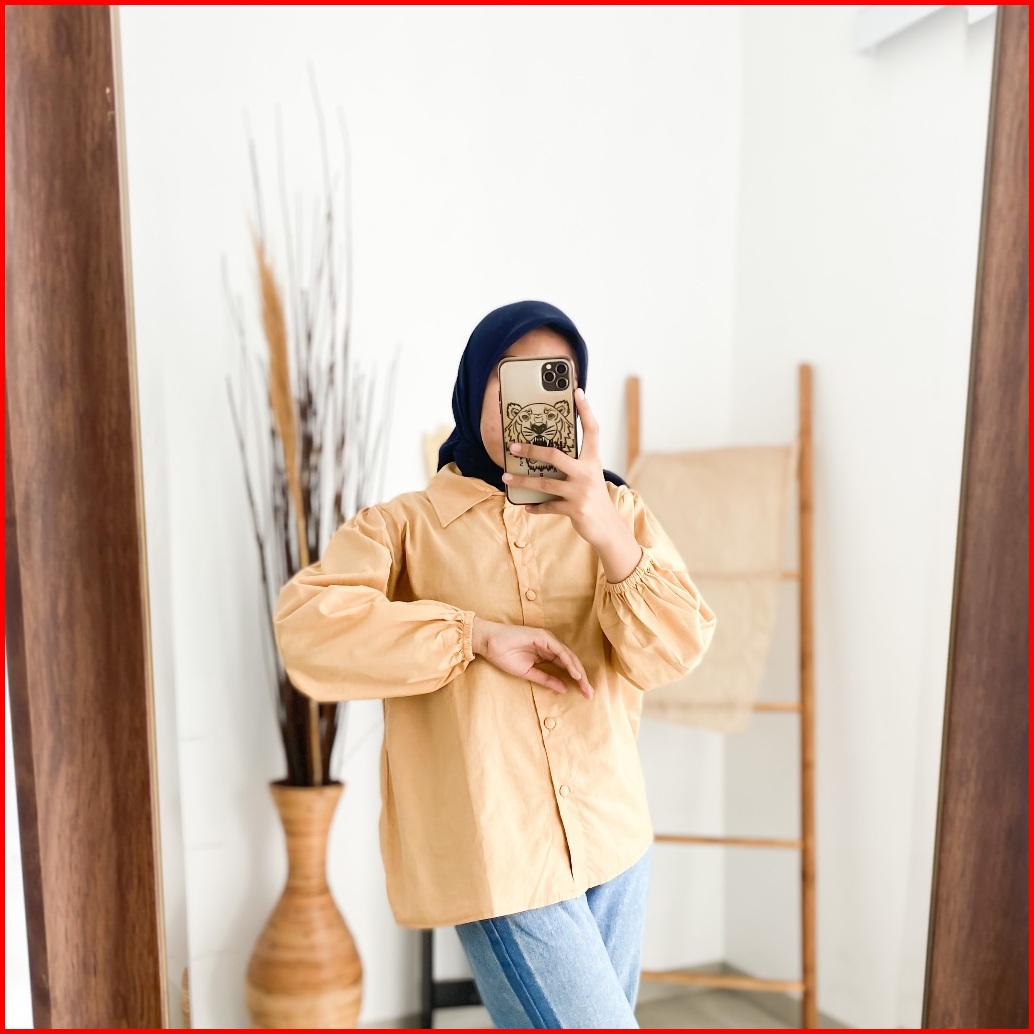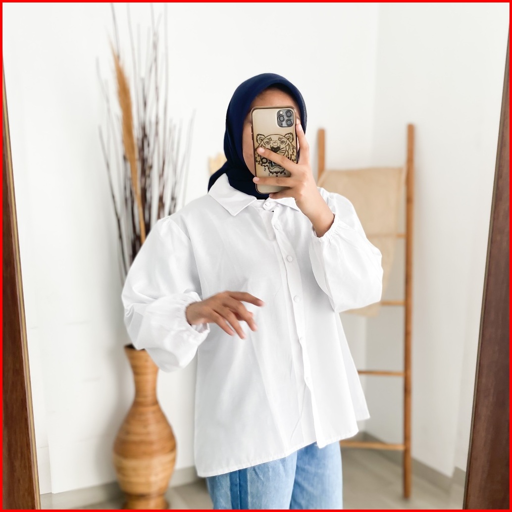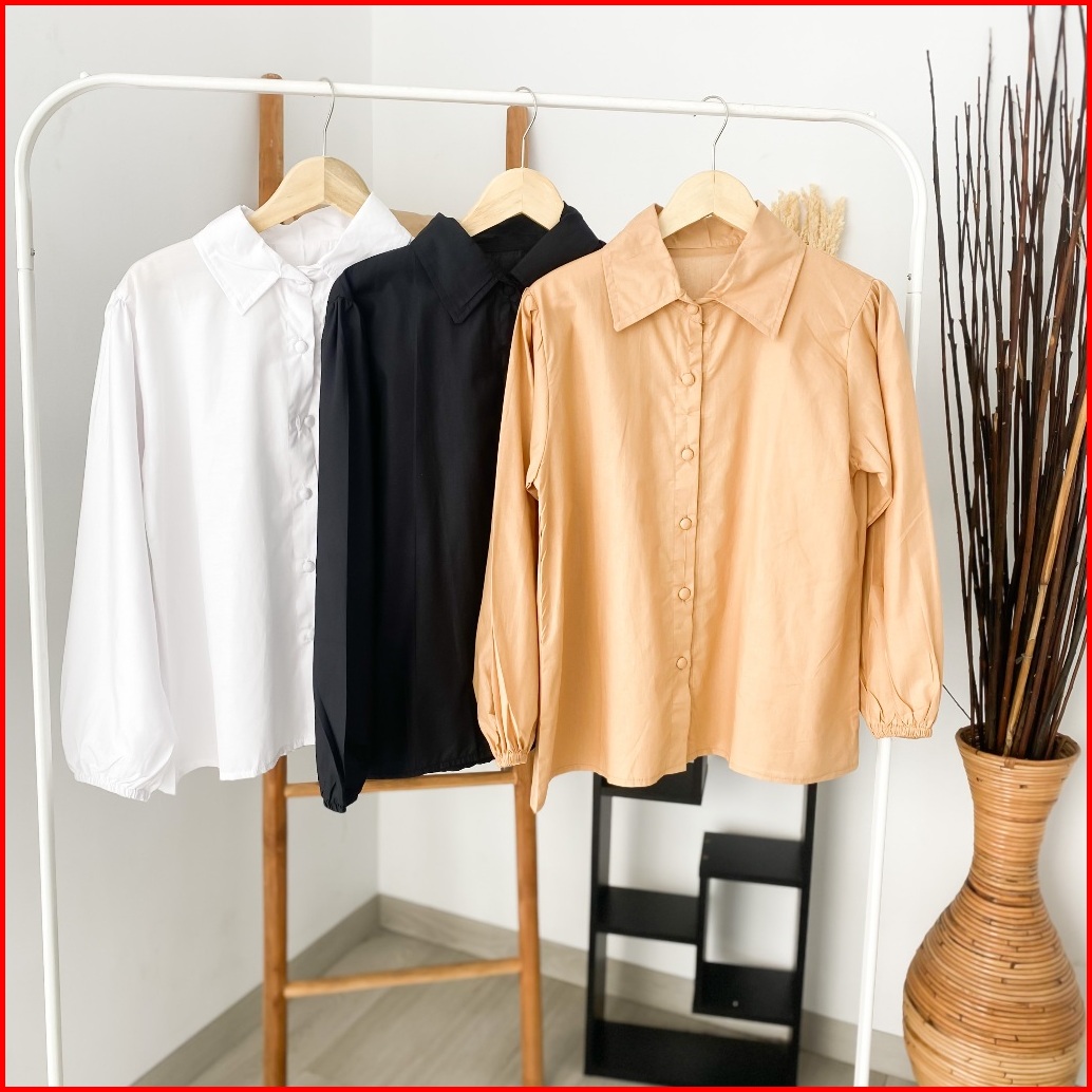 Enzy Shirt - Flottilicious Kemeja Kantor Baju Wanita Atasan Casual Basic Tangan Balon Korean Style Fashion Outfit Ootd S