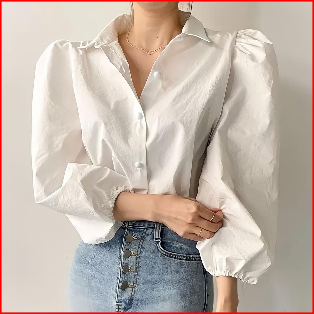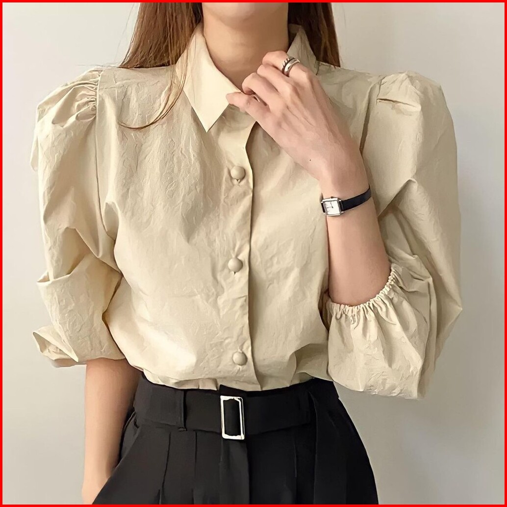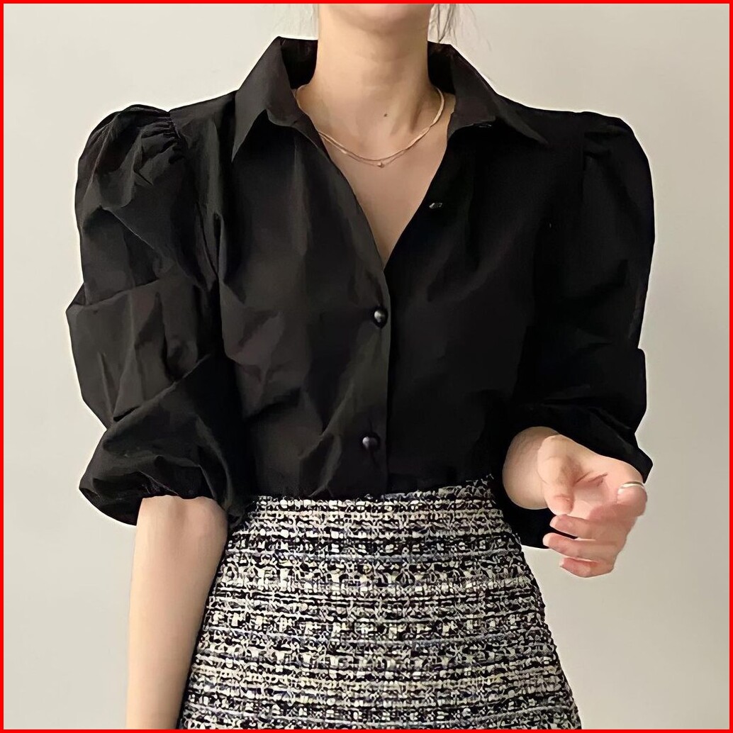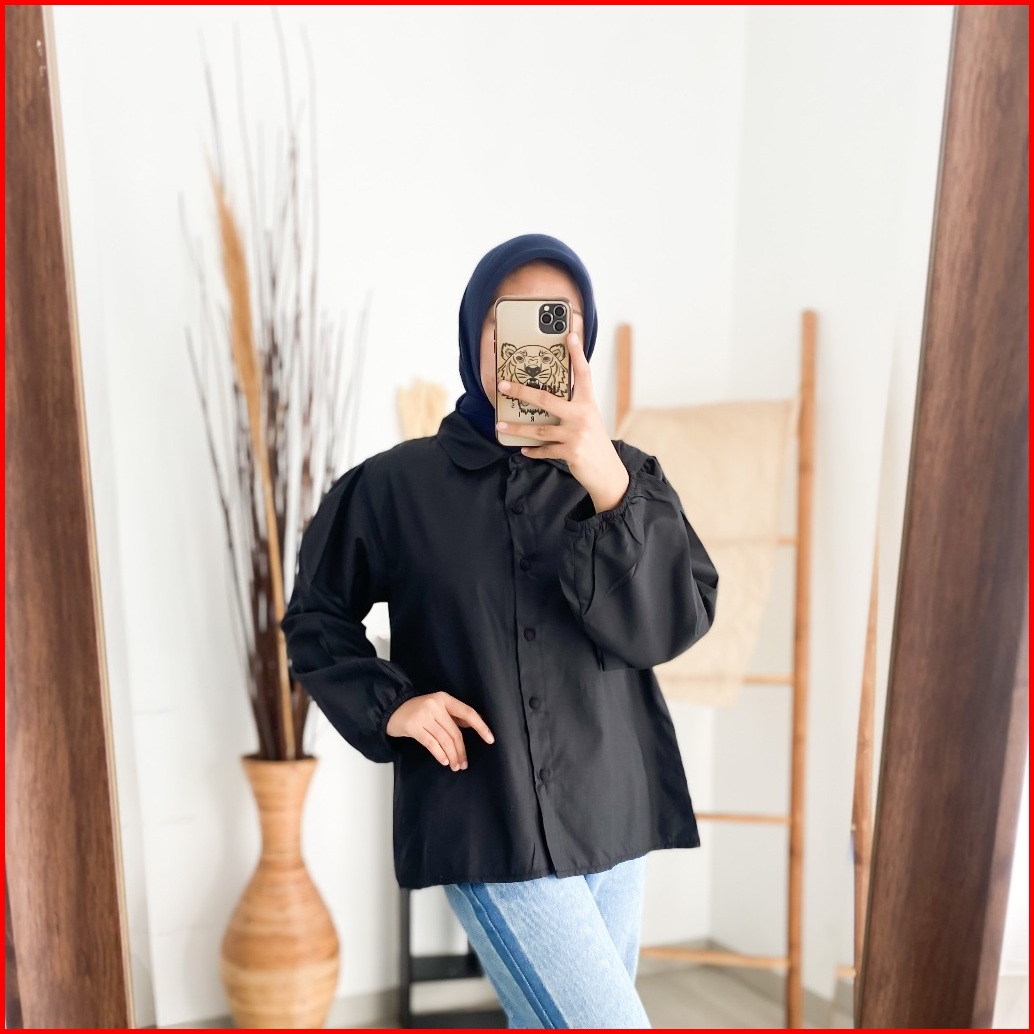 Enzy Shirt - Flottilicious Kemeja Kantor Baju Wanita Atasan Casual Basic Tangan Balon Korean Style Fashion Outfit Ootd S
