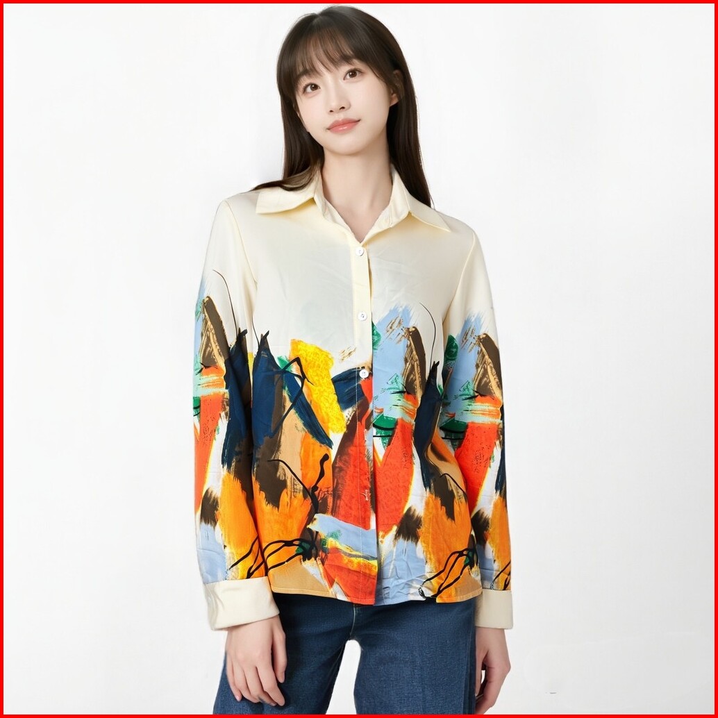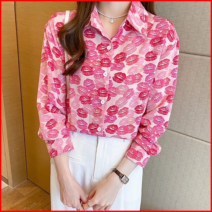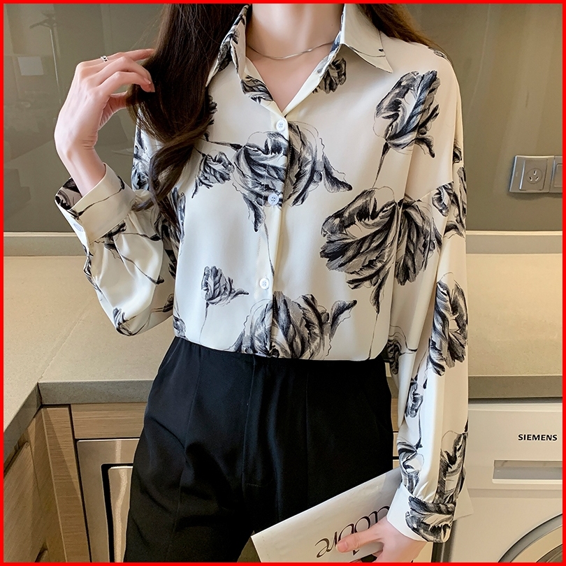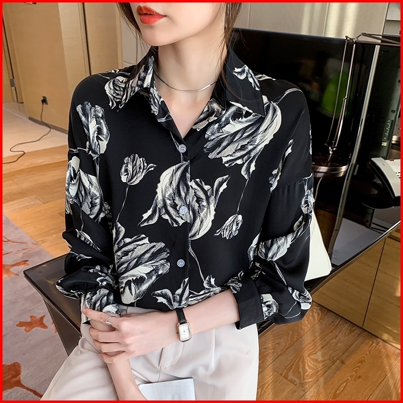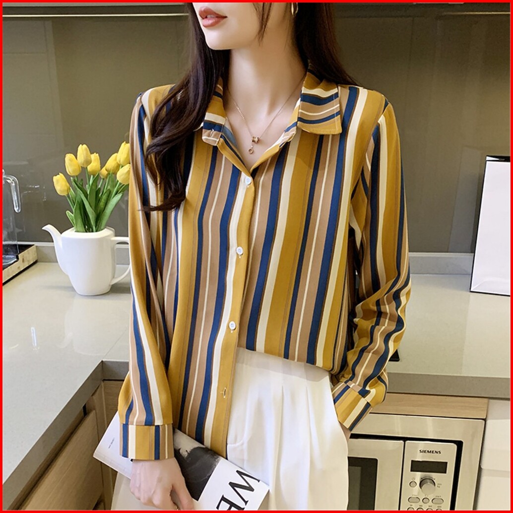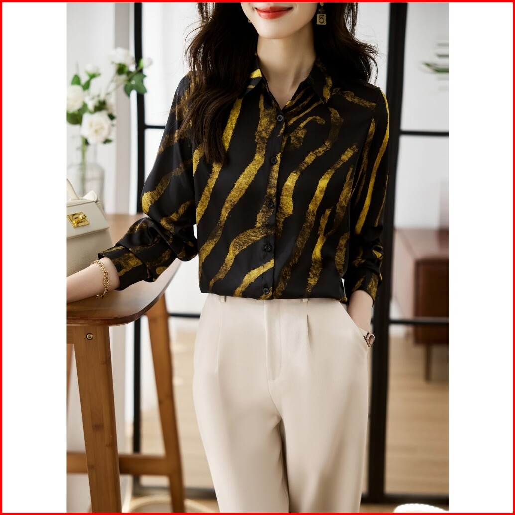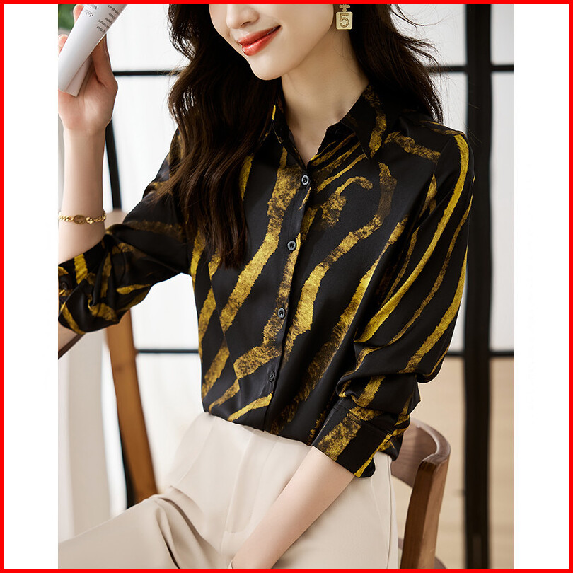 Tianshun Premium Stripe Print Black Shirt Korean Long Sleeved Work Conference Casual Women Top