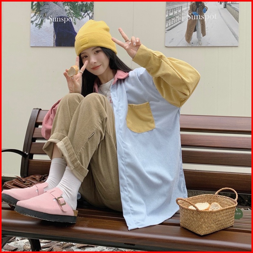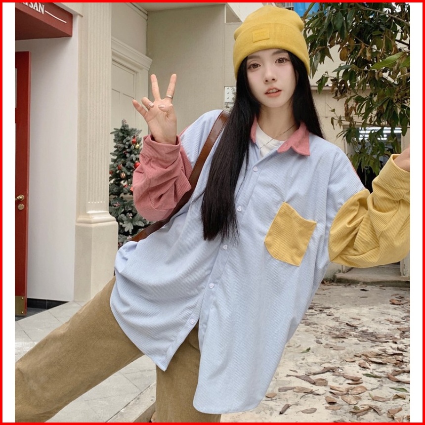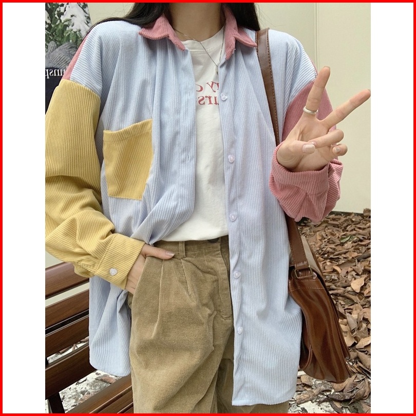 Kemeja Korduroi Tambal Sulam Warna-warni Untuk Wanita Atasan Kemeja Lengan Panjang Kasual Gaya Korea