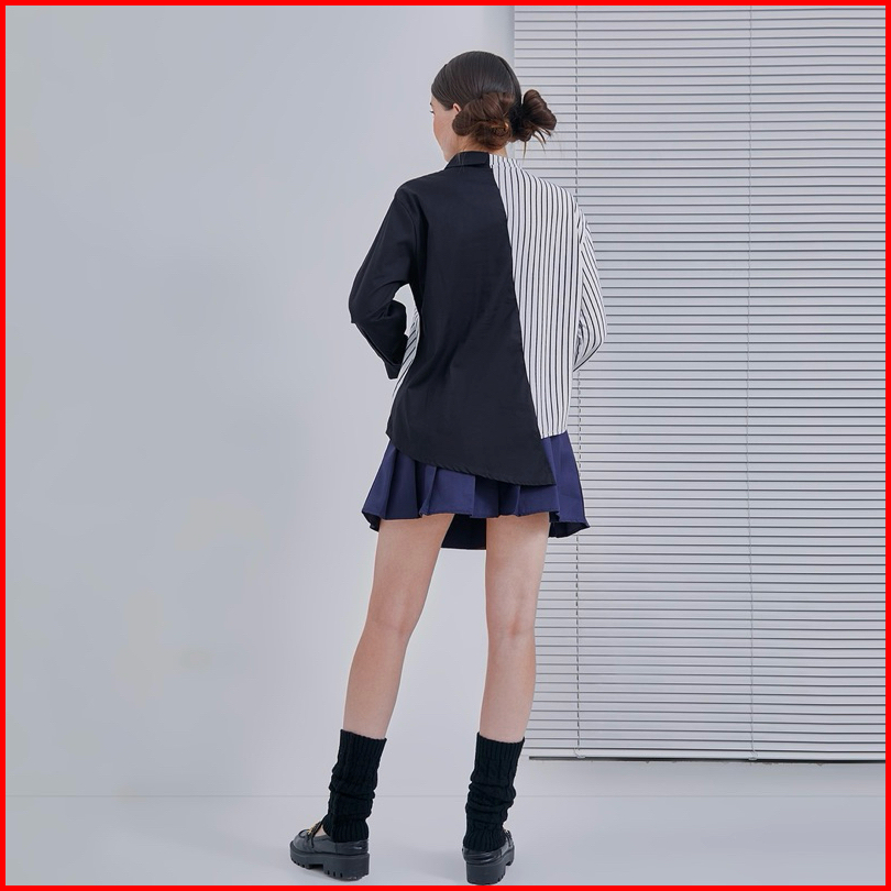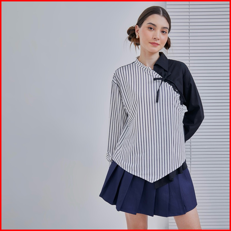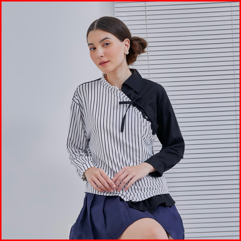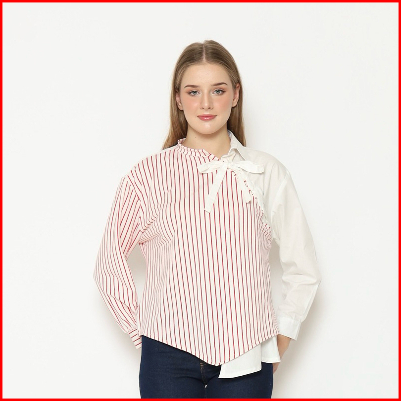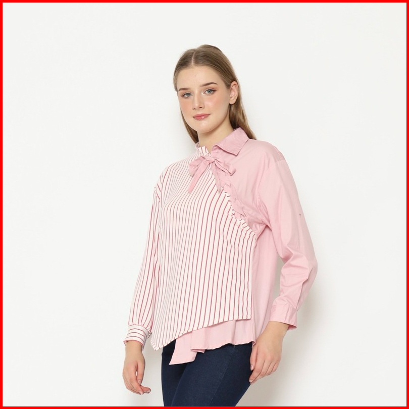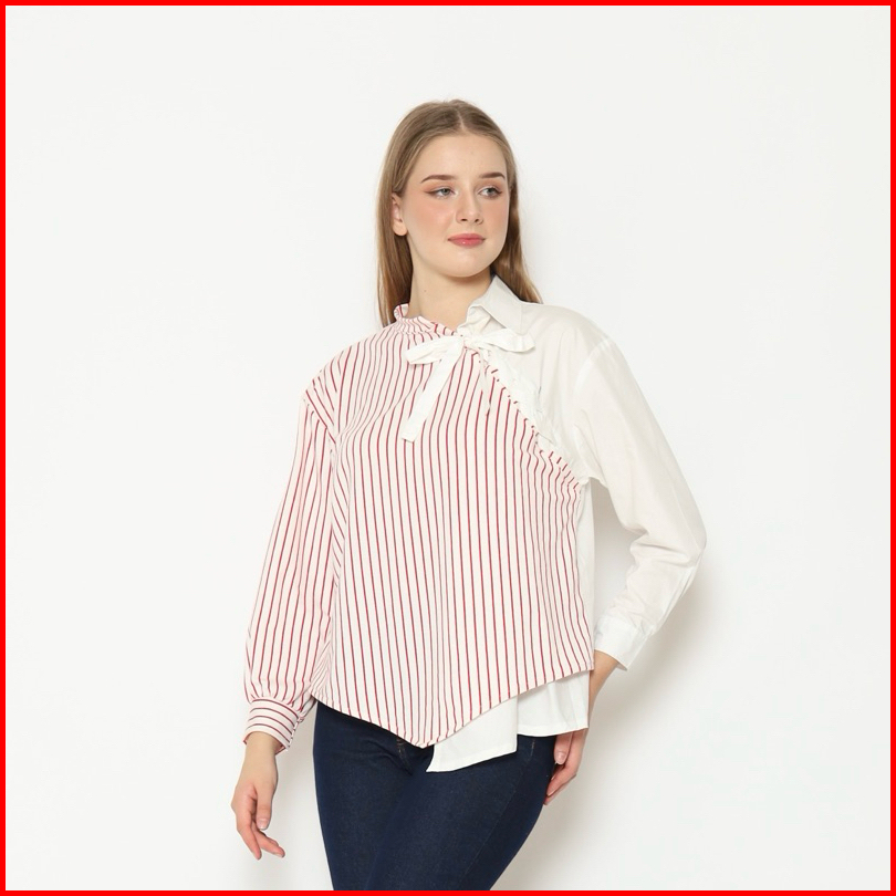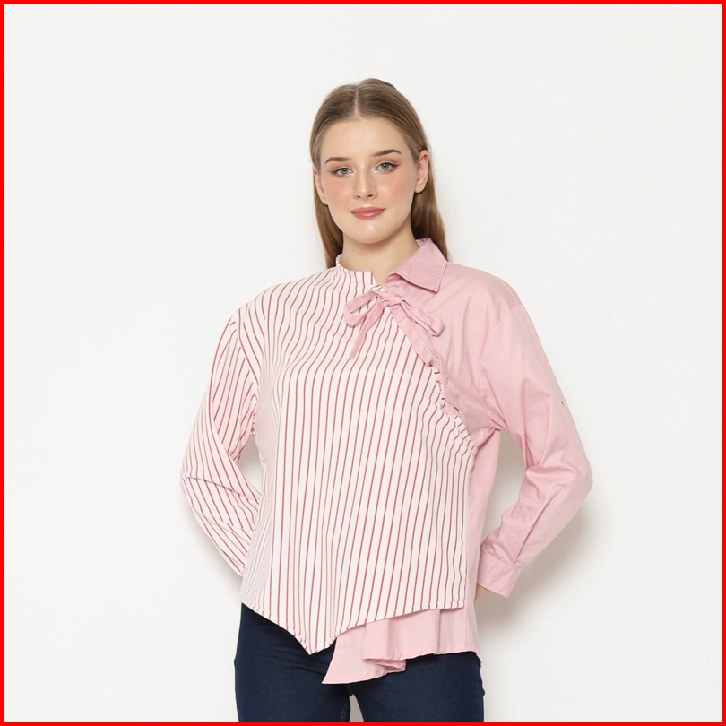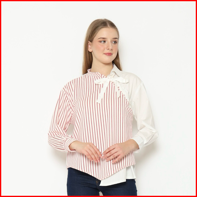 Senchi - Ayumi Stripes Combination Shirt Atasan Kemeja Salur Lucu Dengan Pita Atasan Kemeja Style Jepang Korea Atasan Ke
