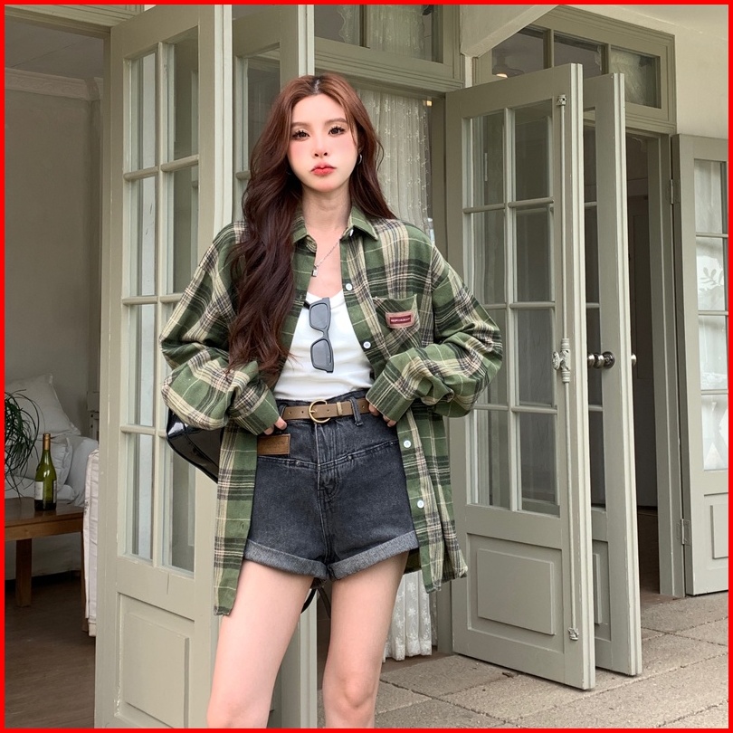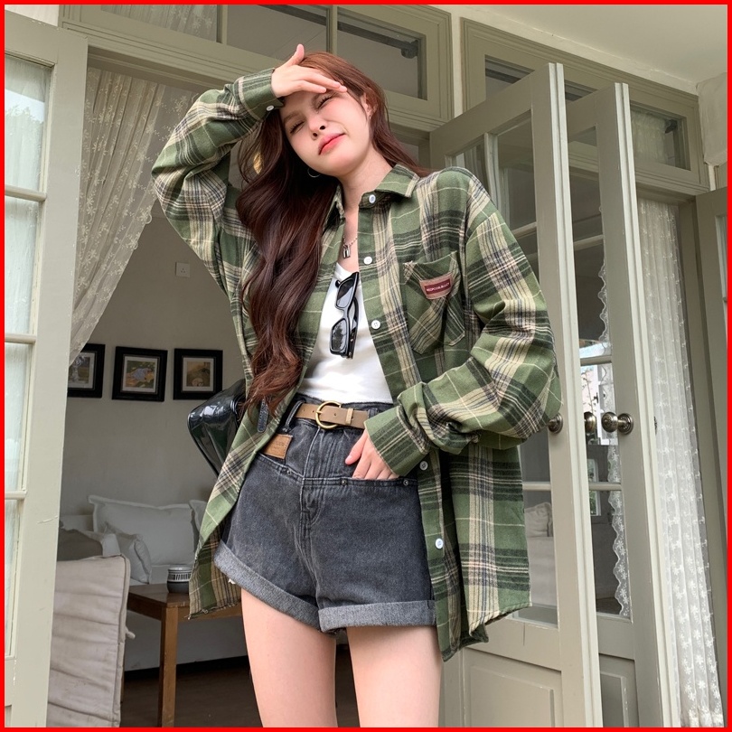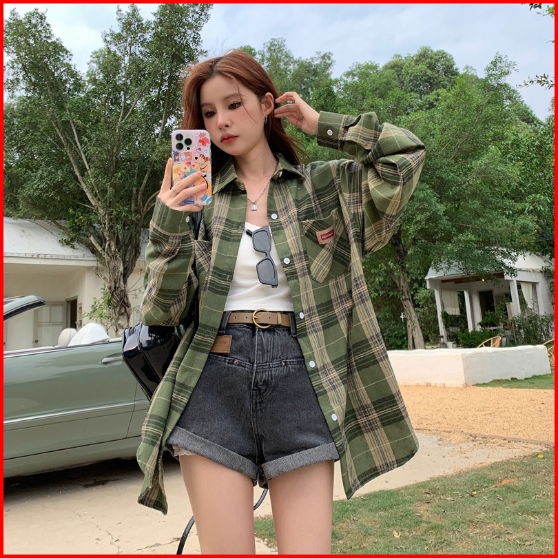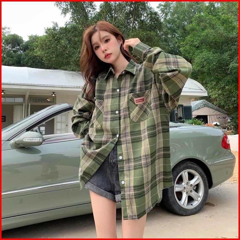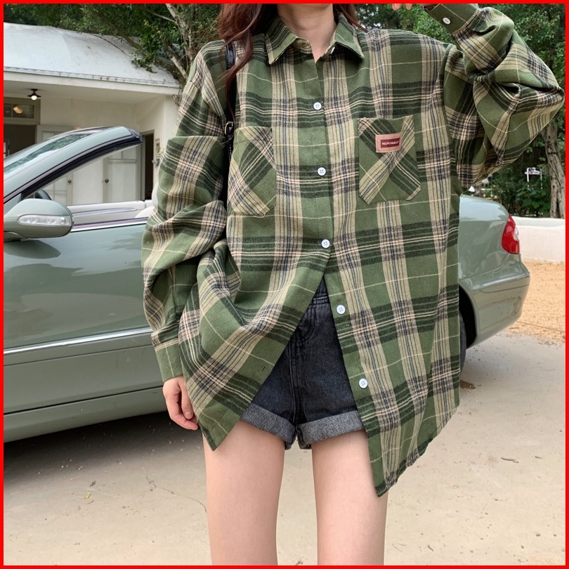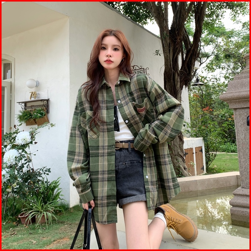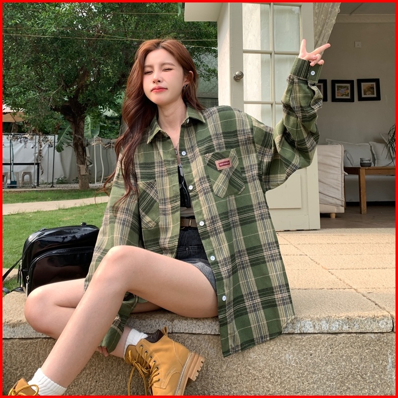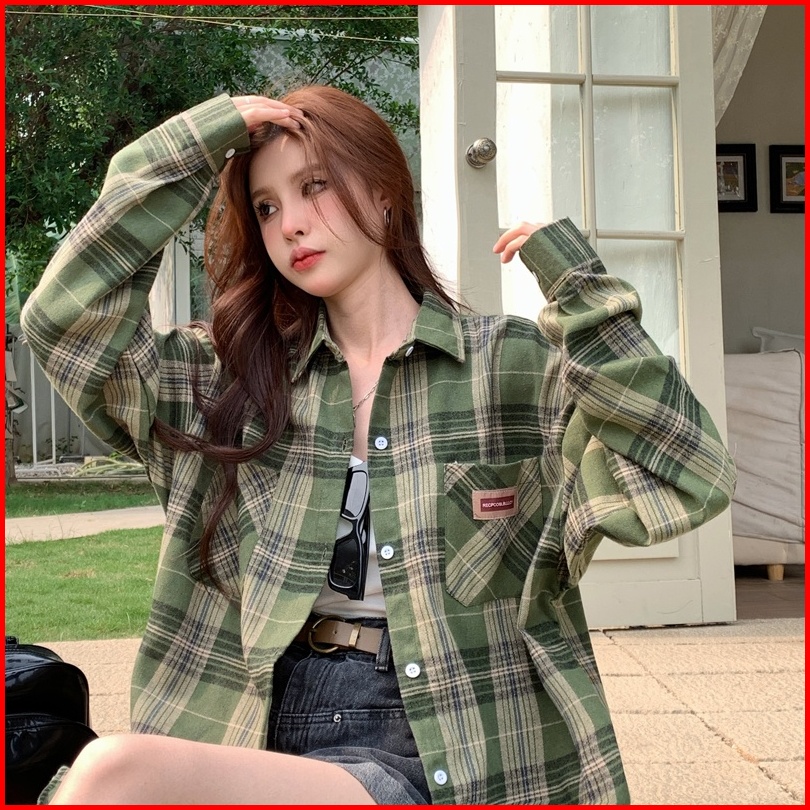 Kemeja Kotak-kotak Wanita Kemeja Lengan Panjang Kotak-kotak Hijau Longgar Baru Untuk Wanita