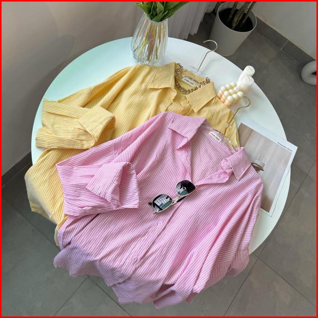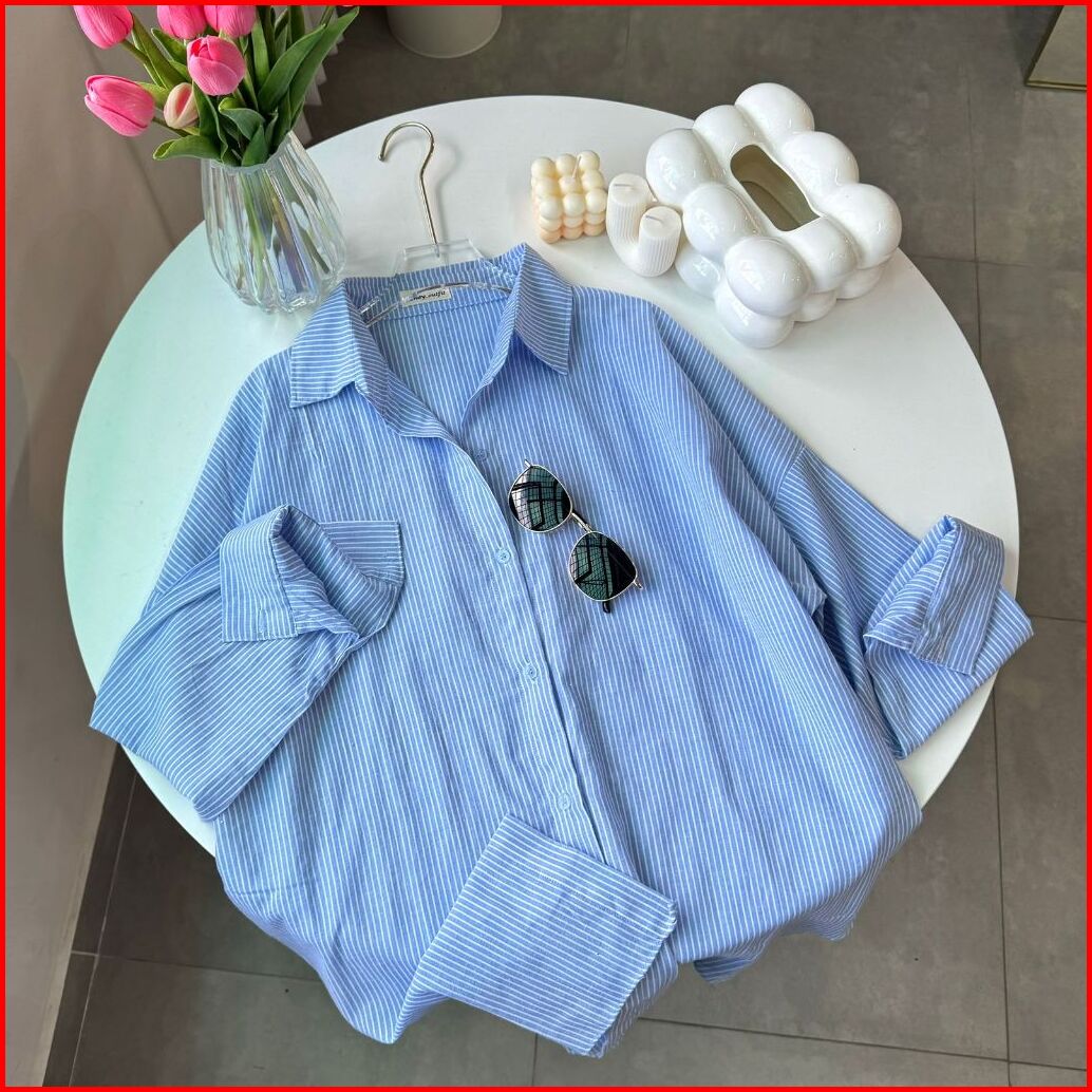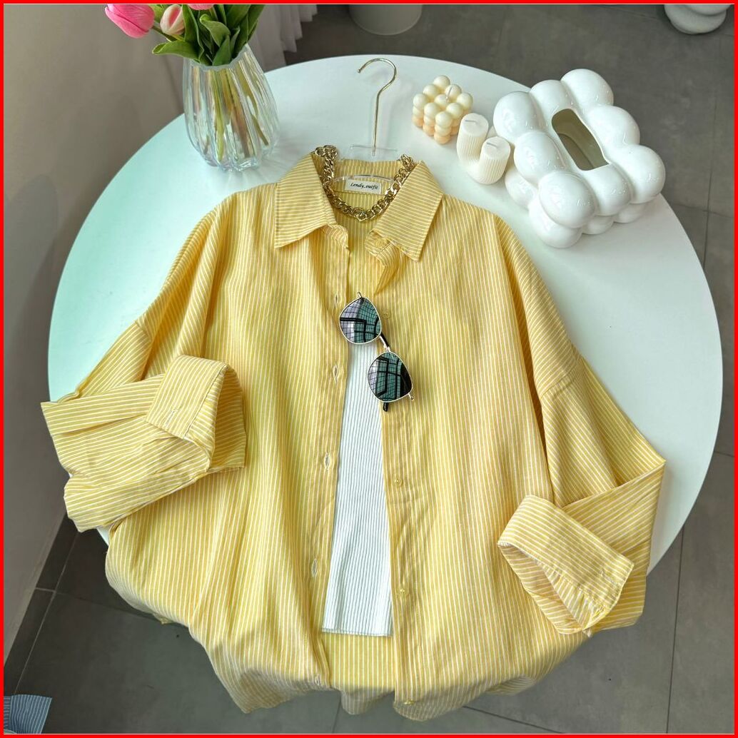Atasan Stripe Kemeja Wanita Korean Lengan Panjang Baju Oversize Salur Garis E.97