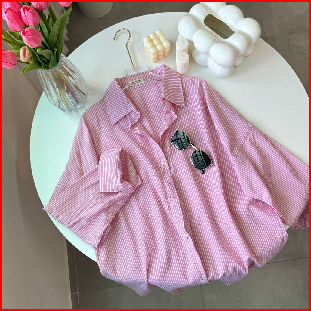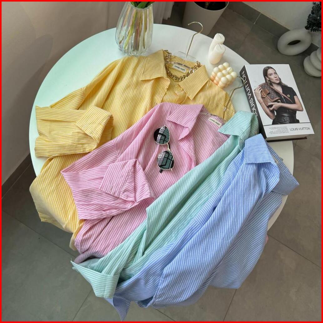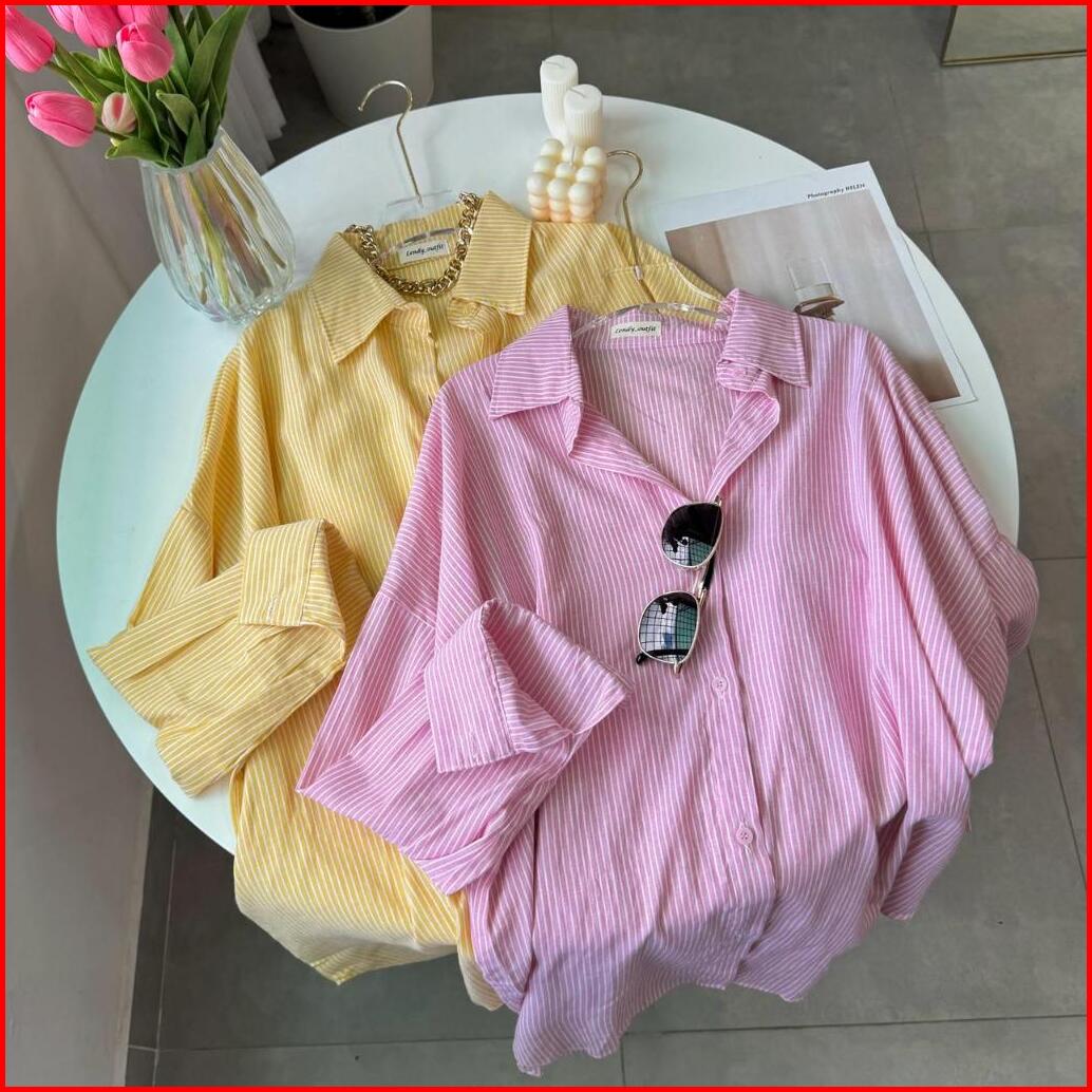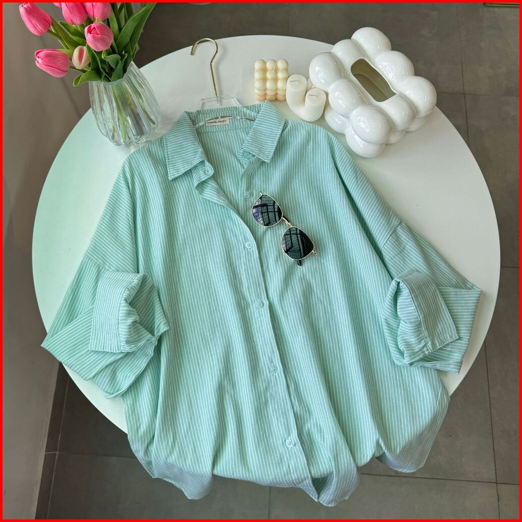 Atasan Stripe Kemeja Wanita Korean Lengan Panjang Baju Oversize Salur Garis E.97