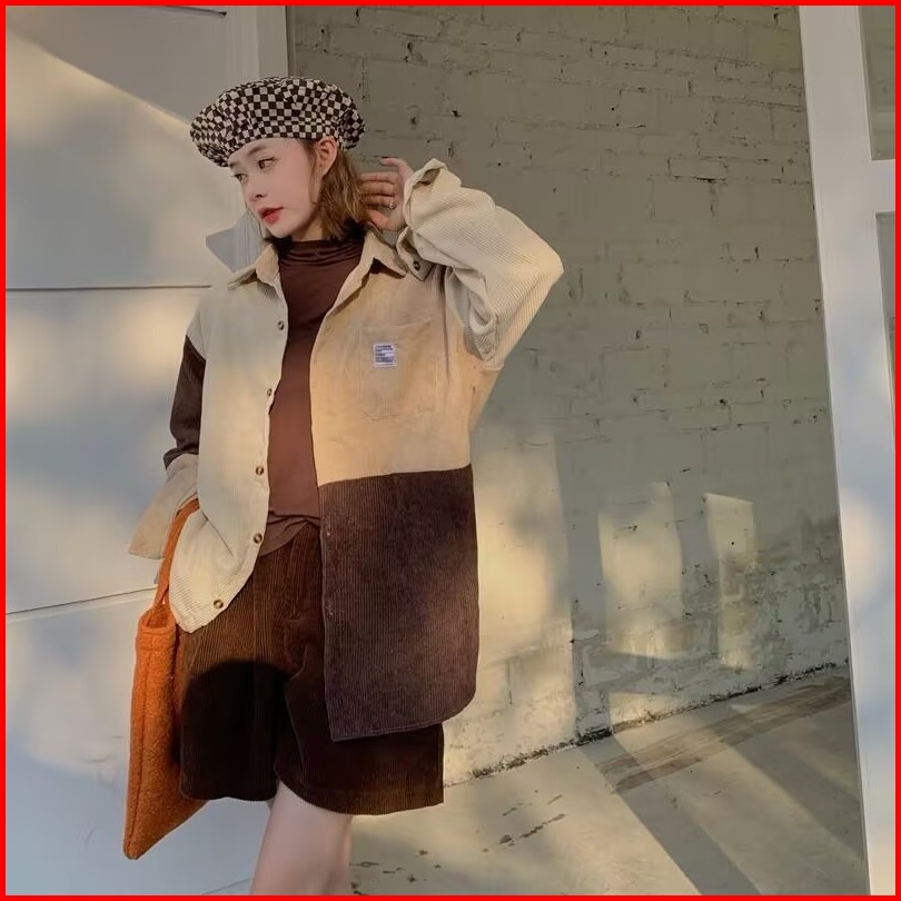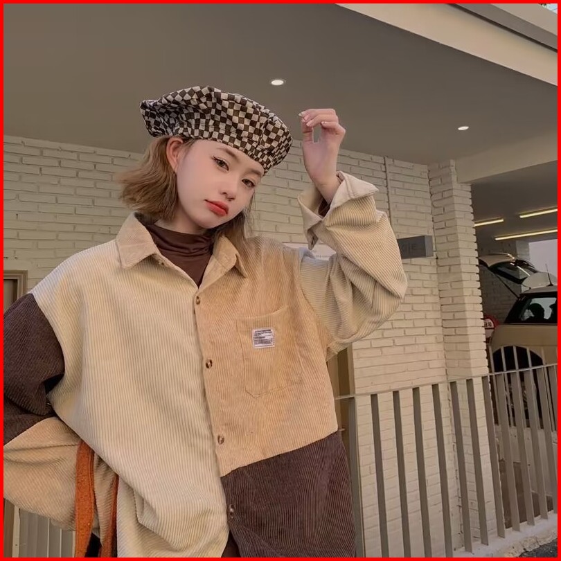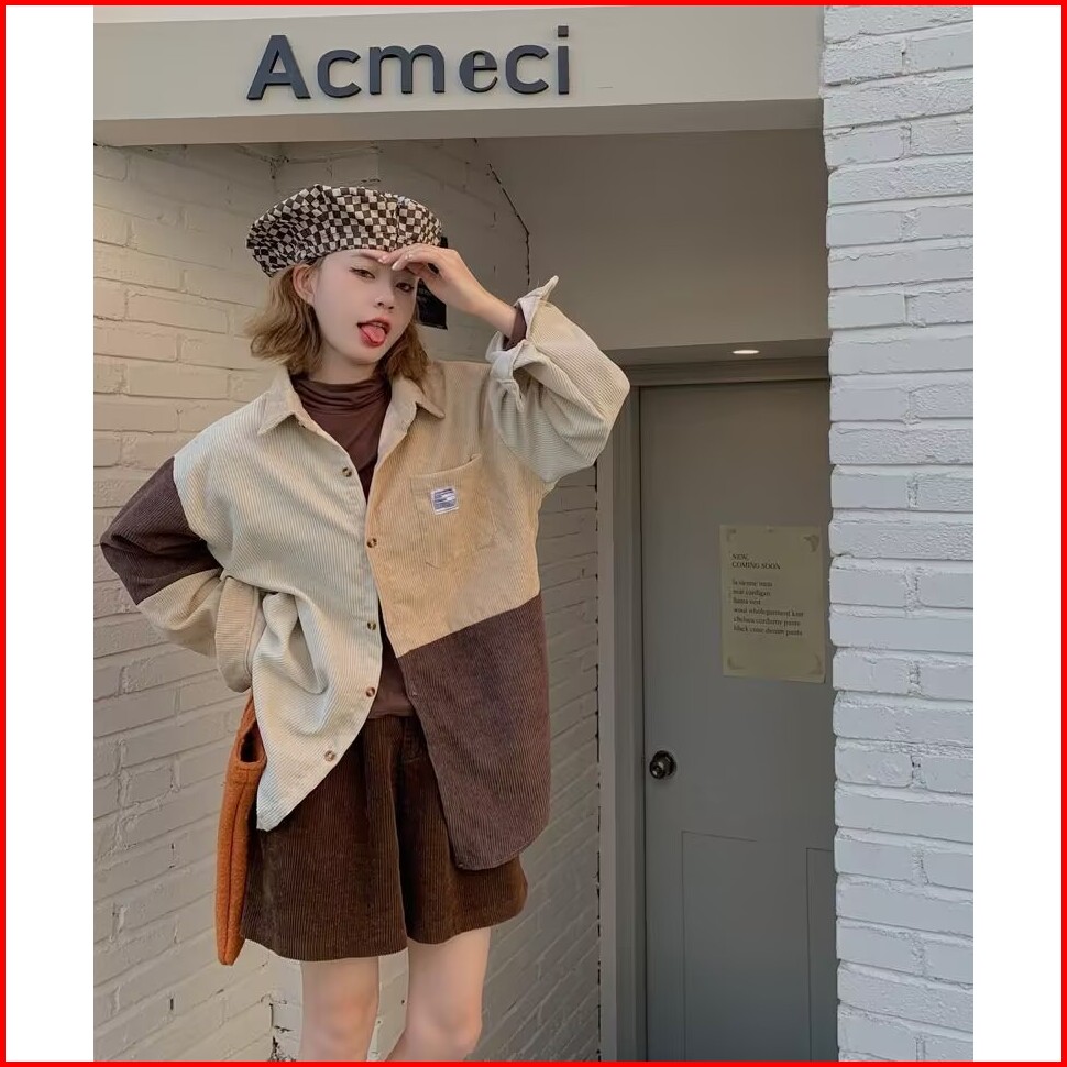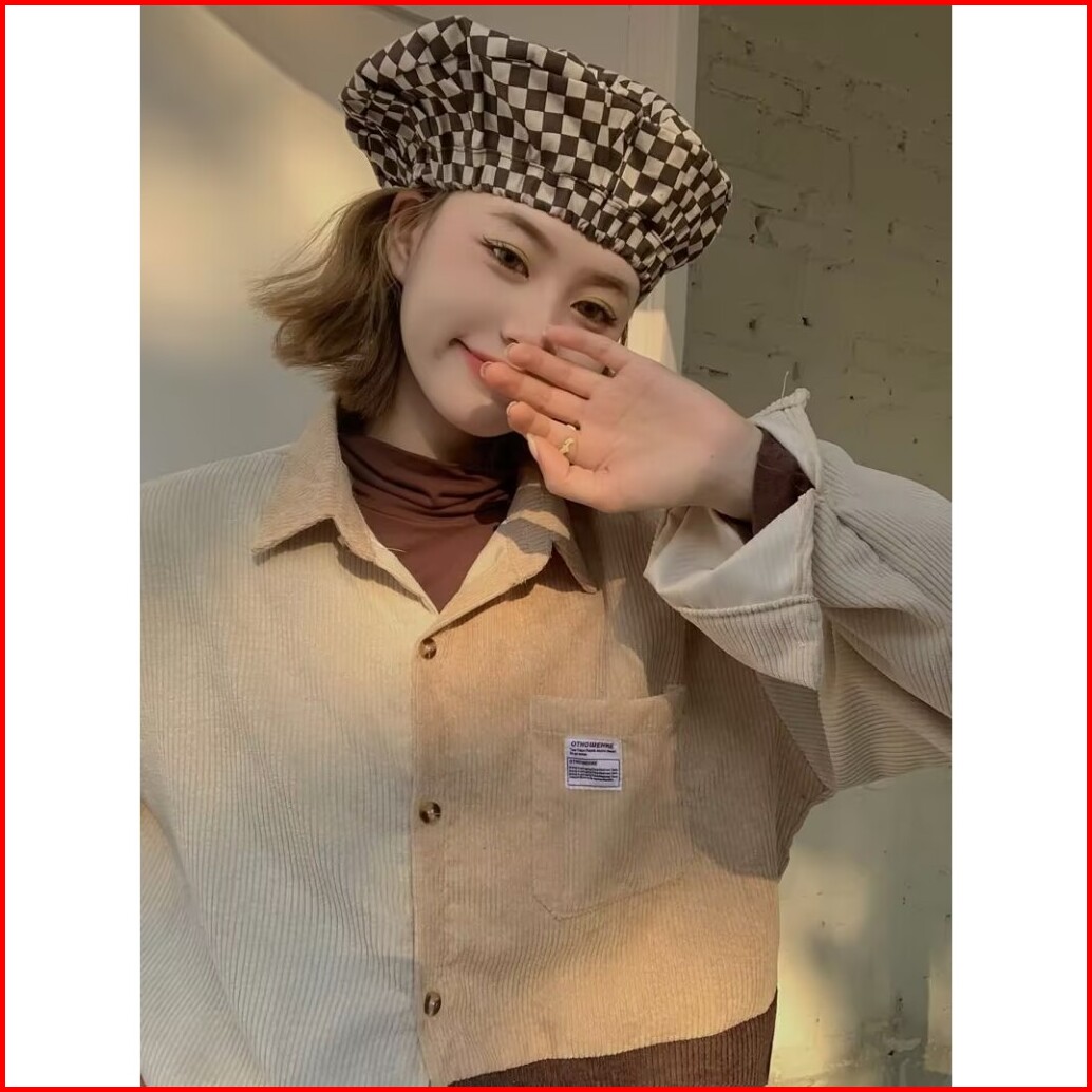 Kemeja Kotak-kotak Jahitan Longgar Dengan Warna Senada Atasan Wanita Lengan Panjang Setengah Panjang