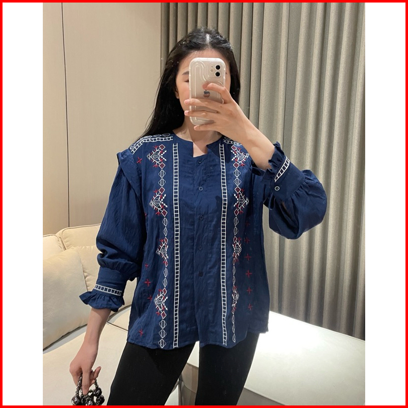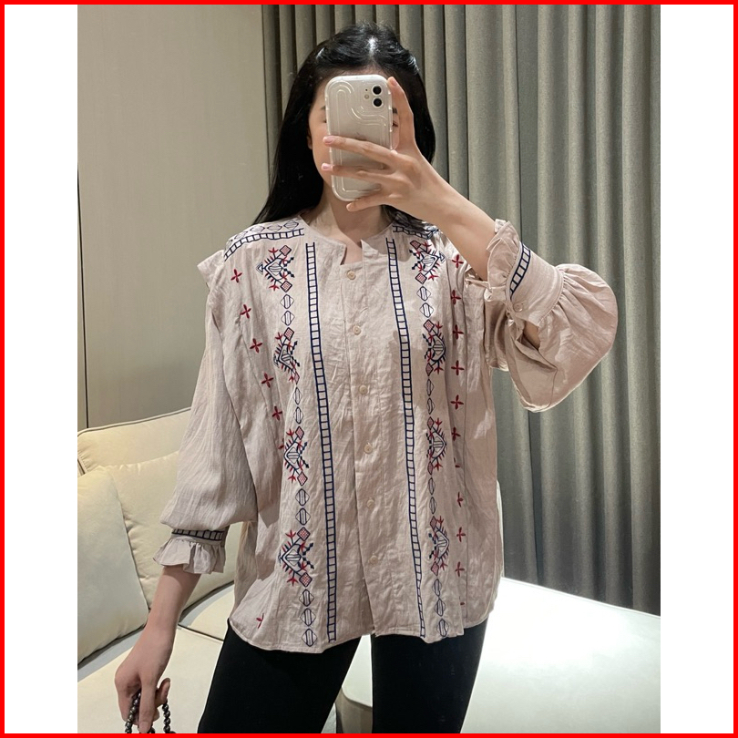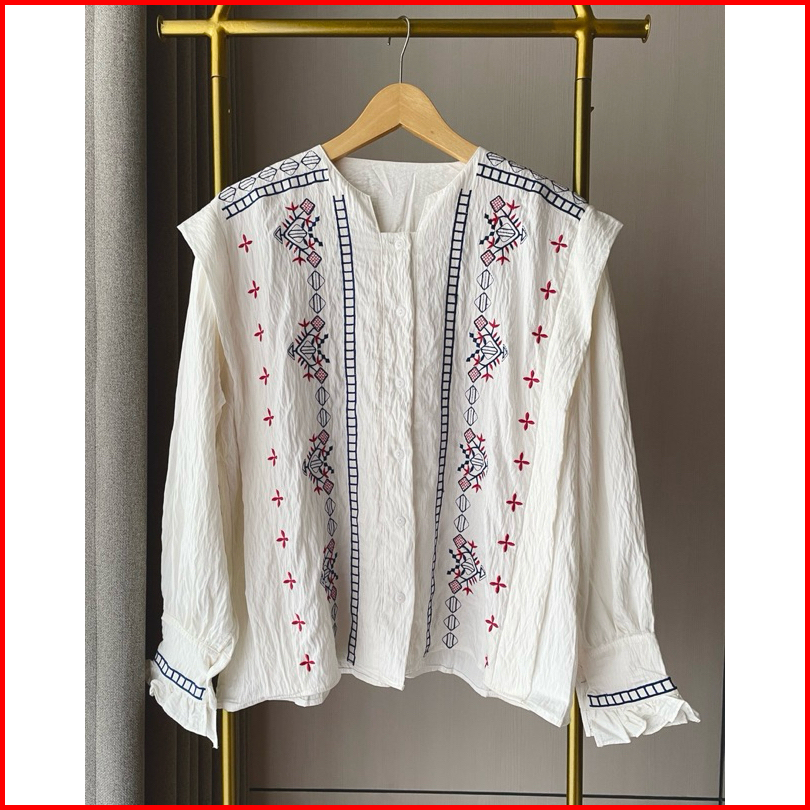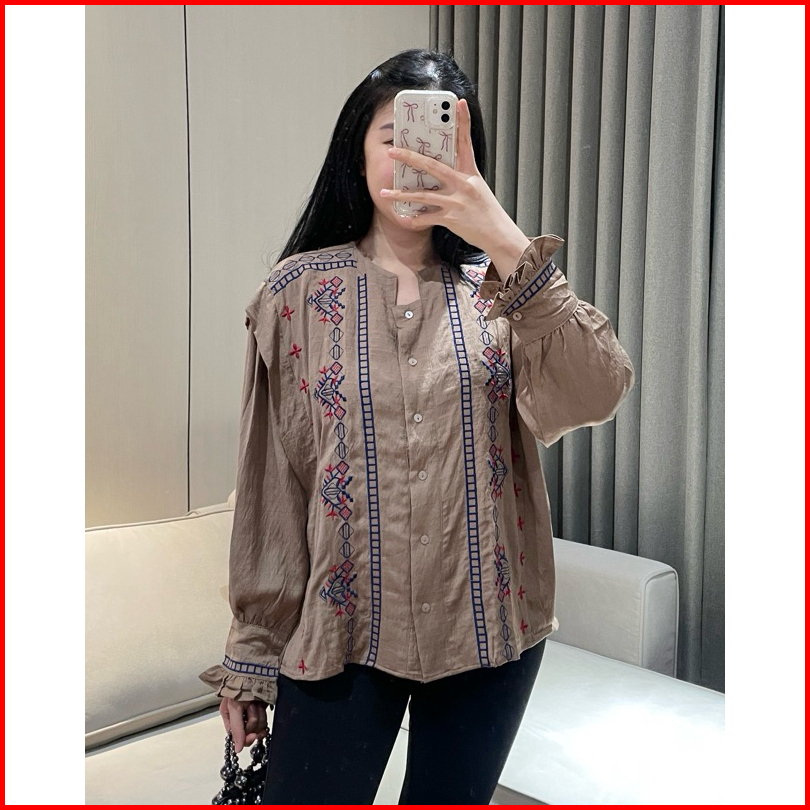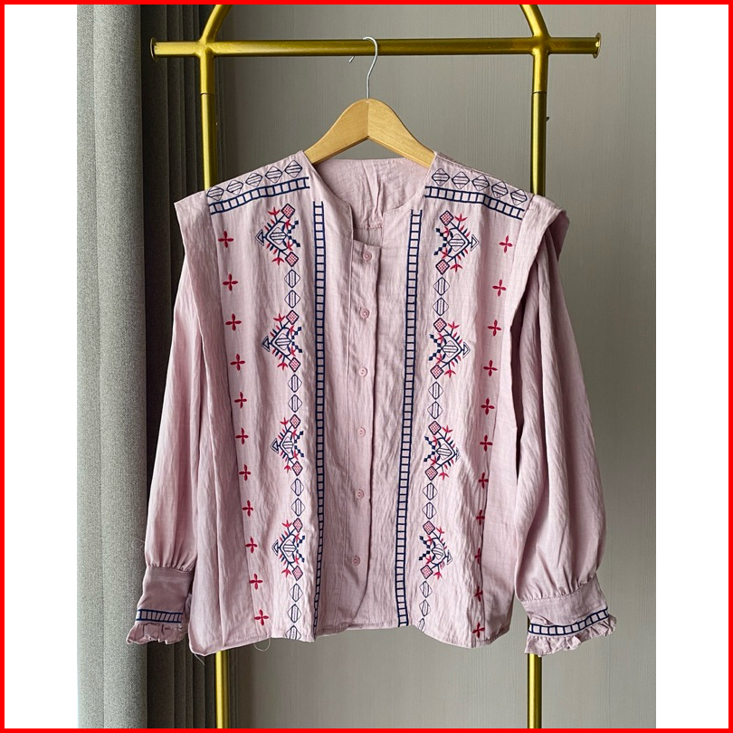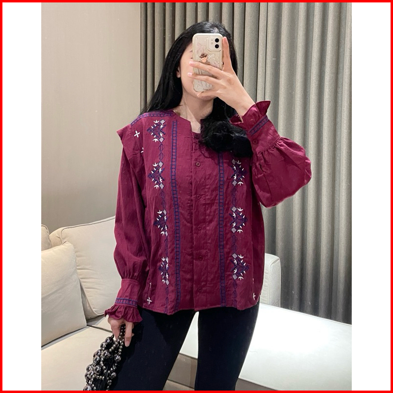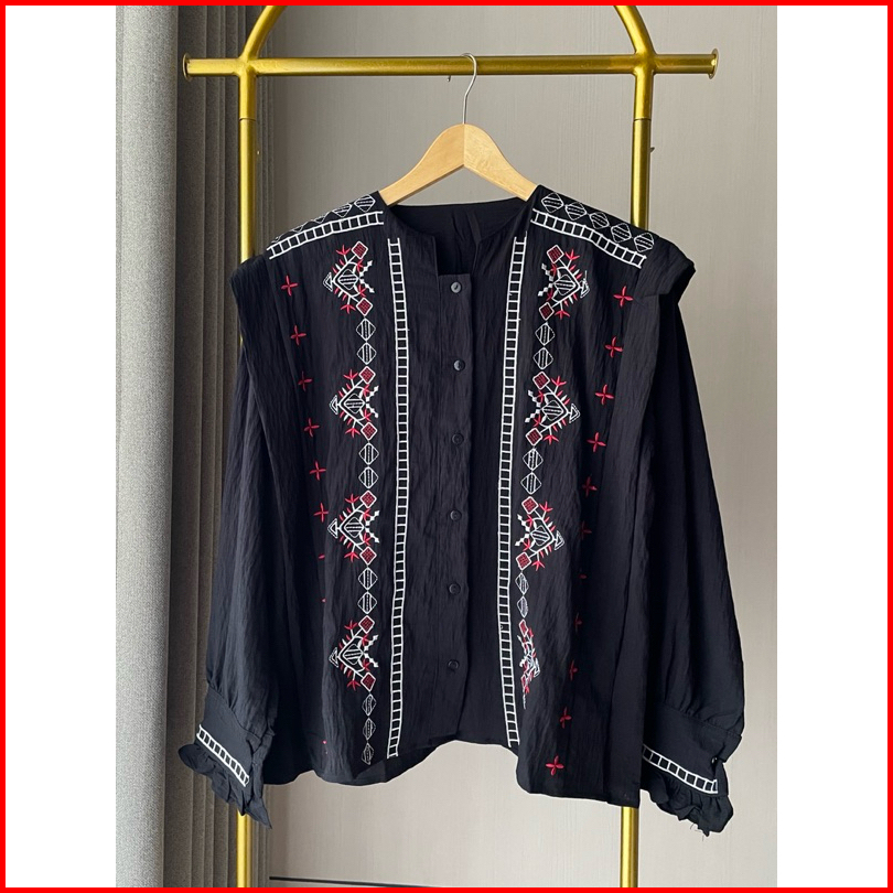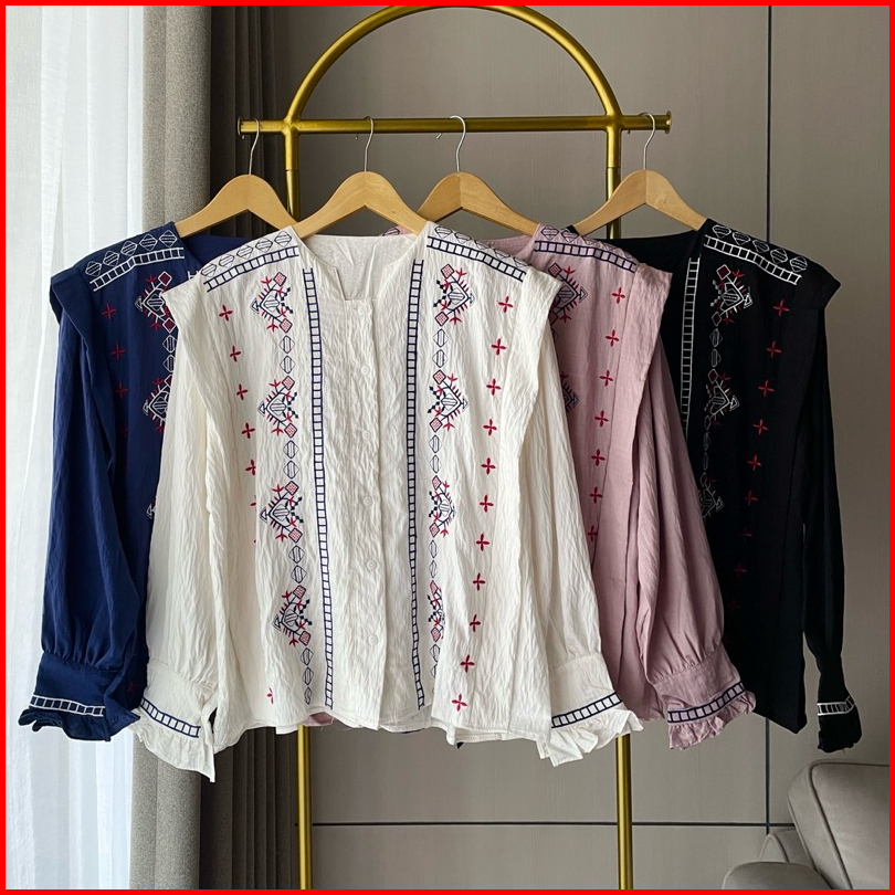 Eska - Malika Blouse Kemeja Kekinian Kantoran Mewah Terbaru Korean Style Motif Bordir Abstrak Lengan Balon Panjang Embro