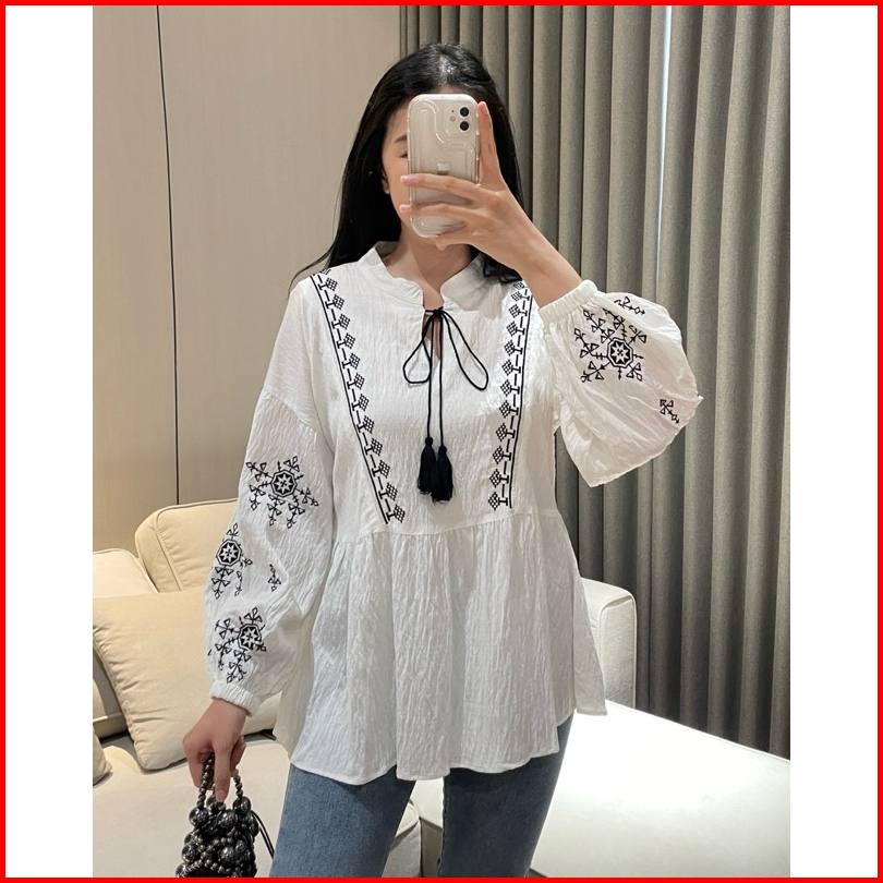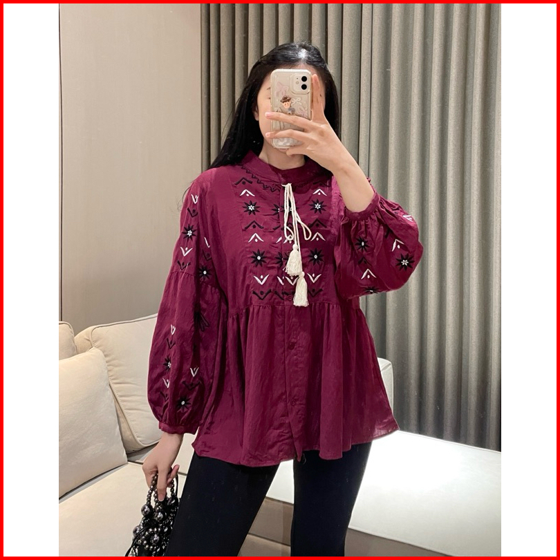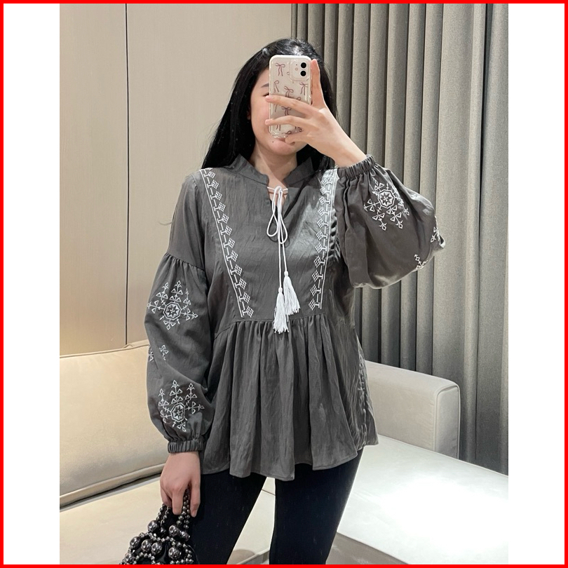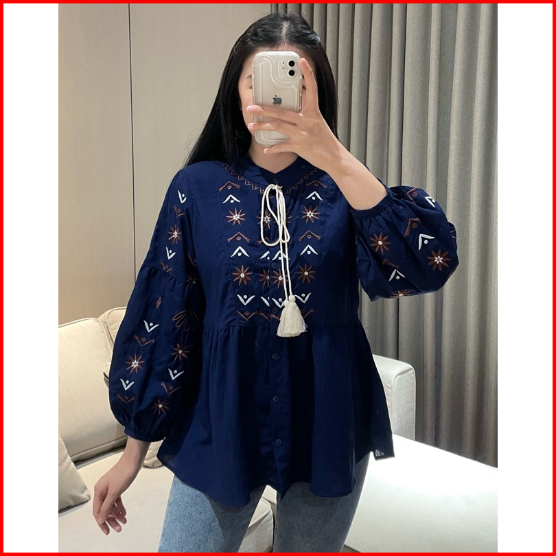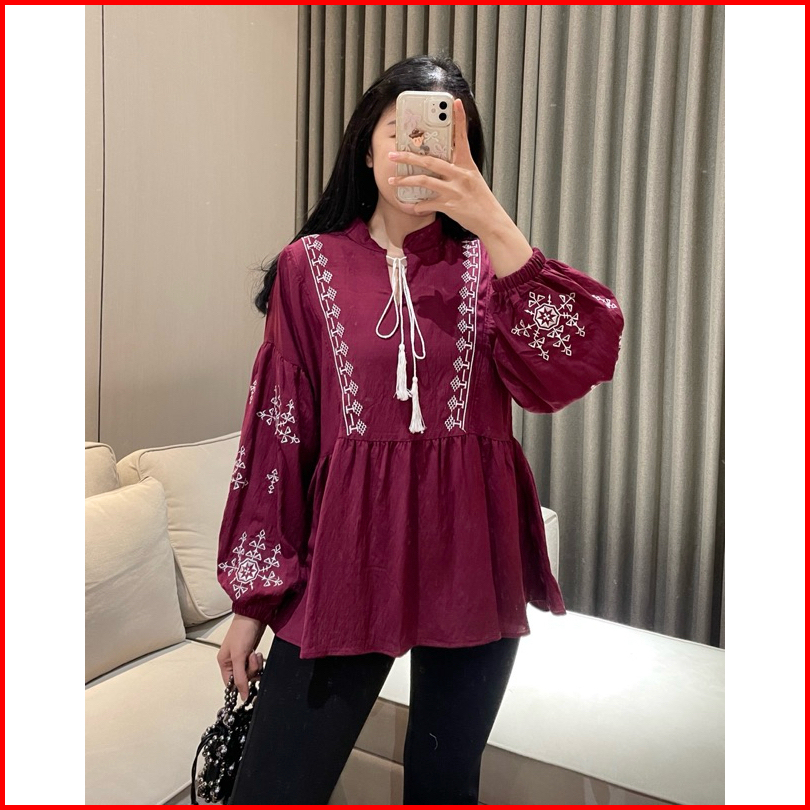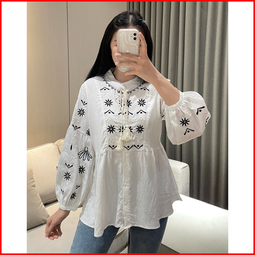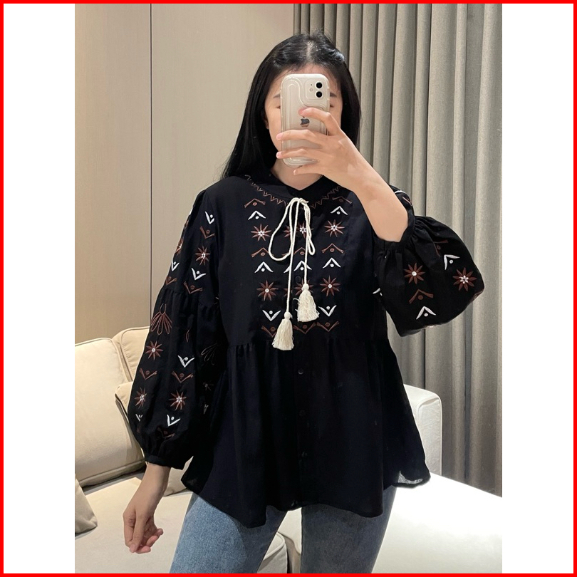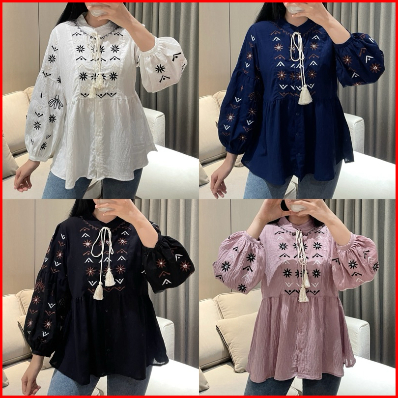 Eska - Rara Blouse Kemeja Wanita Bordir Bunga Lengan Balon Embroidery Motif Import Kekinian Kantoran Crinkle Airflow