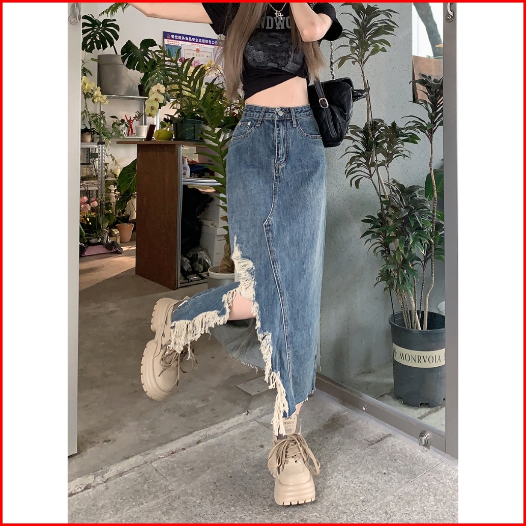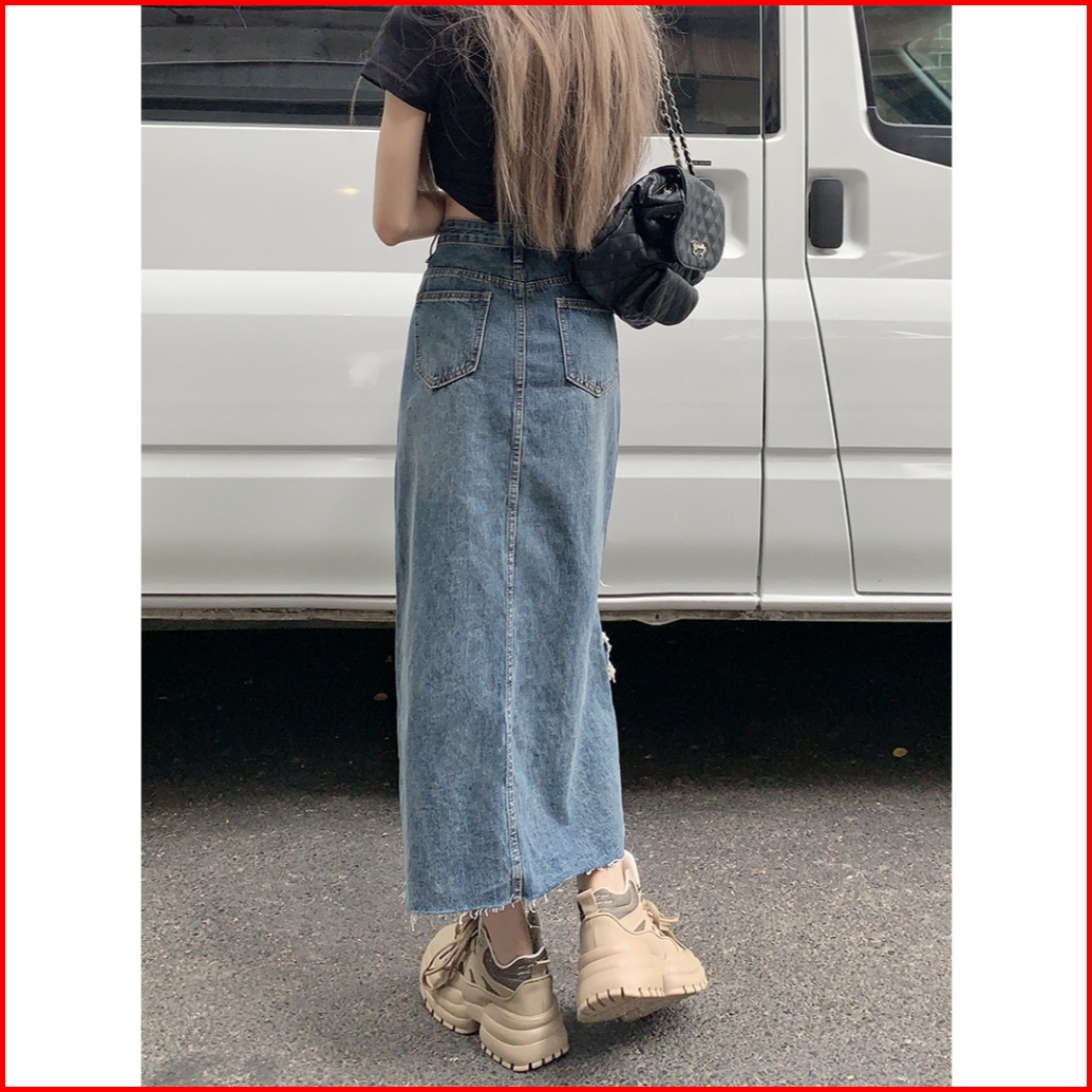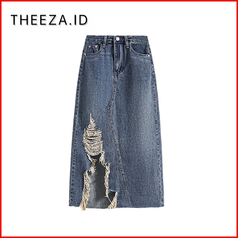 Theeza-korean Style Rok Denim Panjang Sedang Dengan Belahan Pinggang Tinggi A-line Wanita Rok Korean Style 0882
