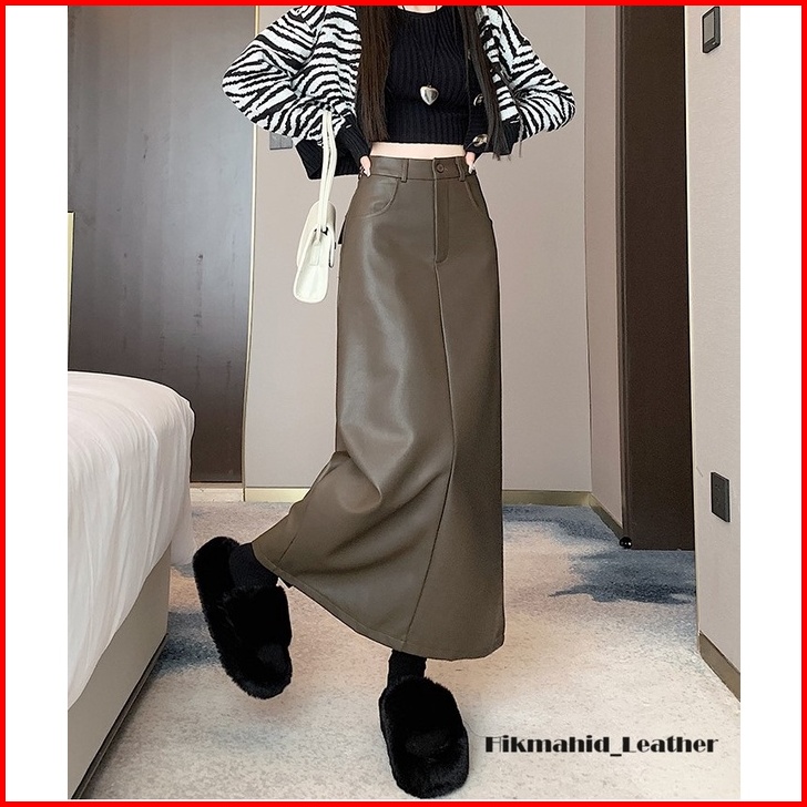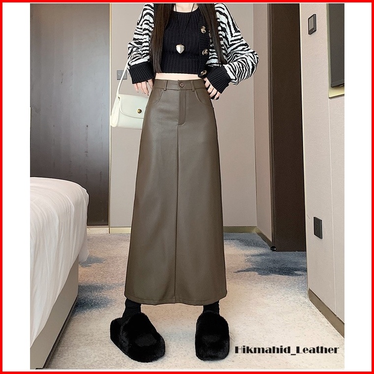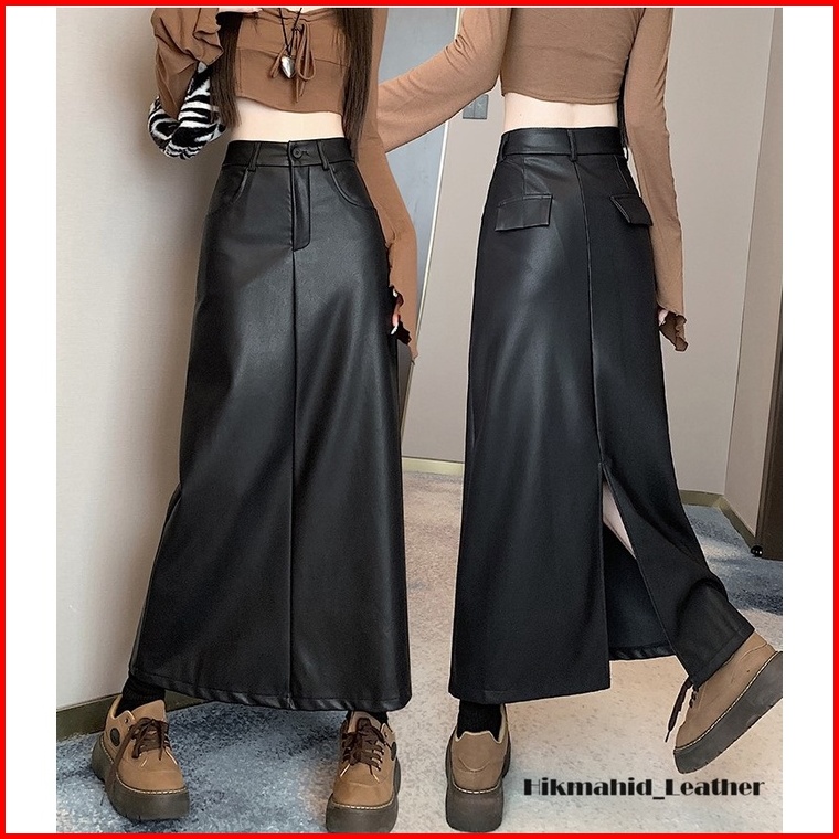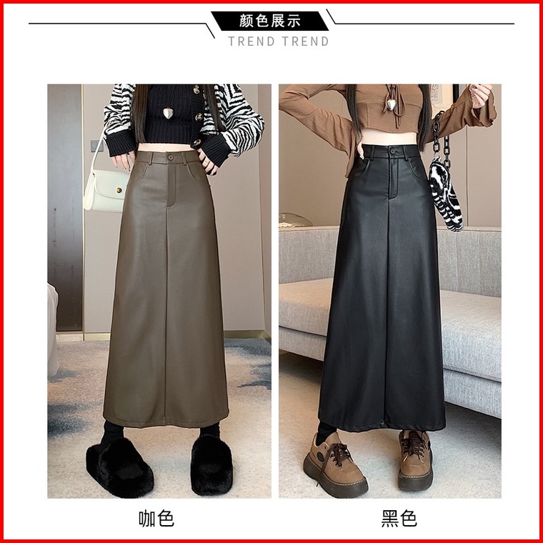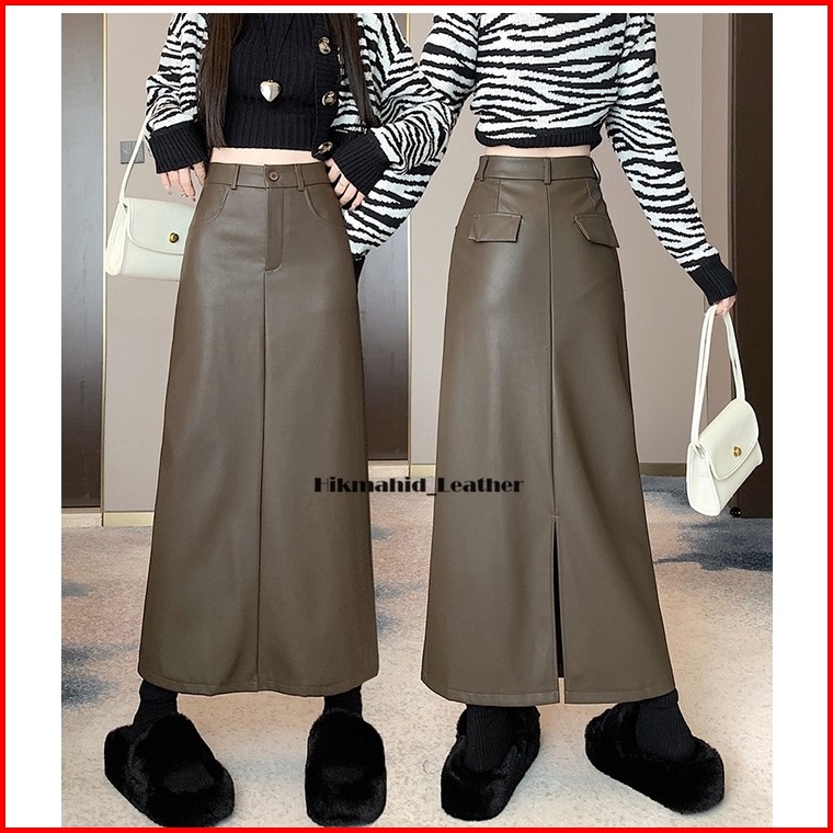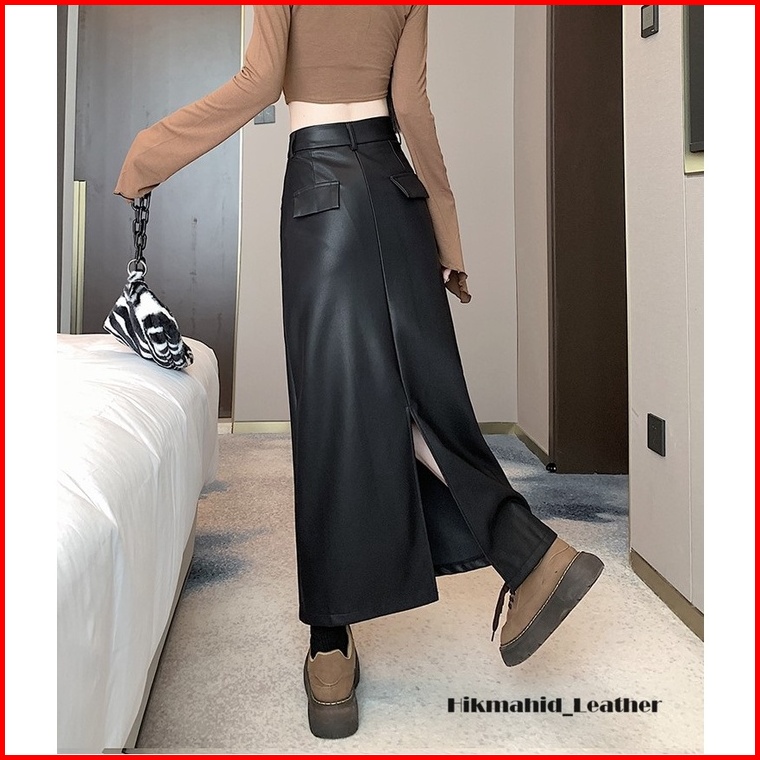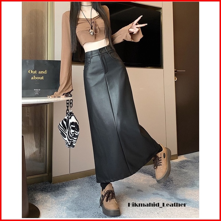 Rok Kulit Pu Midi Belah Belakang Antik Wanita Model Korea Modern Style 2023 Musim Gugur Musim Dingin Pinggang Tinggi Rok