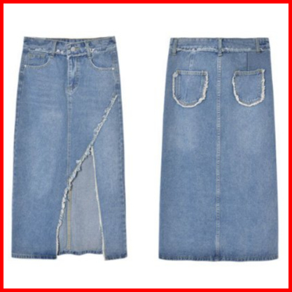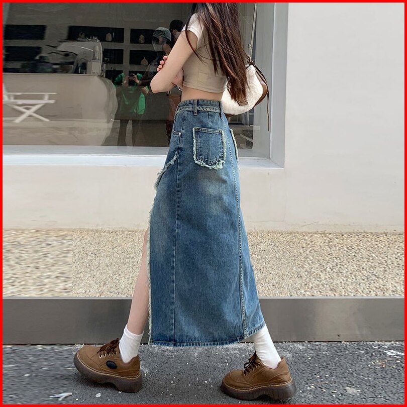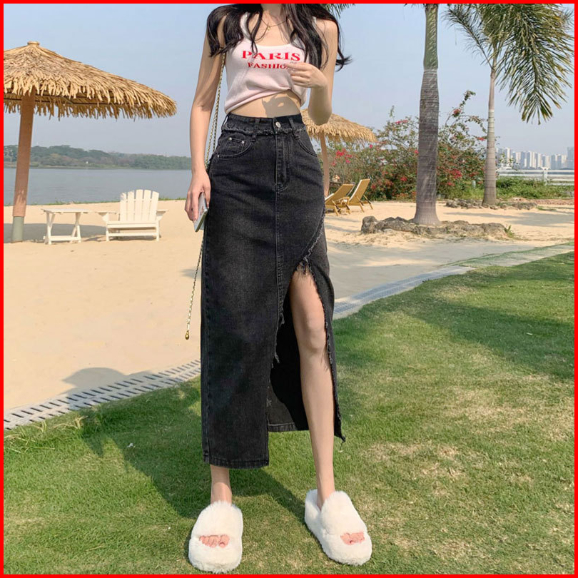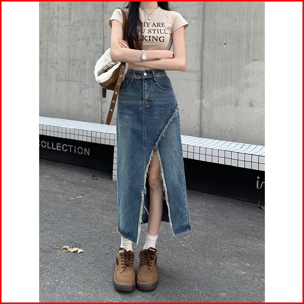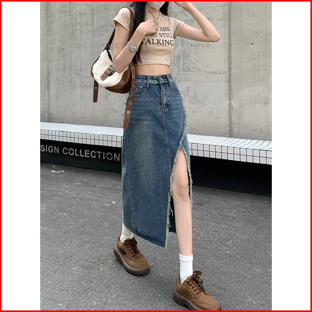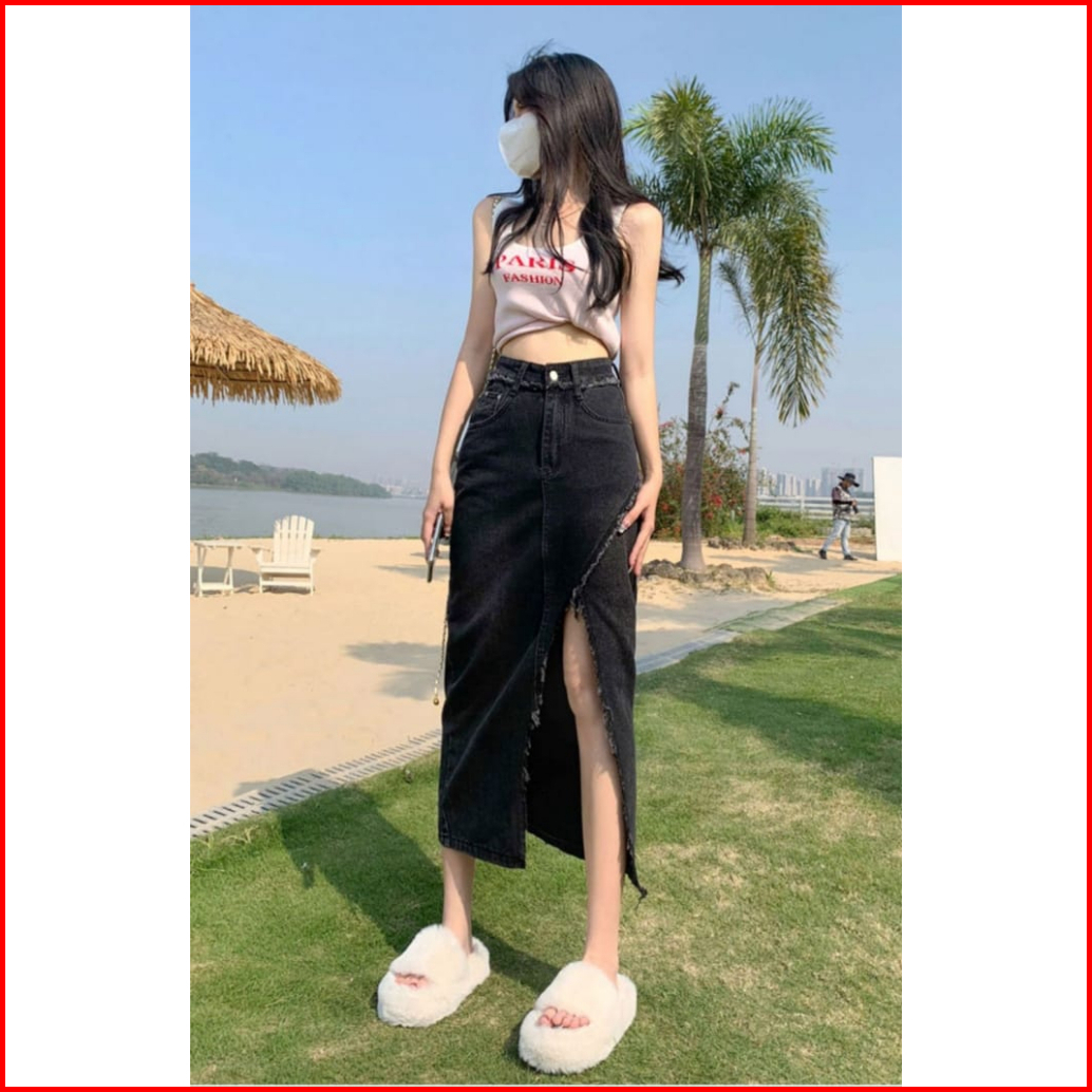 Denim Skirt Highwaist Rok Jeans A-line Midi Wanita Rok Slit Belah Korean Style