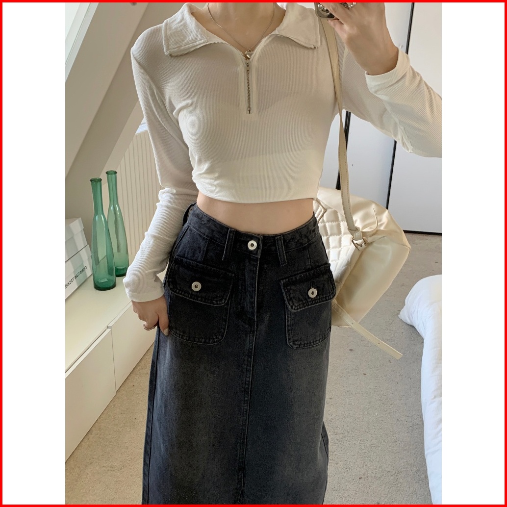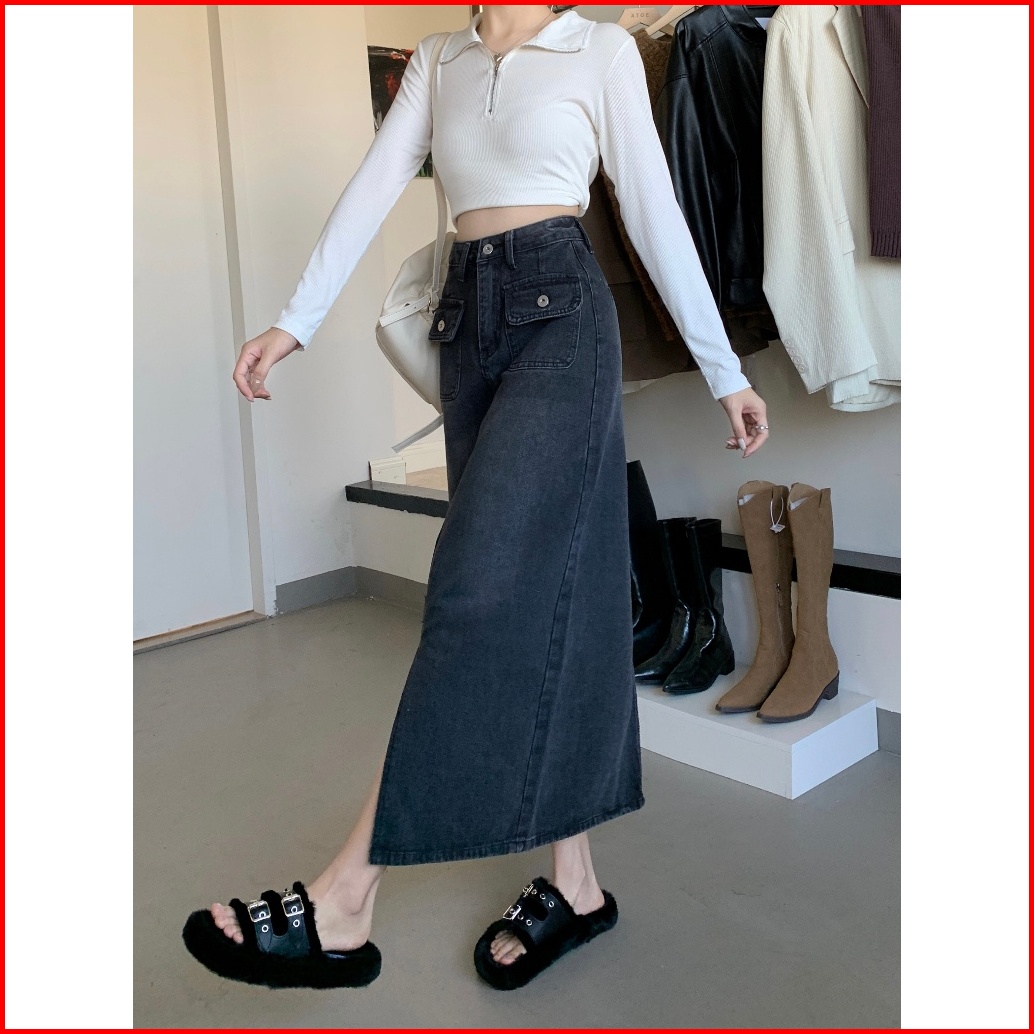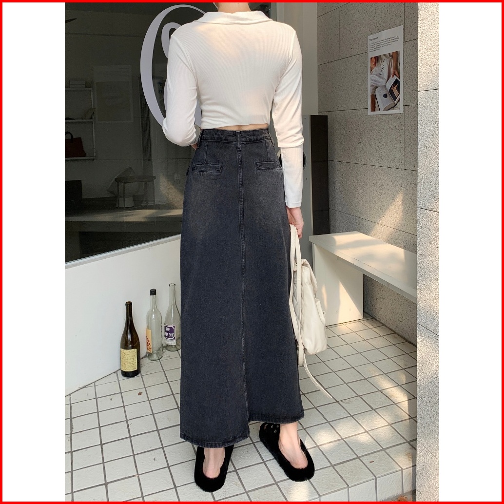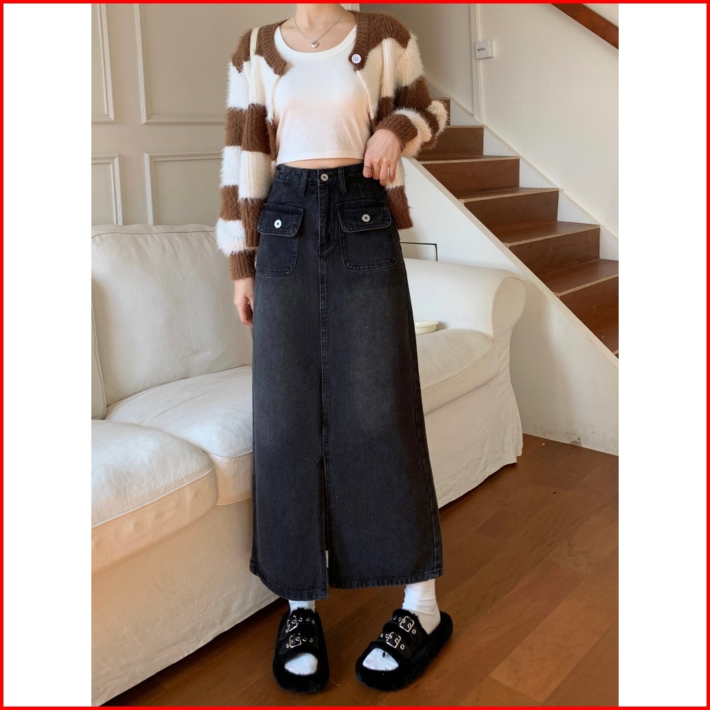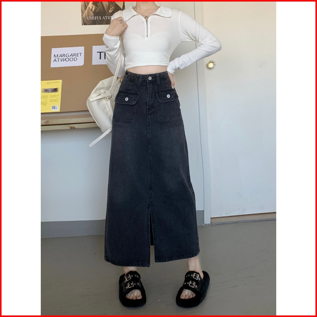 Ekouaer Button Pocket Rok Denim Panjang Wanita Korean Style Slit A-line Skirt Midi Rok Korean Style Rok Jeans Panjang Je