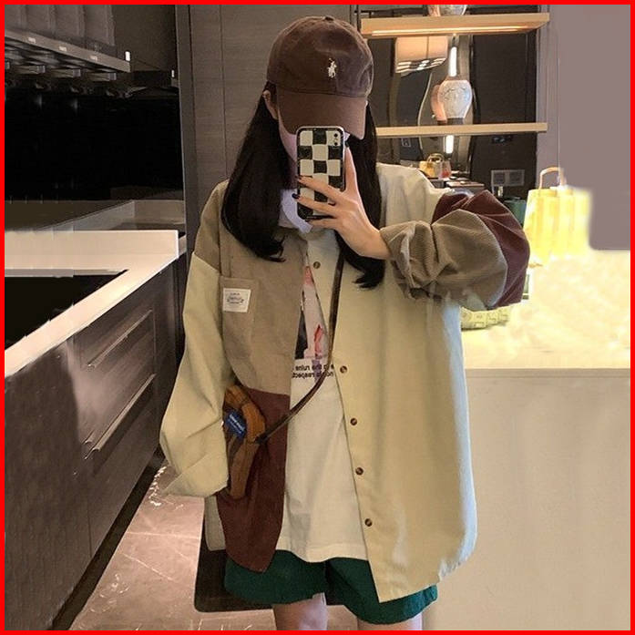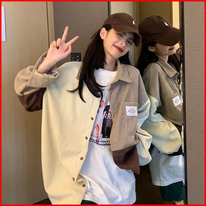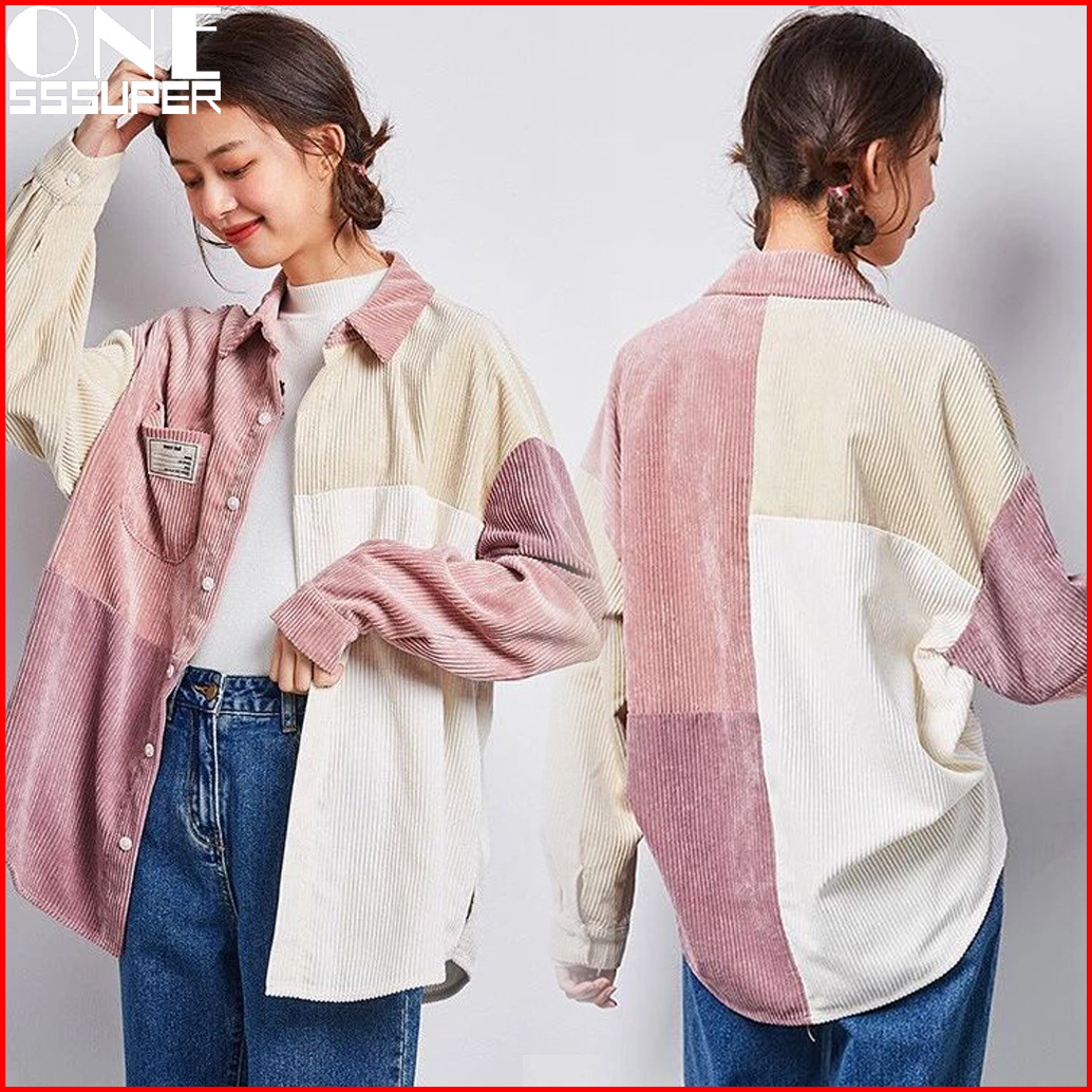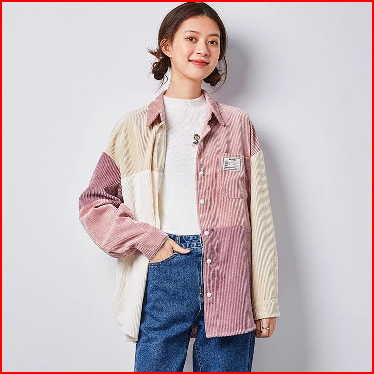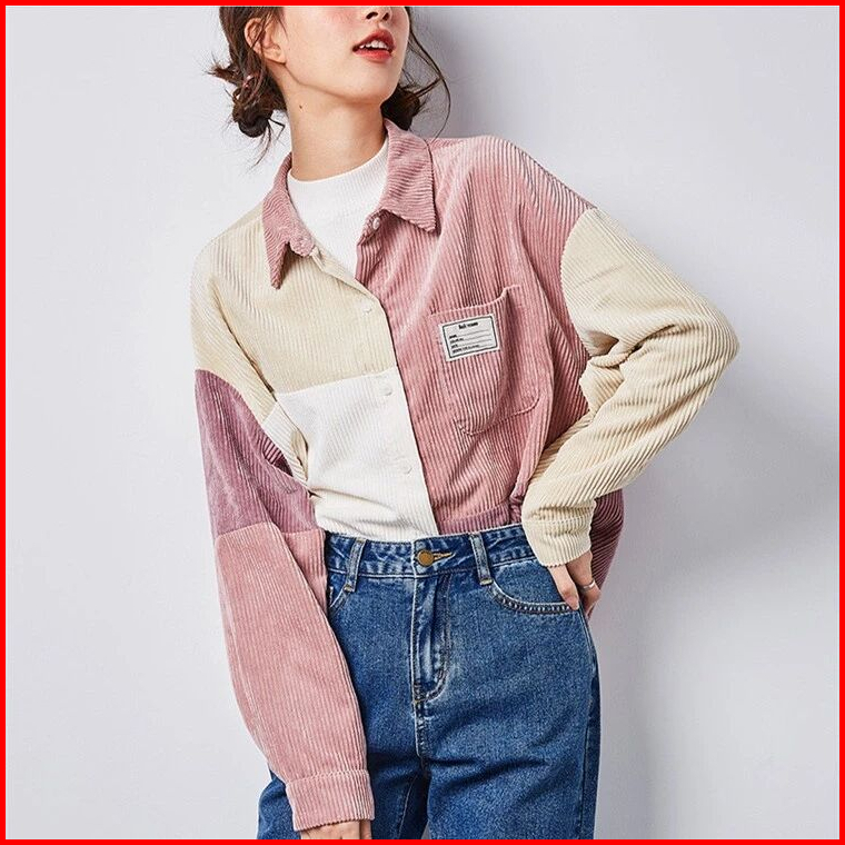 Kemeja Korduroi Gaya Korea Retro Warna Kontras Lengan Panjang Atasan Wanita Jahitan Pink