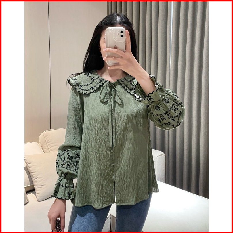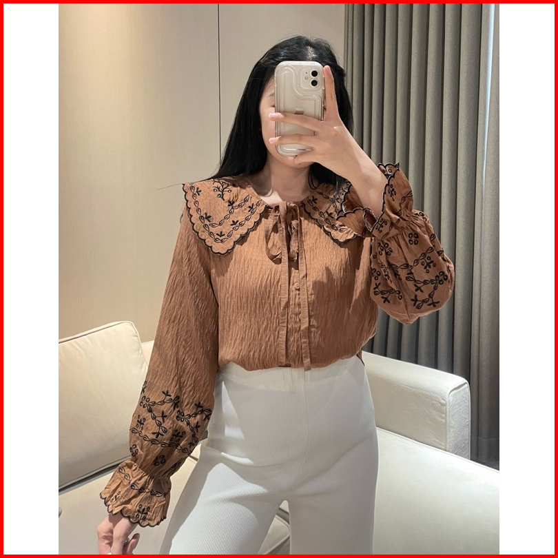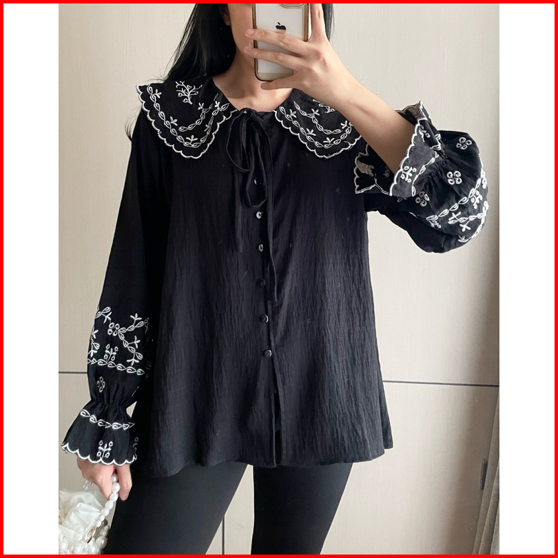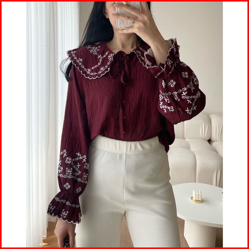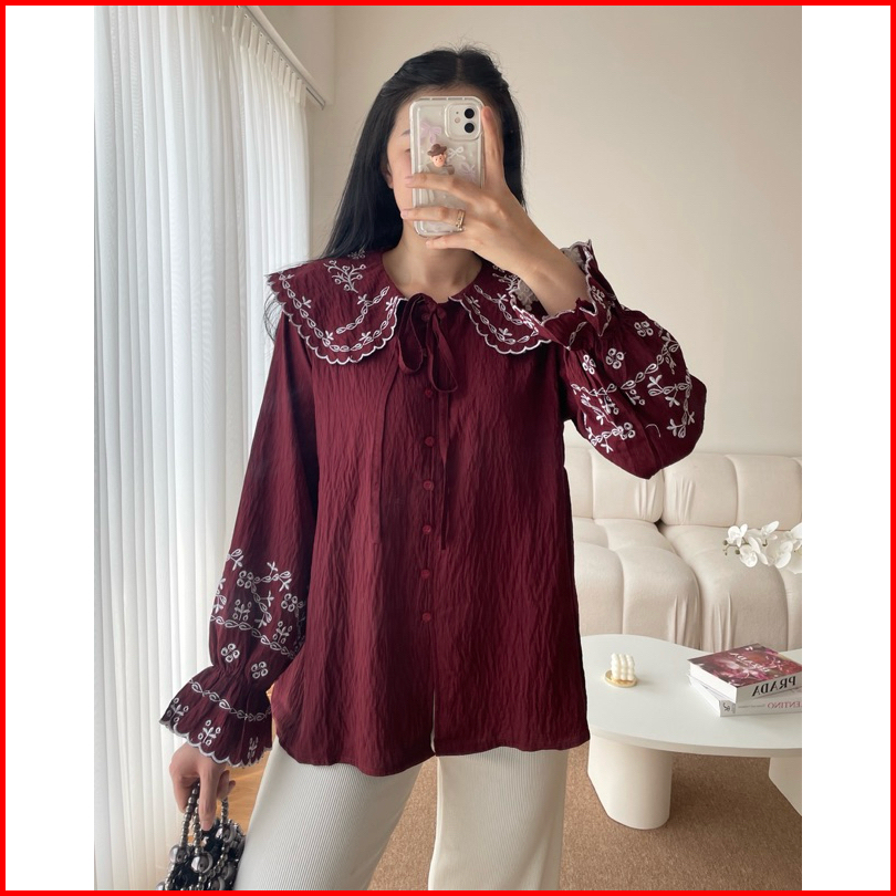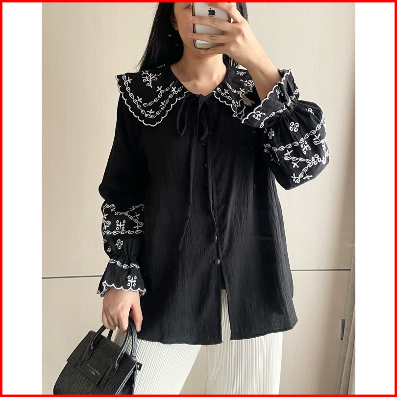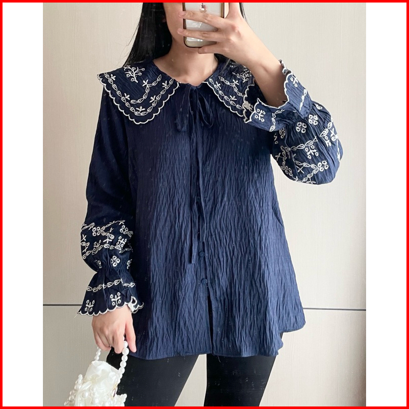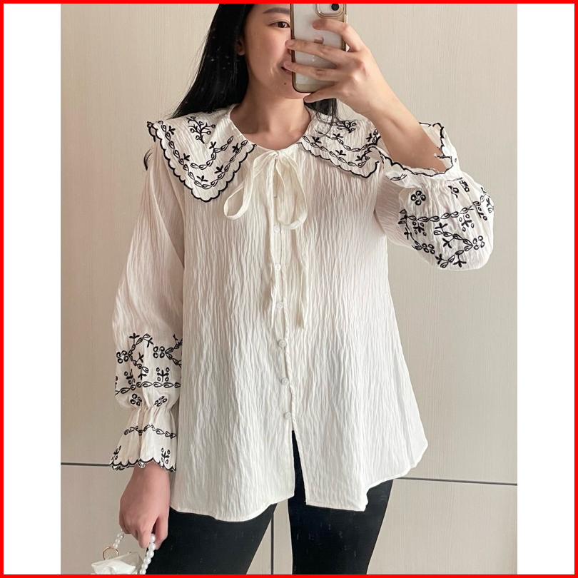 Eska - Jisoo Blouse Kemeja Bordir Bunga Boho Korean Style Crinkle Kekinian Mewah Terbaru Kantoran Elegan Embroidery