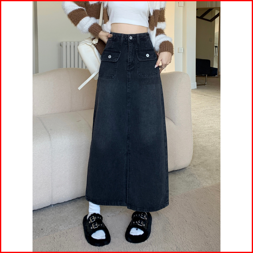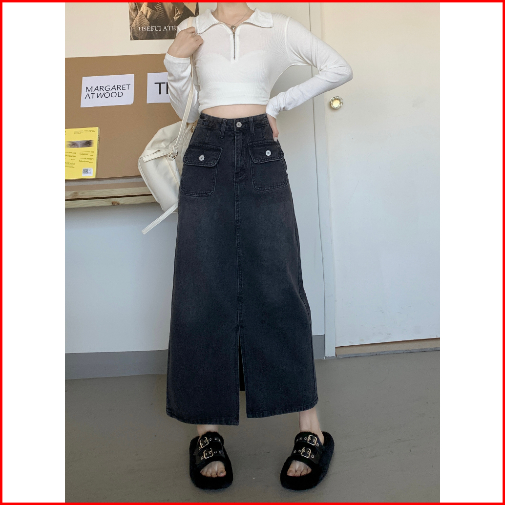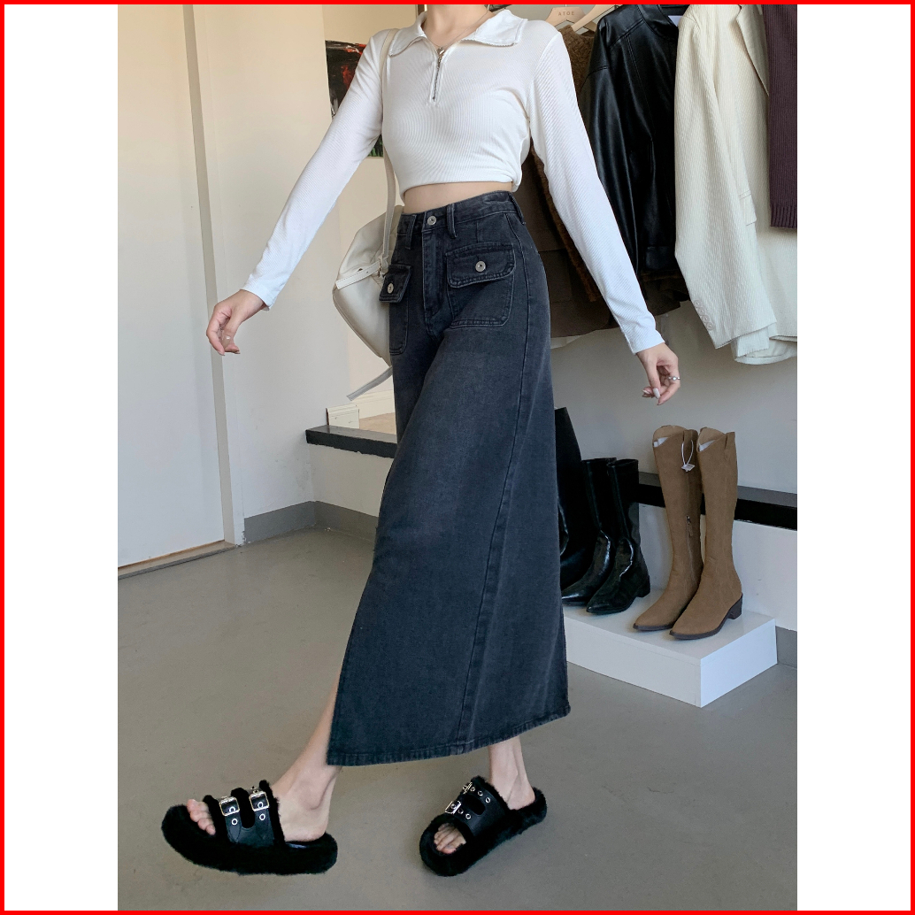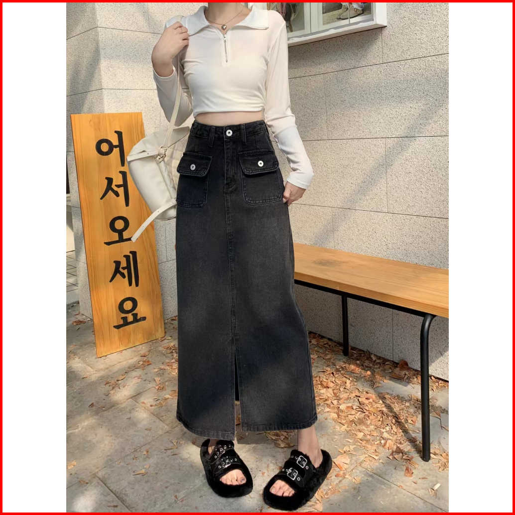 Korean Style Rok Midi Panjang Split Skirt Denim High Waist
