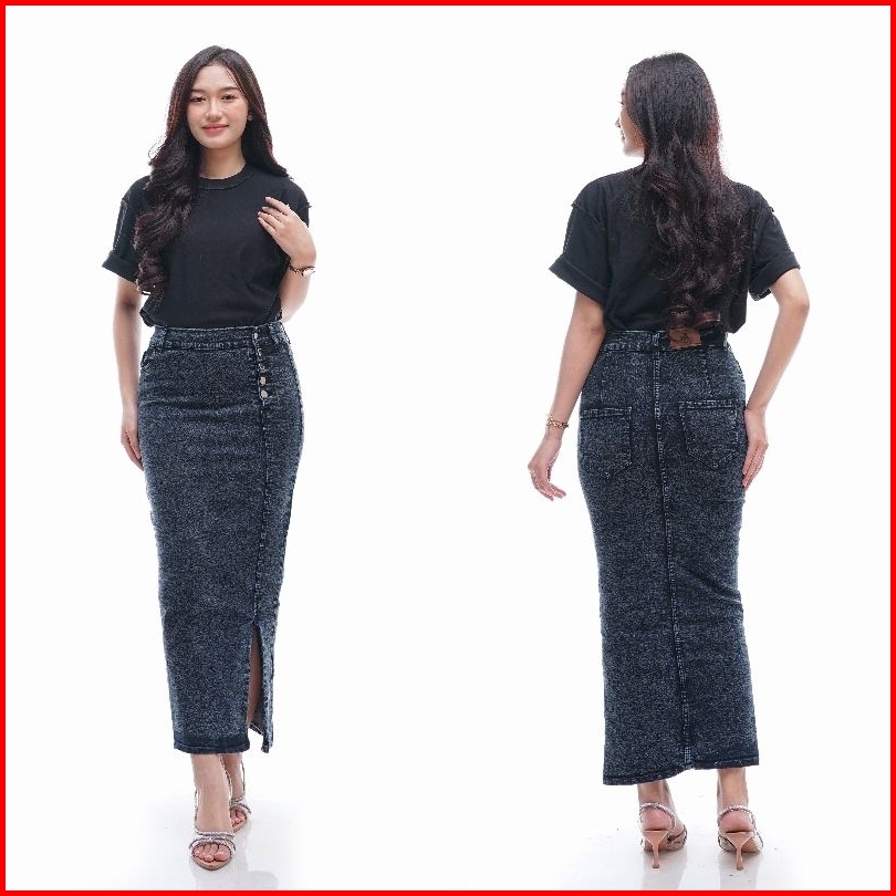Rok Jeans Span Panjang - Rok Denim Skirt Higwaist - Rok Jeans Stretch Style Kancing 5 Belah Depan