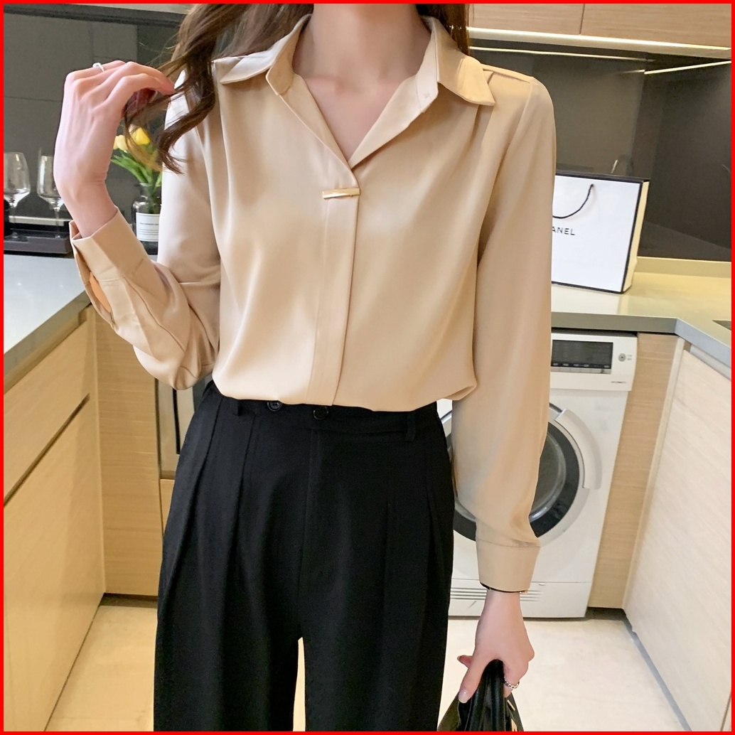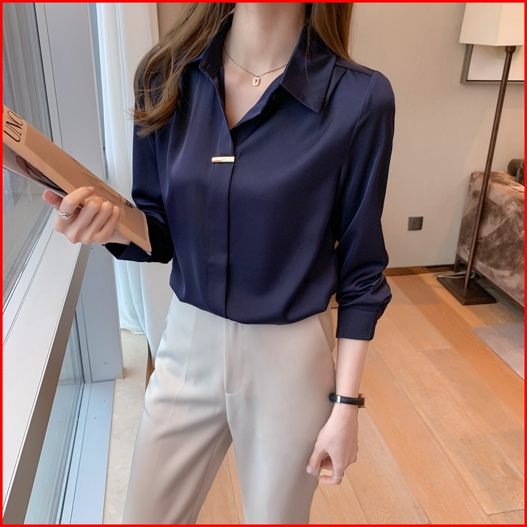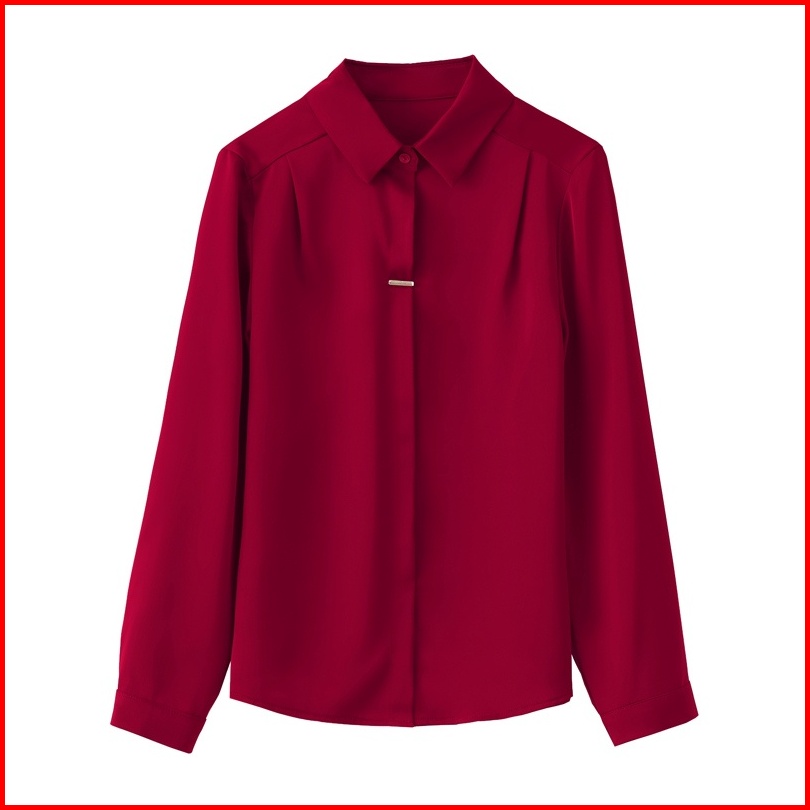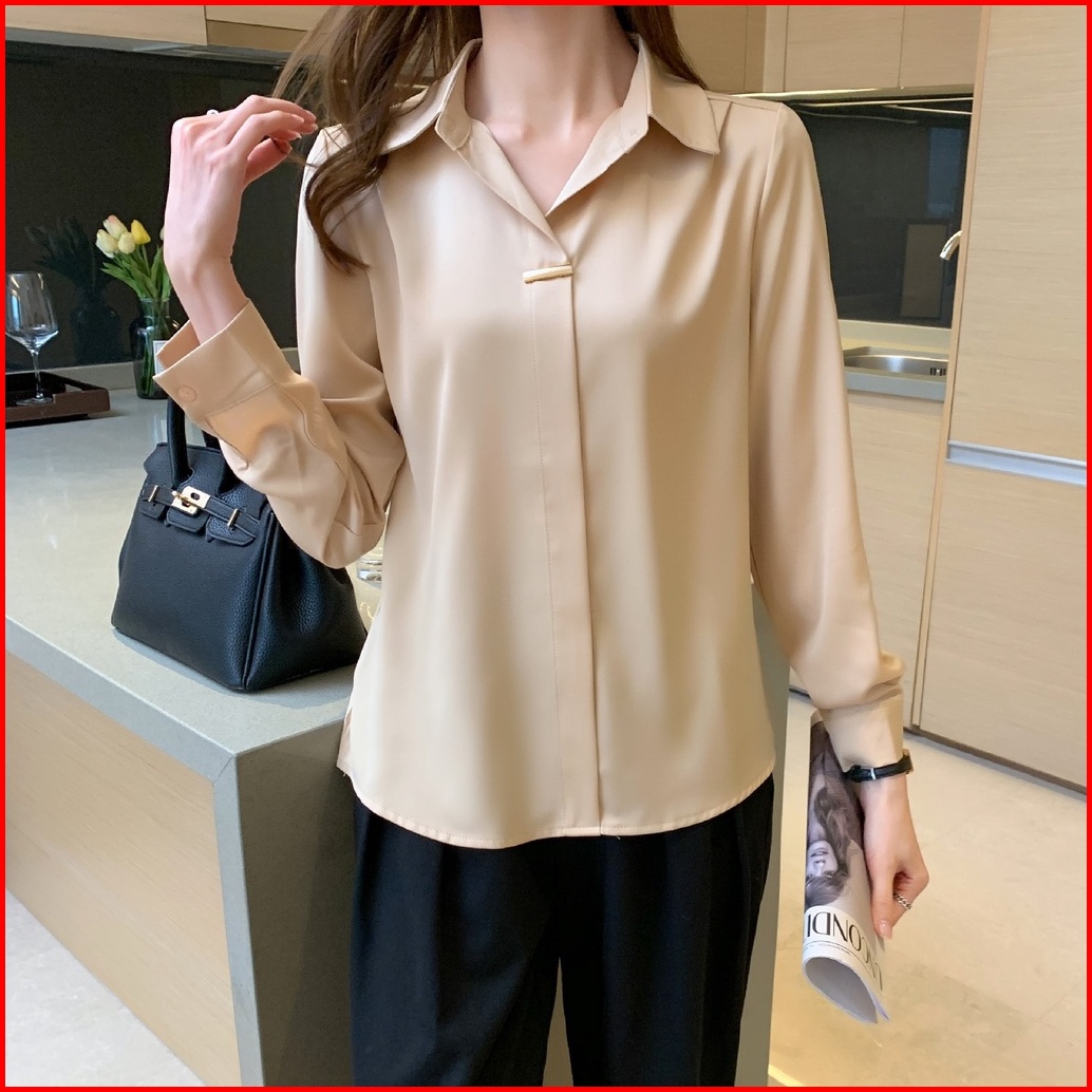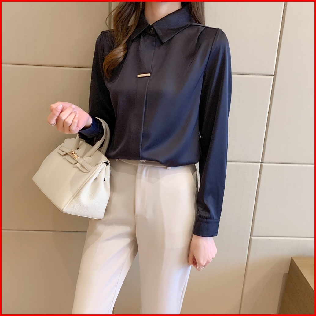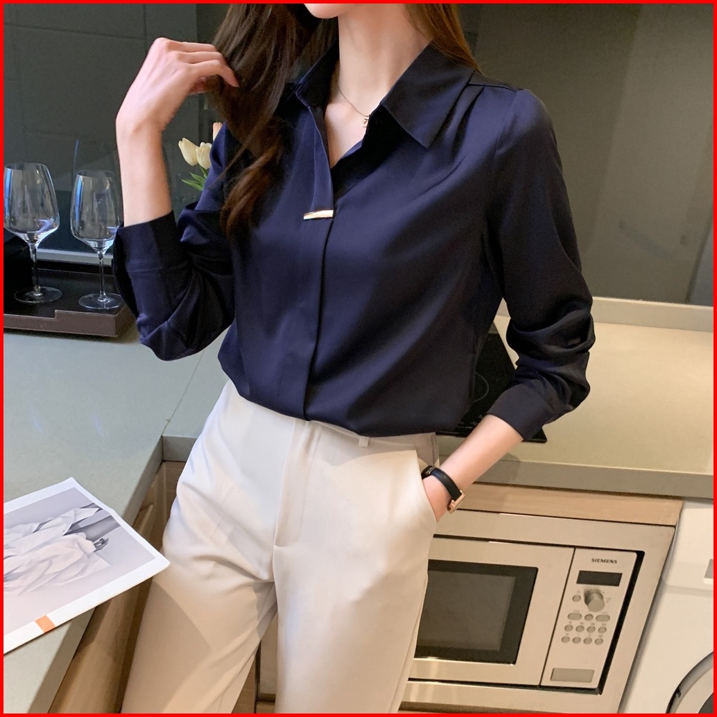 2023 Kain Berkualitas Tinggi Mode Baru Khaki Biru Tua Merah Kemeja Lengan Panjang Wanita Atasan Kasual Kerja Korea
