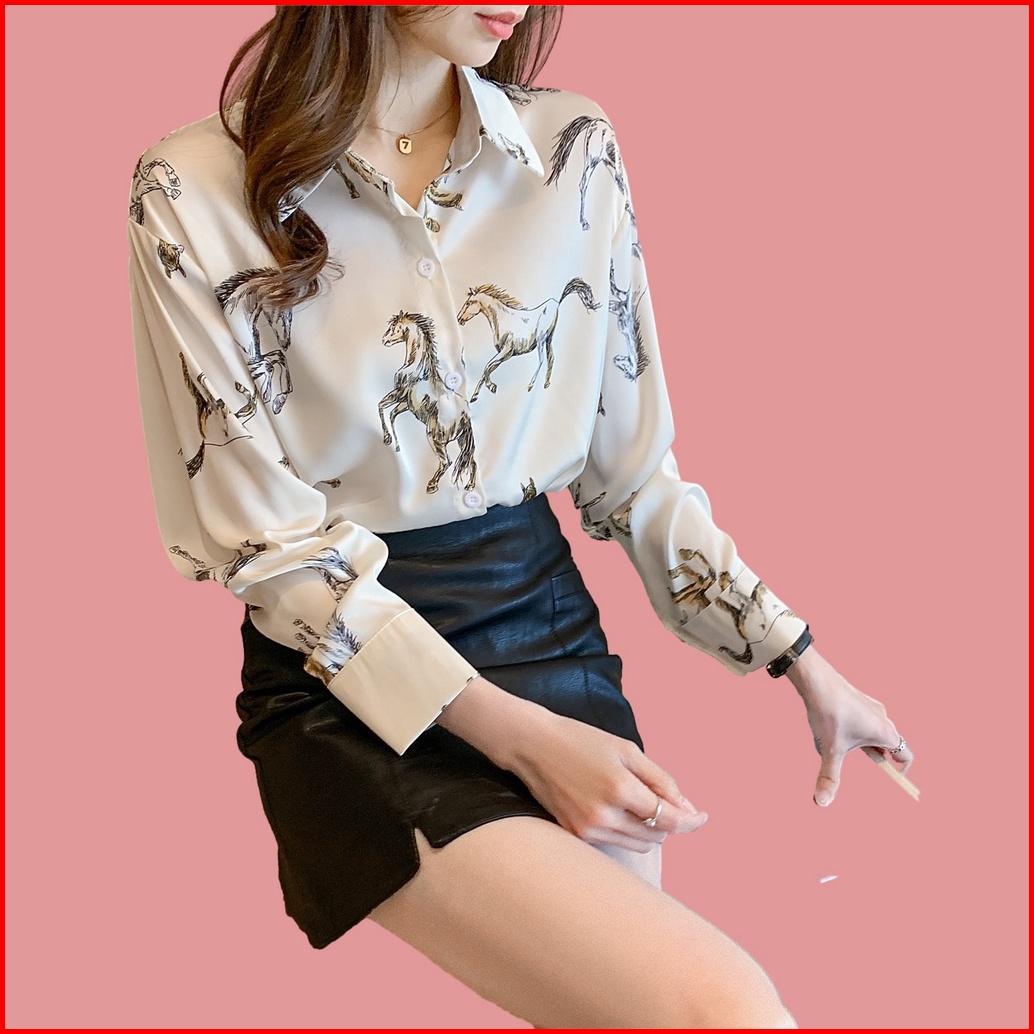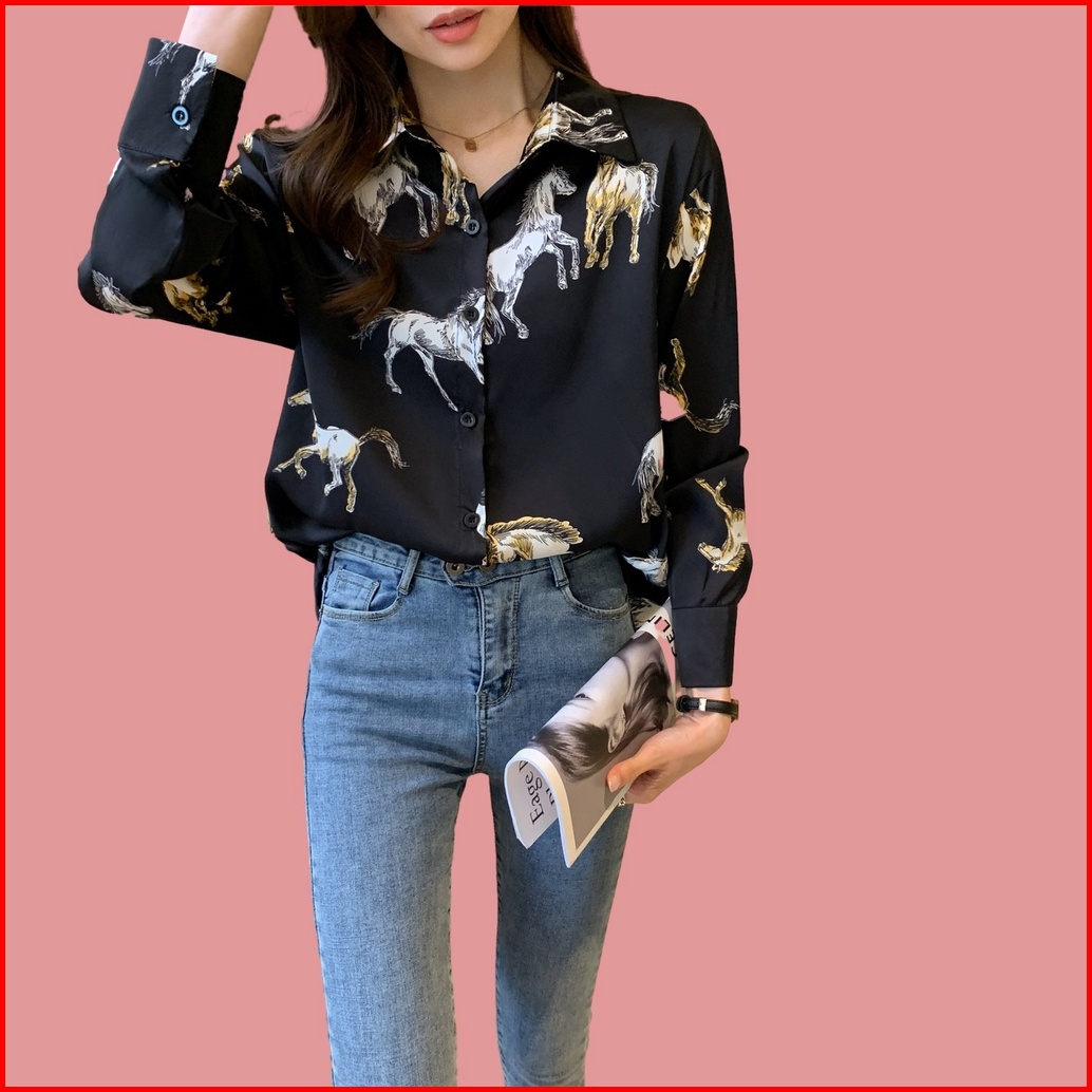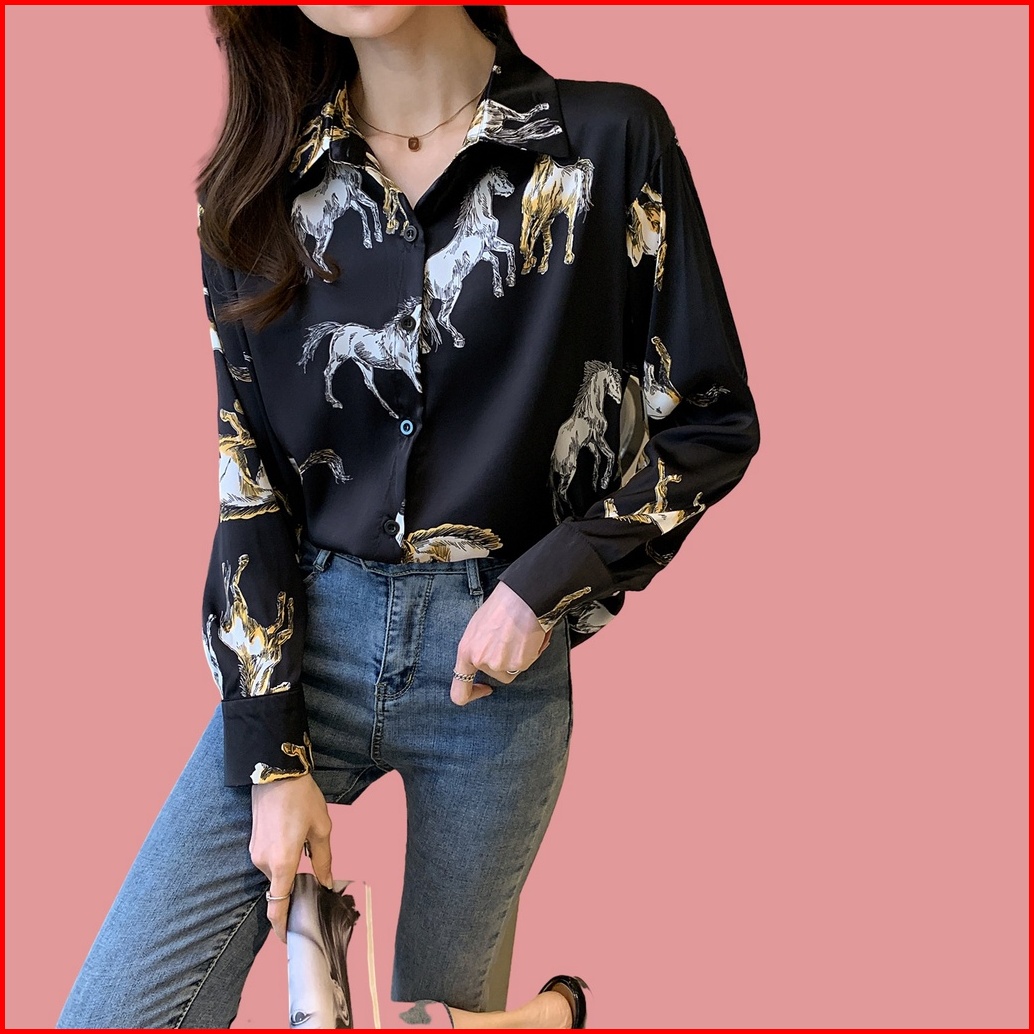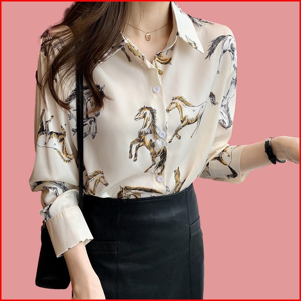 Kain Berkualitas Tinggi Fashion Korea Krem Hitam Cetak Kuda Grafis Kemeja Lengan Panjang Musim Semi Musim Panas Musim Gu